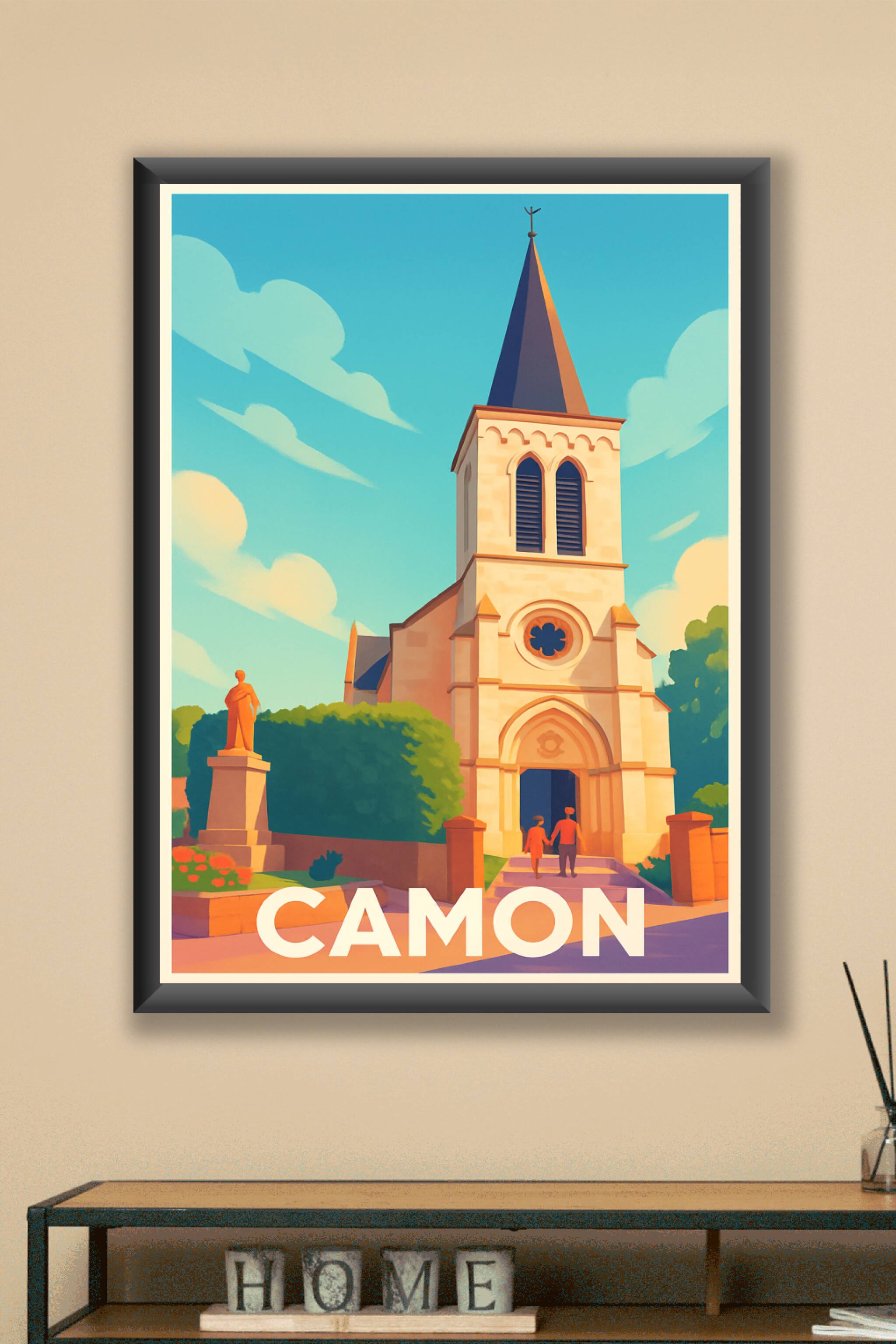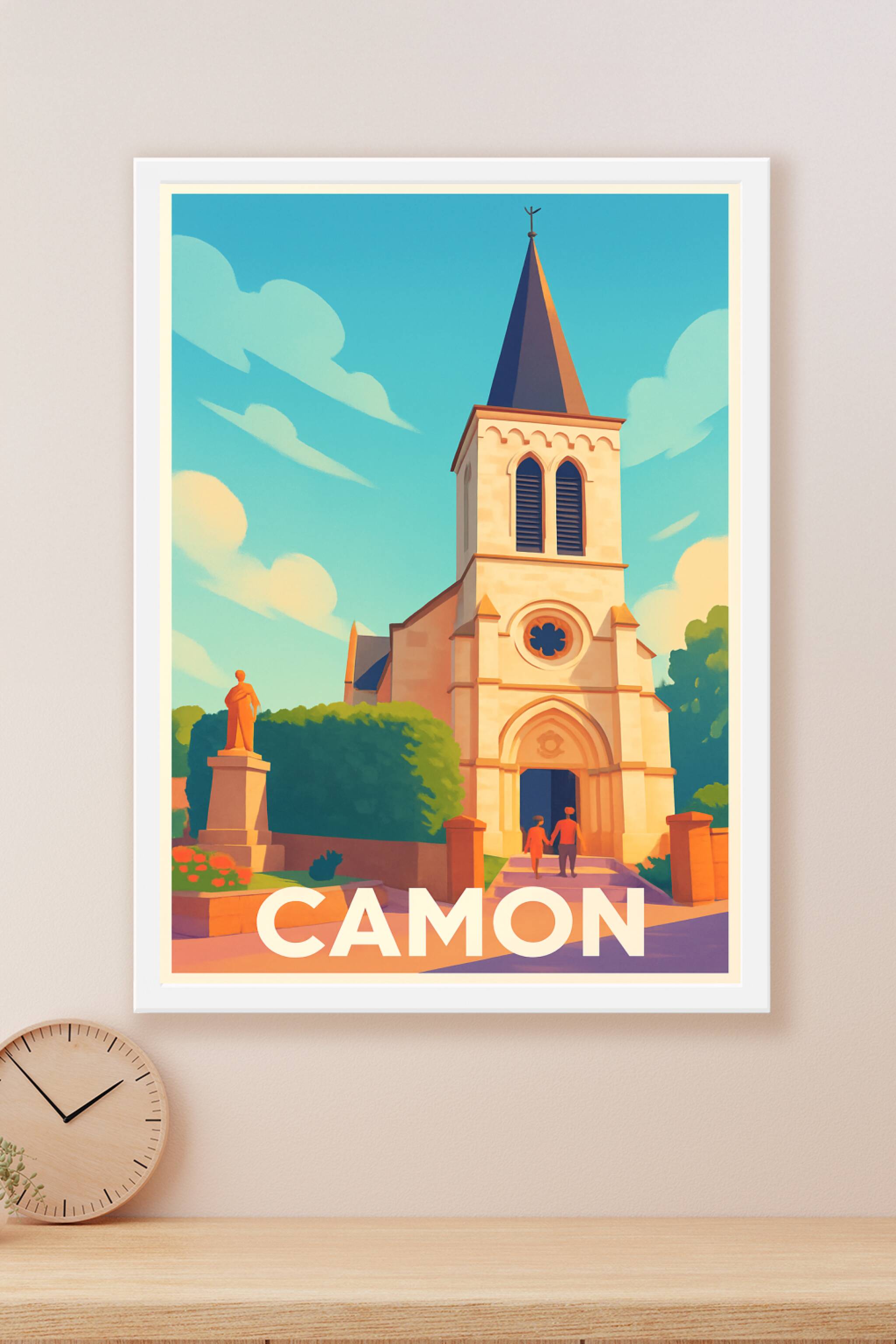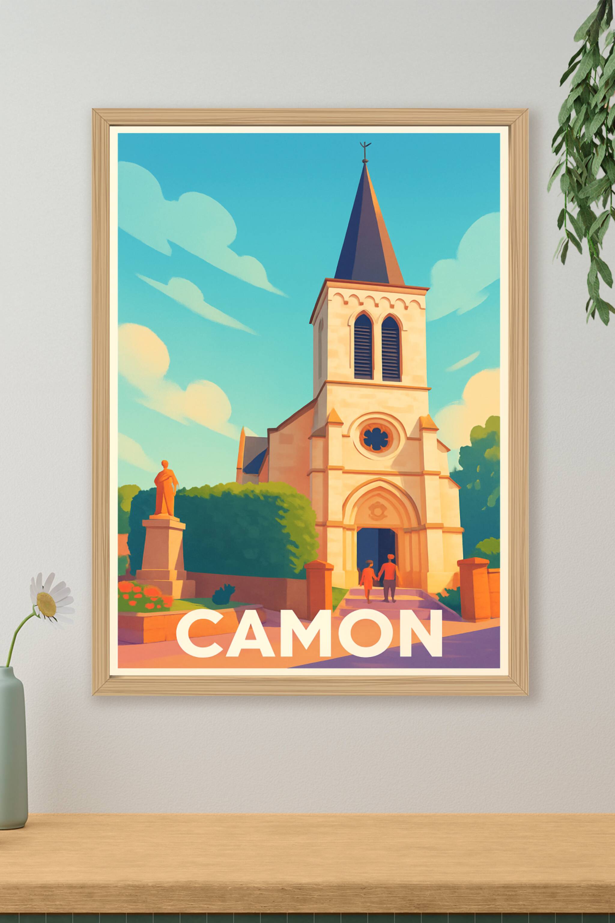 Emportez avec vous la douceur de vivre à Camon grâce à cette affiche illustrée qui met en lumière l'architecture paisible de son église emblématiqu...