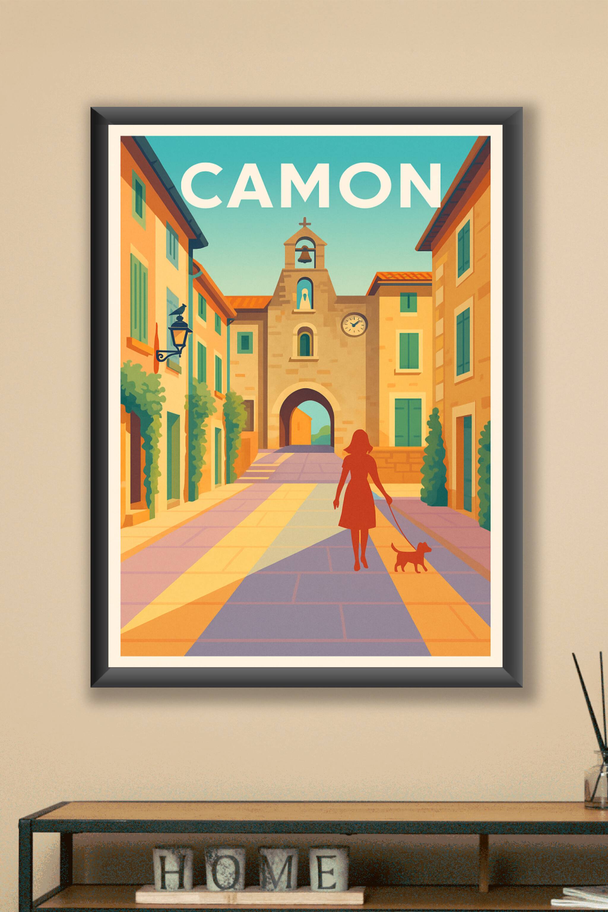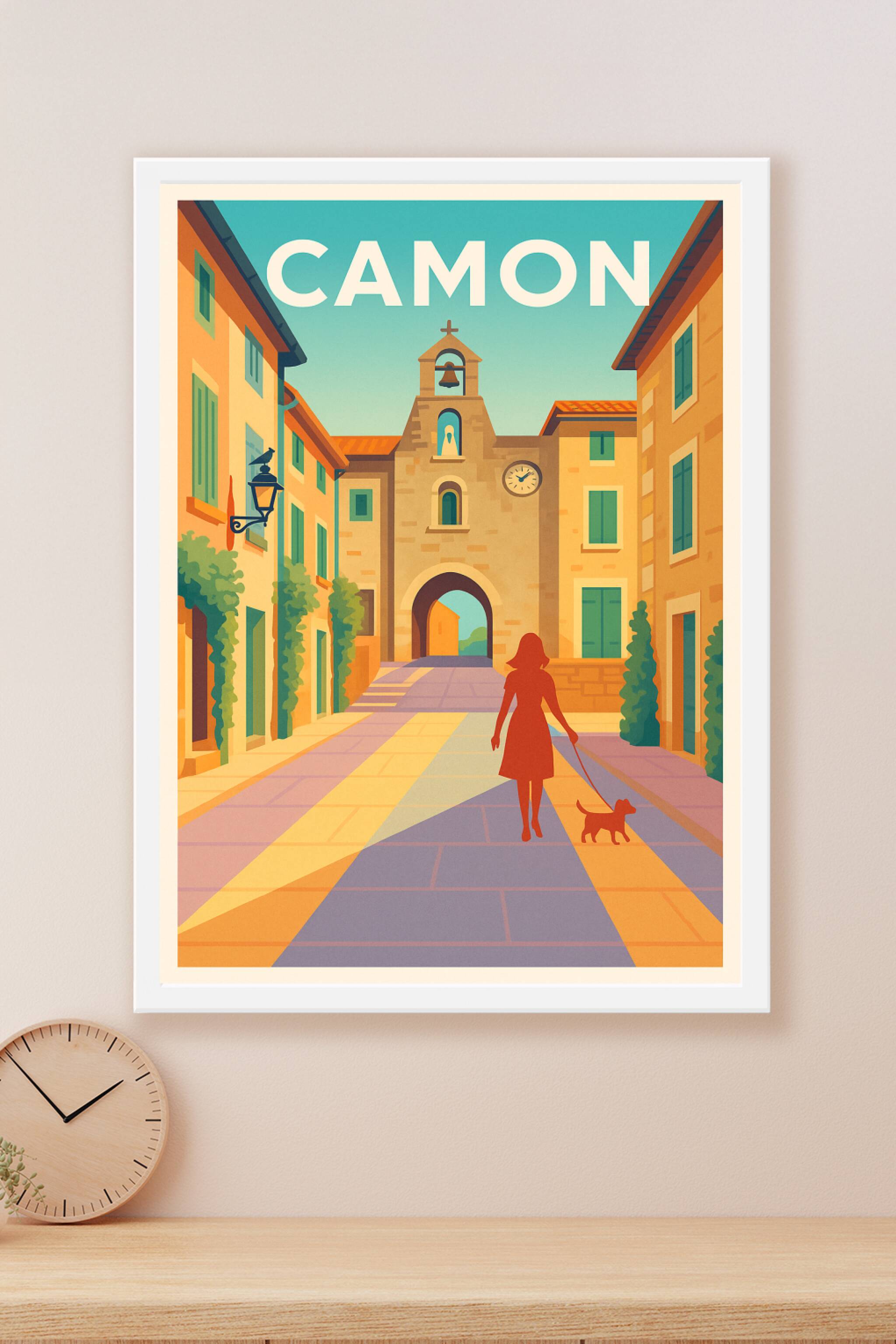 Découvrez la charmante ambiance de Camon avec cette affiche illustrée capturant une promenade paisible sous un ciel éclatant. Cette scène chaleureu...