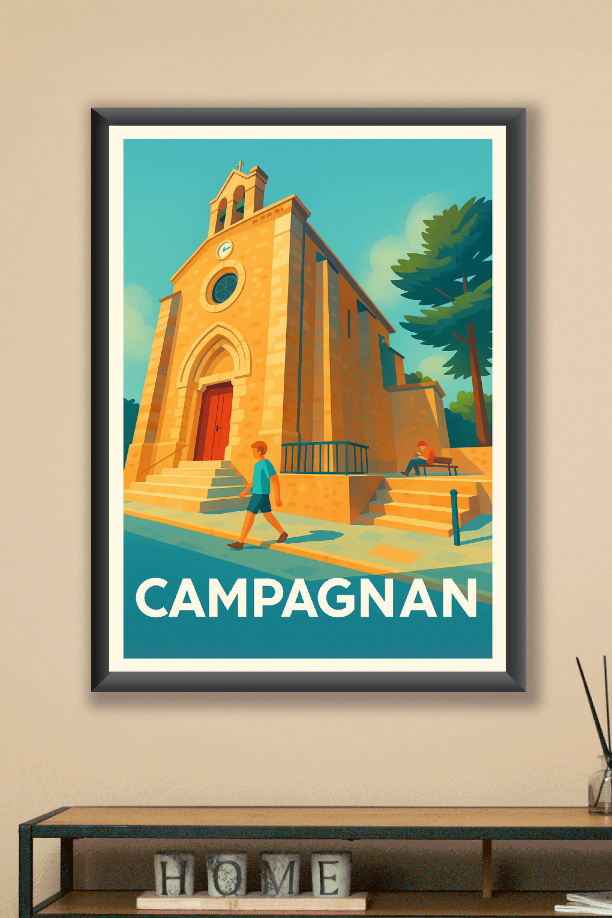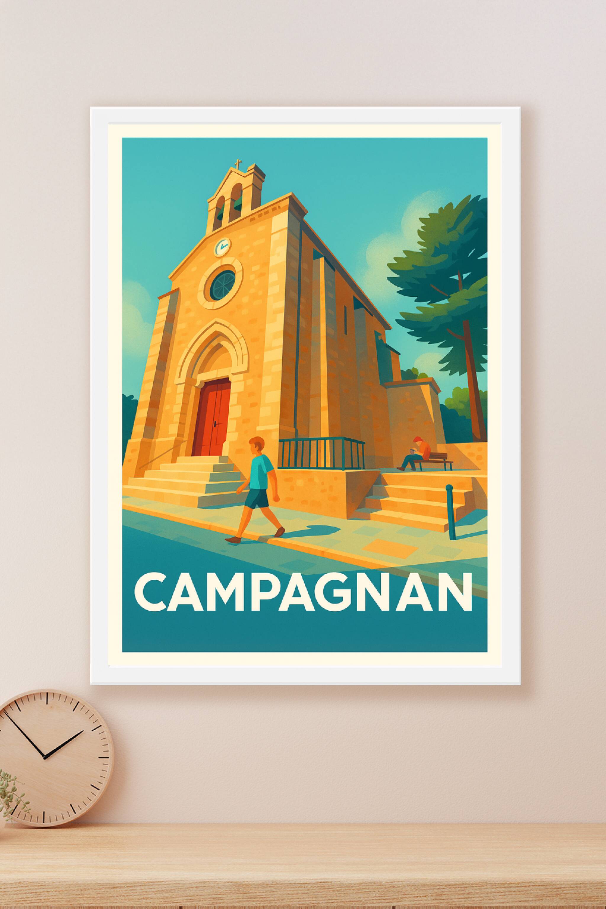 Découvrez l'ambiance paisible et ensoleillée de Campagnan avec cette affiche illustrée mettant en scène son architecture typique. L'église majestue...