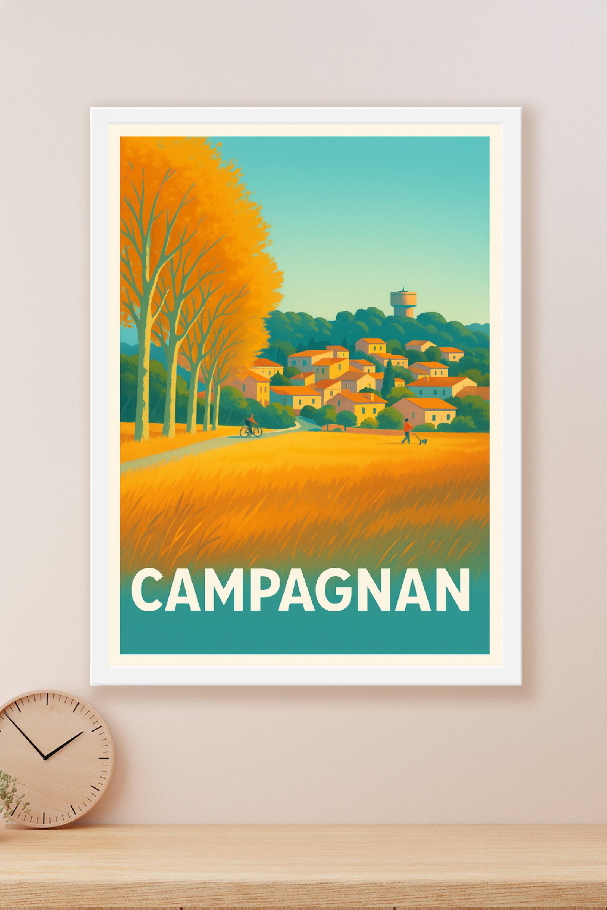 Découvrez l'affiche illustrée de Campagnan, ce village pittoresque baigné par la douce lumière dorée d'un après-midi ensoleillé. L'harmonie des maisons aux toitures orangées et la nature environnante se mêlent pour créer une scène empreinte de sérénité champêtre.Ce poster haut de gamme est imprimé en tirage "Fine Art" sur papier 305g coton, garantissant une qualité d'impression remarquable et une longévité exceptionnelle. Disponible en formats A1 à A4, avec ou sans cadre, il s'adapte parfaitement à tout type d'intérieur, pour apporter chaleur et authenticité à votre décoration.Plus qu'une simple affiche, c'est une invitation au voyage et à la douceur de vivre dans la campagne française, sublimée par un savoir-faire 100% français.