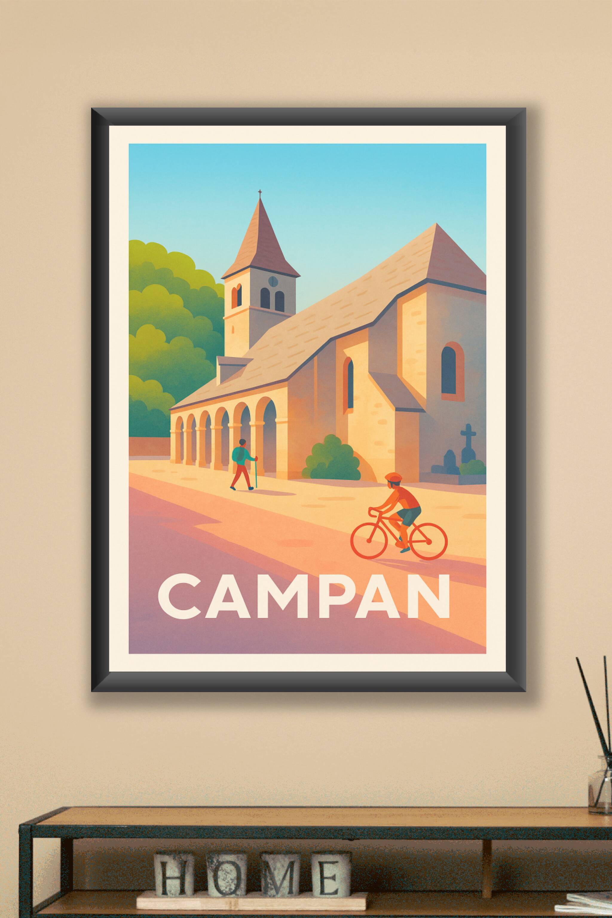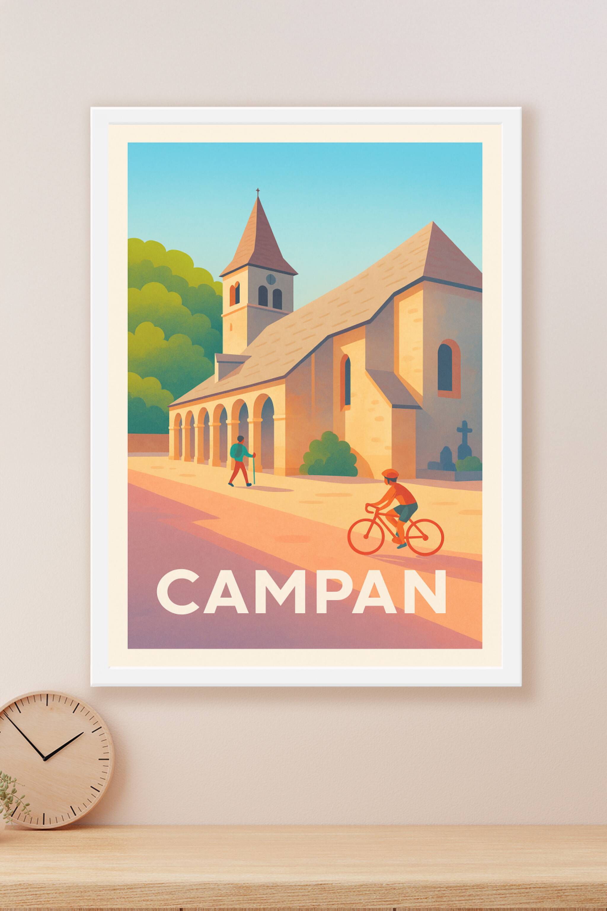 Découvrez l'atmosphère paisible de Campan à travers ce poster illustré aux teintes chaudes et nuancées, mettant en avant une église typique du vill...