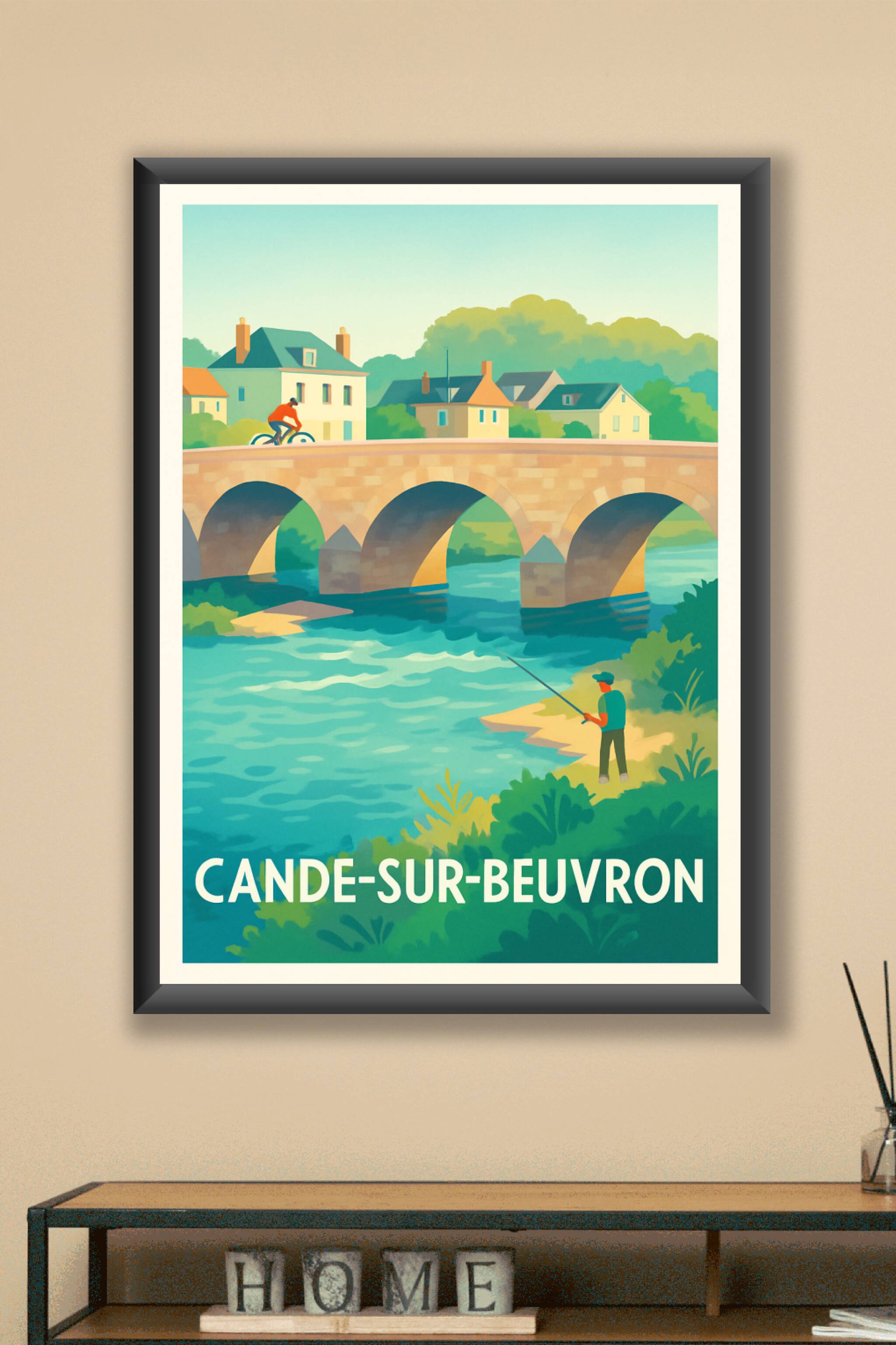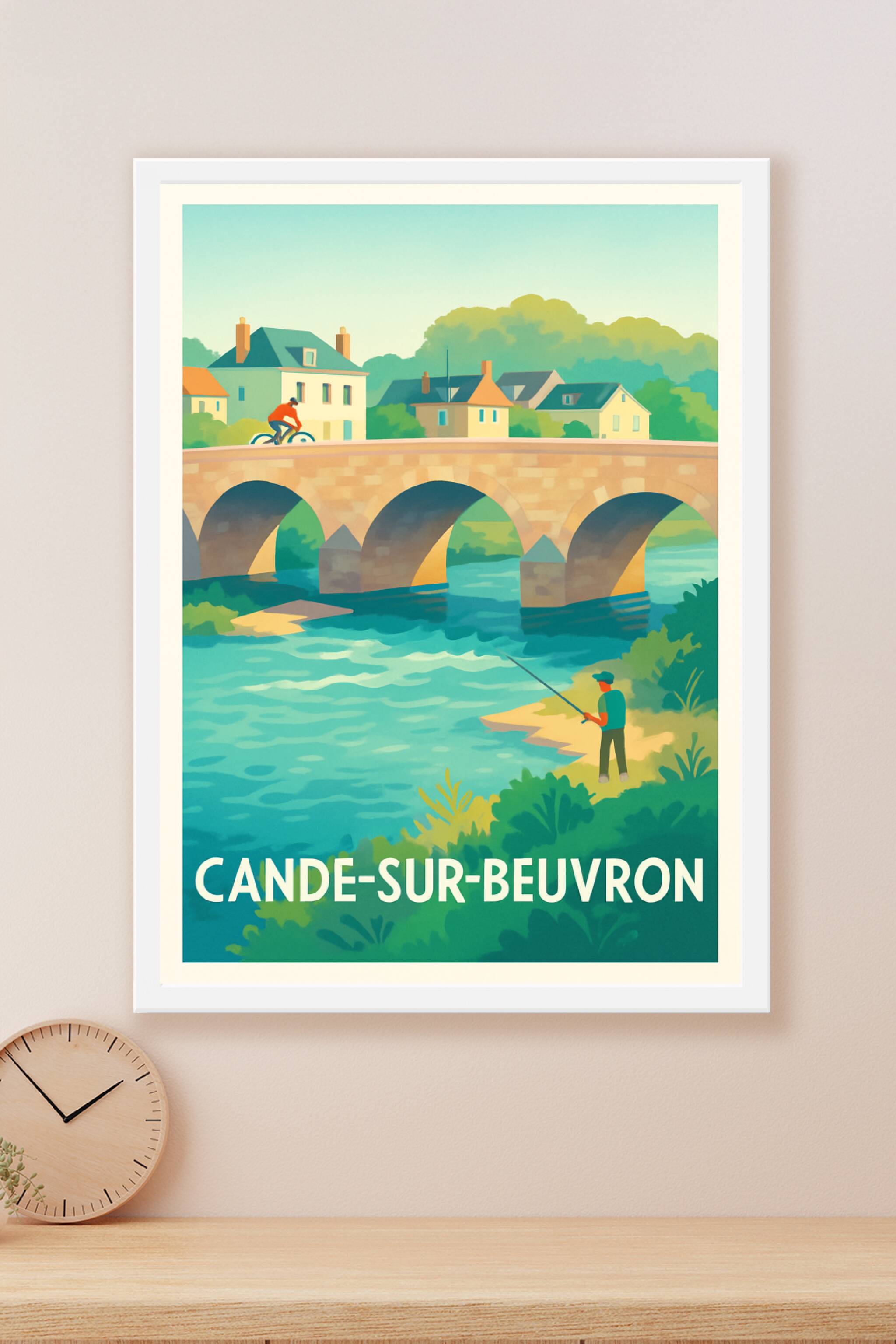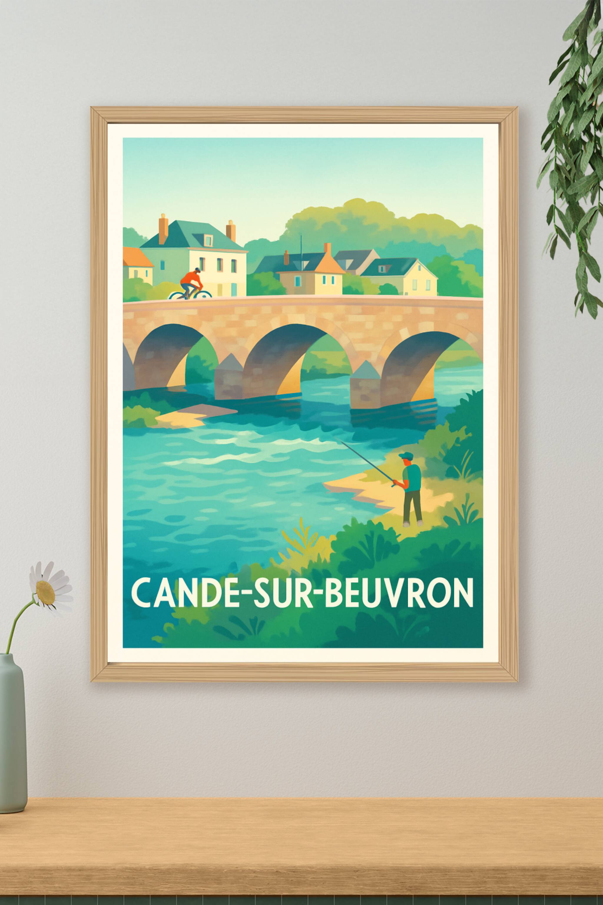 Découvrez la douceur de vivre à Cande-sur-Beuvron avec cette affiche vintage illustrant un paysage bucolique où un pêcheur profite de la rivière so...