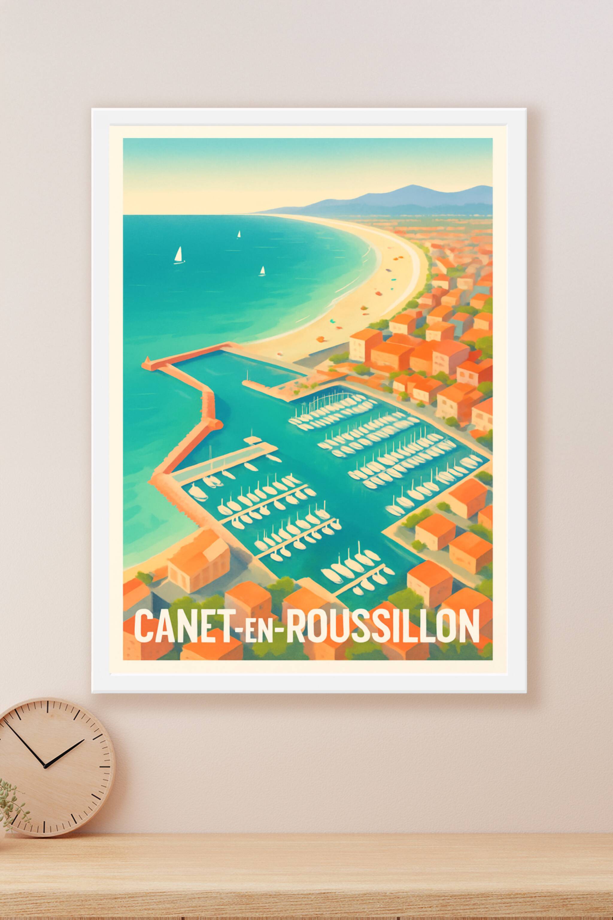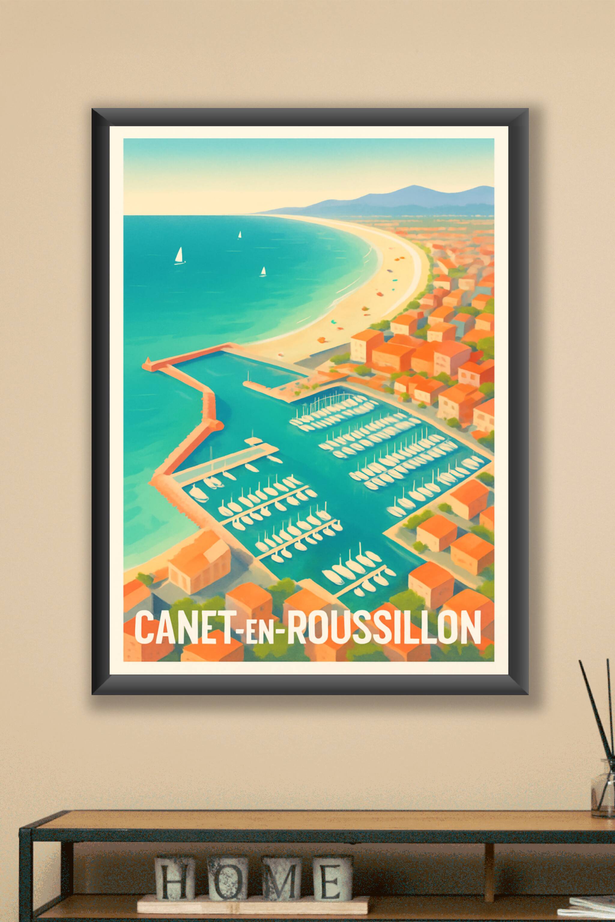 Découvrez la douceur de vivre de Canet-en-Roussillon à travers cette affiche rétro illustrant son port de plaisance animé et ses plages dorées qui ...