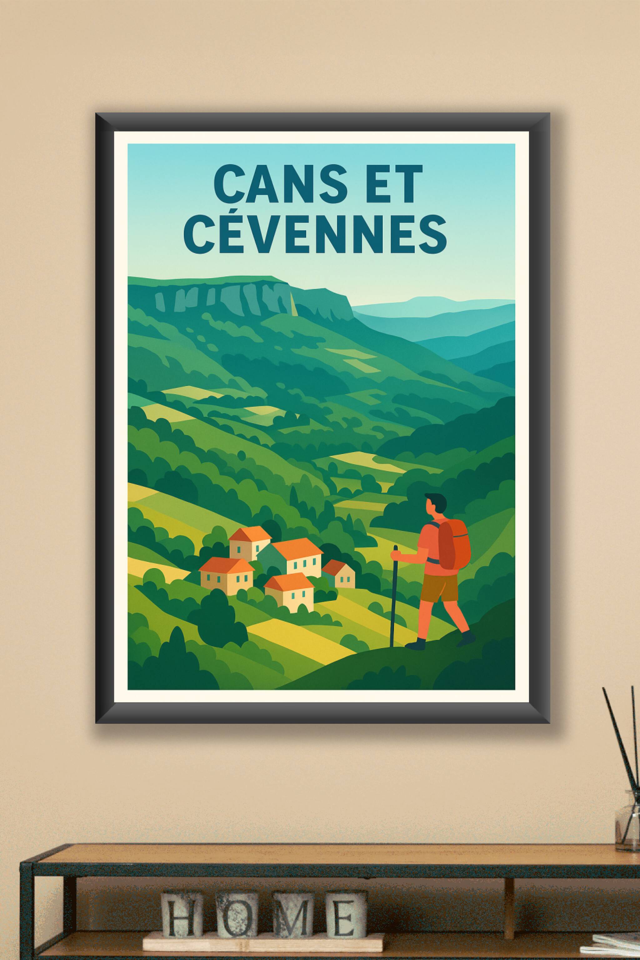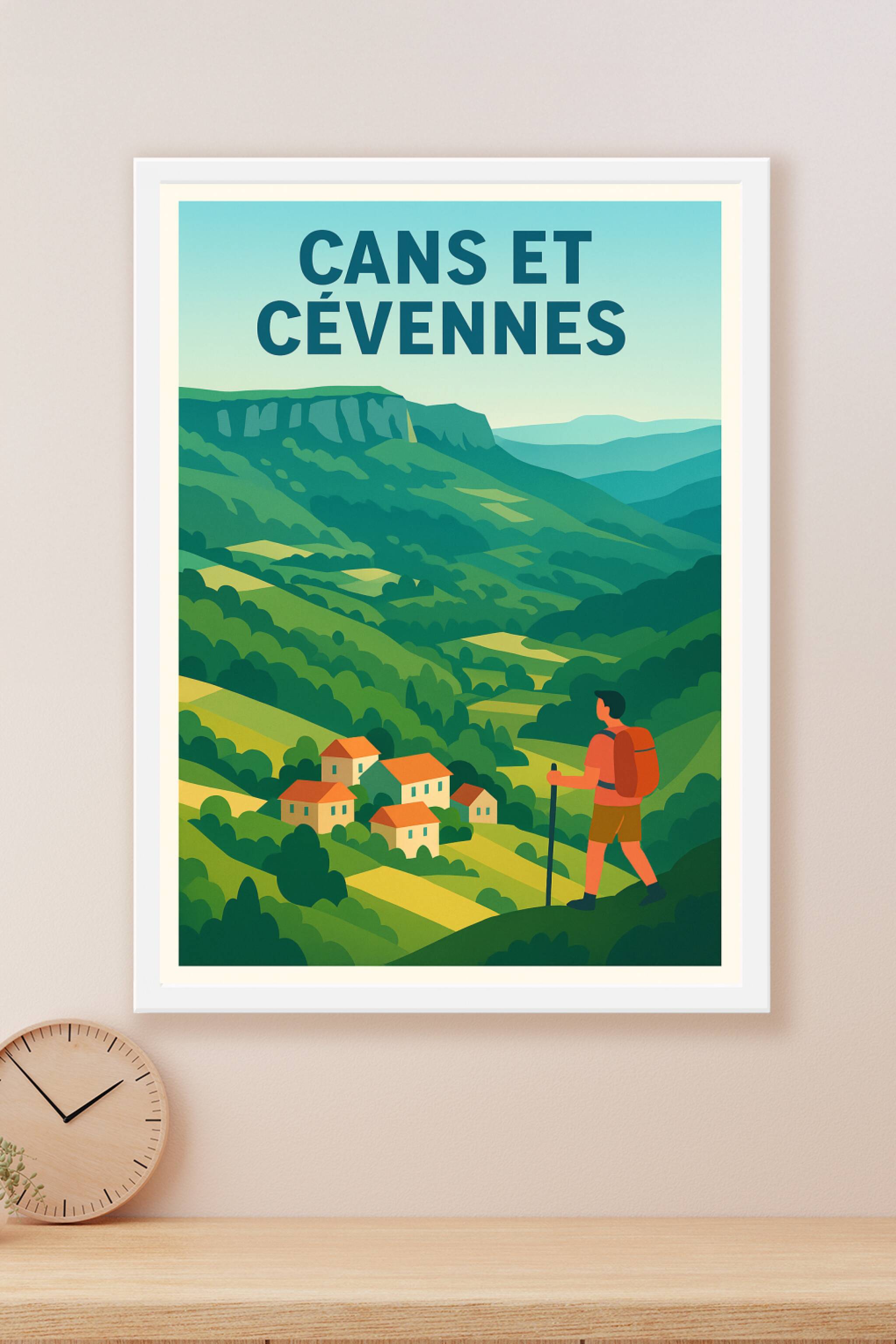 Découvrez la beauté sauvage et paisible des Cévennes et de Çans avec cette affiche illustrée au design épuré et coloré. Ce poster met en scène un randonneur contemplant un paysage de vallées verdoyantes et de petites maisons traditionnelles, idéal pour les amoureux de la nature et des escapades en plein air. Imprimé en tirage "Fine Art" sur papier 305g coton, il offre une qualité d'impression exceptionnelle avec des couleurs vibrantes et une durabilité remarquable. Disponible en formats A1 à A4, avec ou sans cadre, cette affiche apportera une touche d'évasion et de sérénité à votre intérieur. Fabriqué en France, ce poster est parfait pour embellir votre décoration ou offrir un cadeau raffiné aux passionnés de randonnée et de paysages naturels.