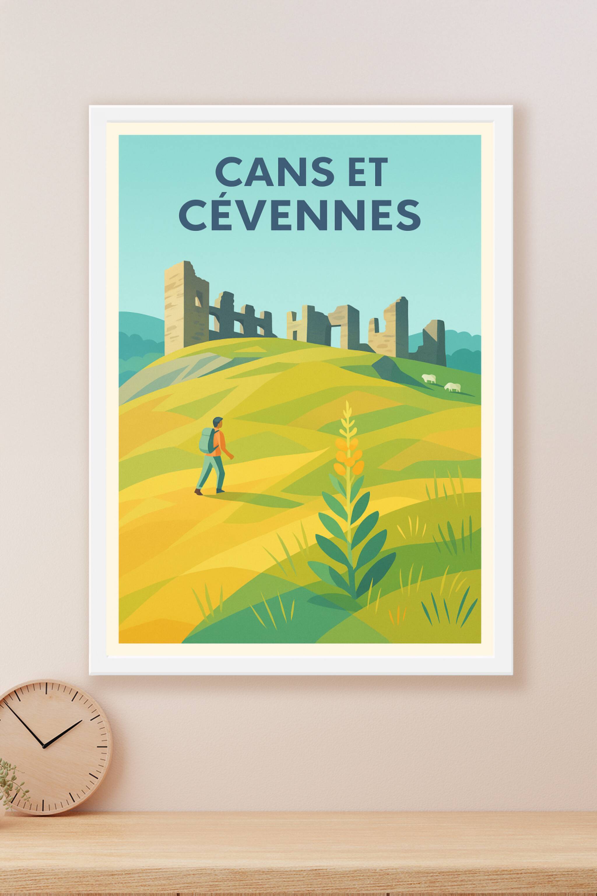 Découvrez la sérénité des paysages vallonnés de Cans et des Cévennes avec cette affiche illustrée aux couleurs douces et apaisantes. Cette scène représente un randonneur explorant les ruines emblématiques nichées au sommet d'un paysage verdoyant, symbole d'aventure et de nature sauvage.Ce poster est disponible en tirage "Fine Art" sur papier 305g coton, garantissant une qualité d'impression exceptionnelle et des couleurs éclatantes. Proposé en formats A1 à A4, avec ou sans cadre, il s'intègre parfaitement à toutes les ambiances pour sublimer votre décoration intérieure.Offrez-vous un souvenir authentique ou un cadeau unique grâce à ce tirage premium 100% fabriqué en France.