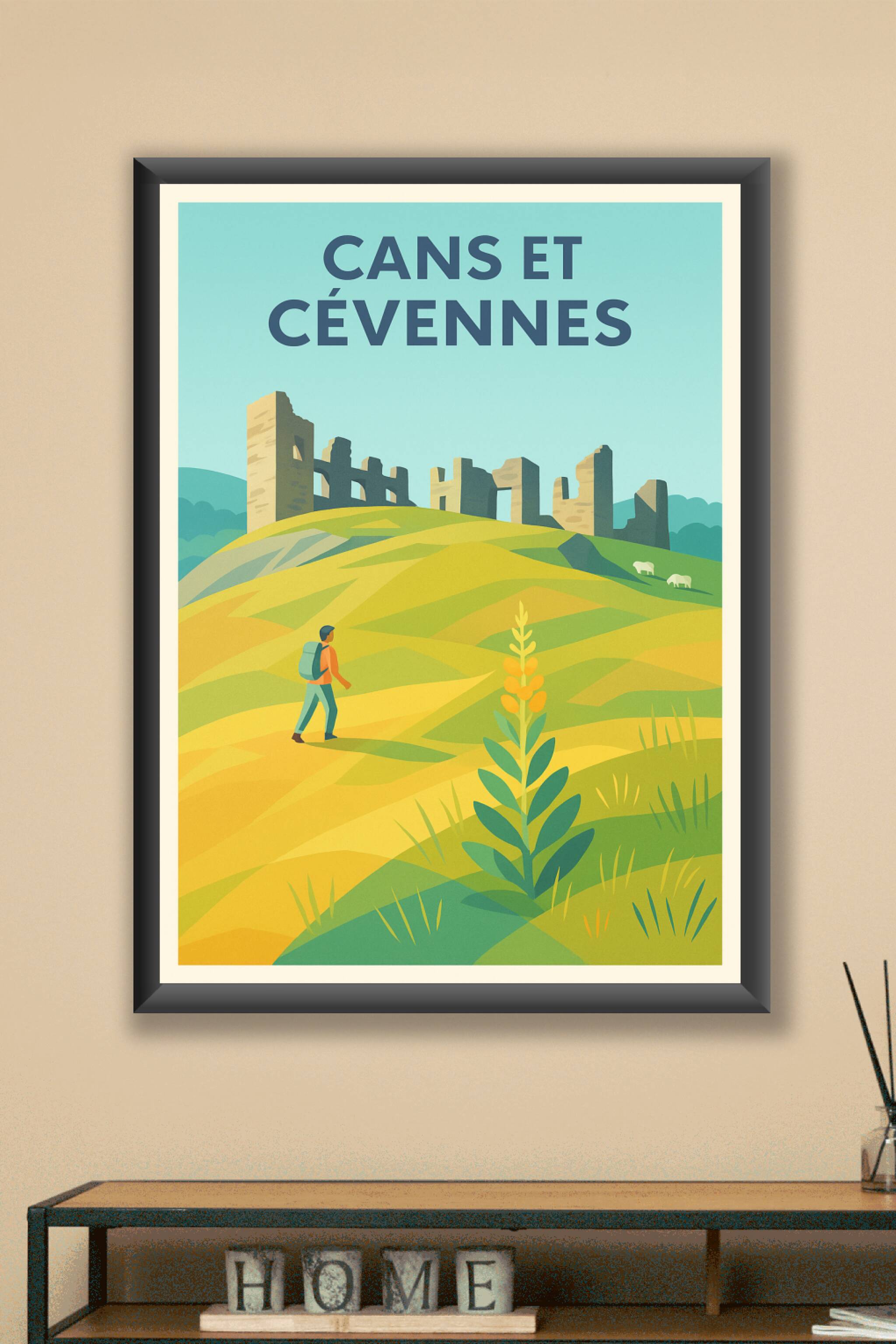 Découvrez la sérénité des paysages vallonnés de Cans et des Cévennes avec cette affiche illustrée aux couleurs douces et apaisantes. Cette scène re...