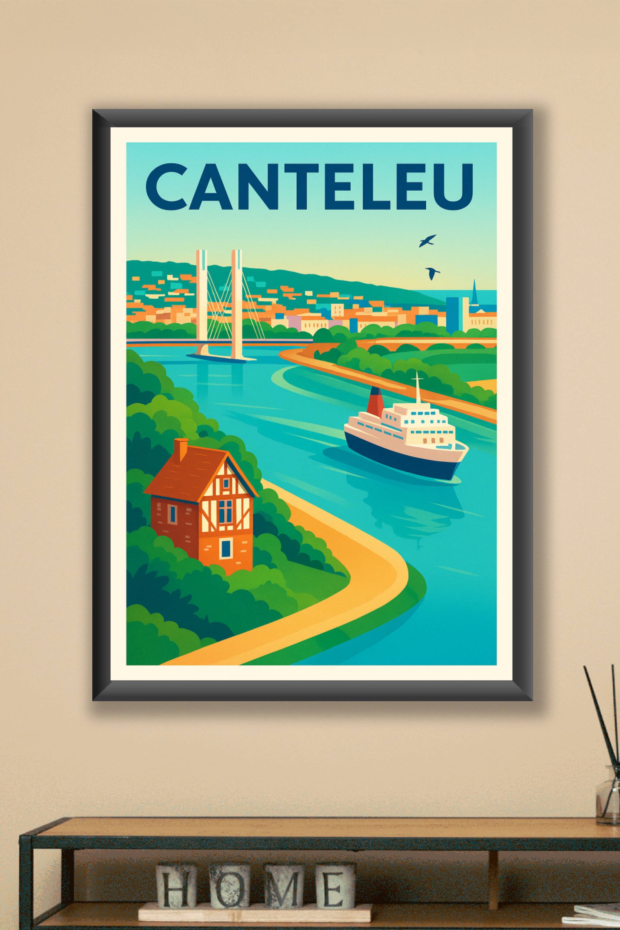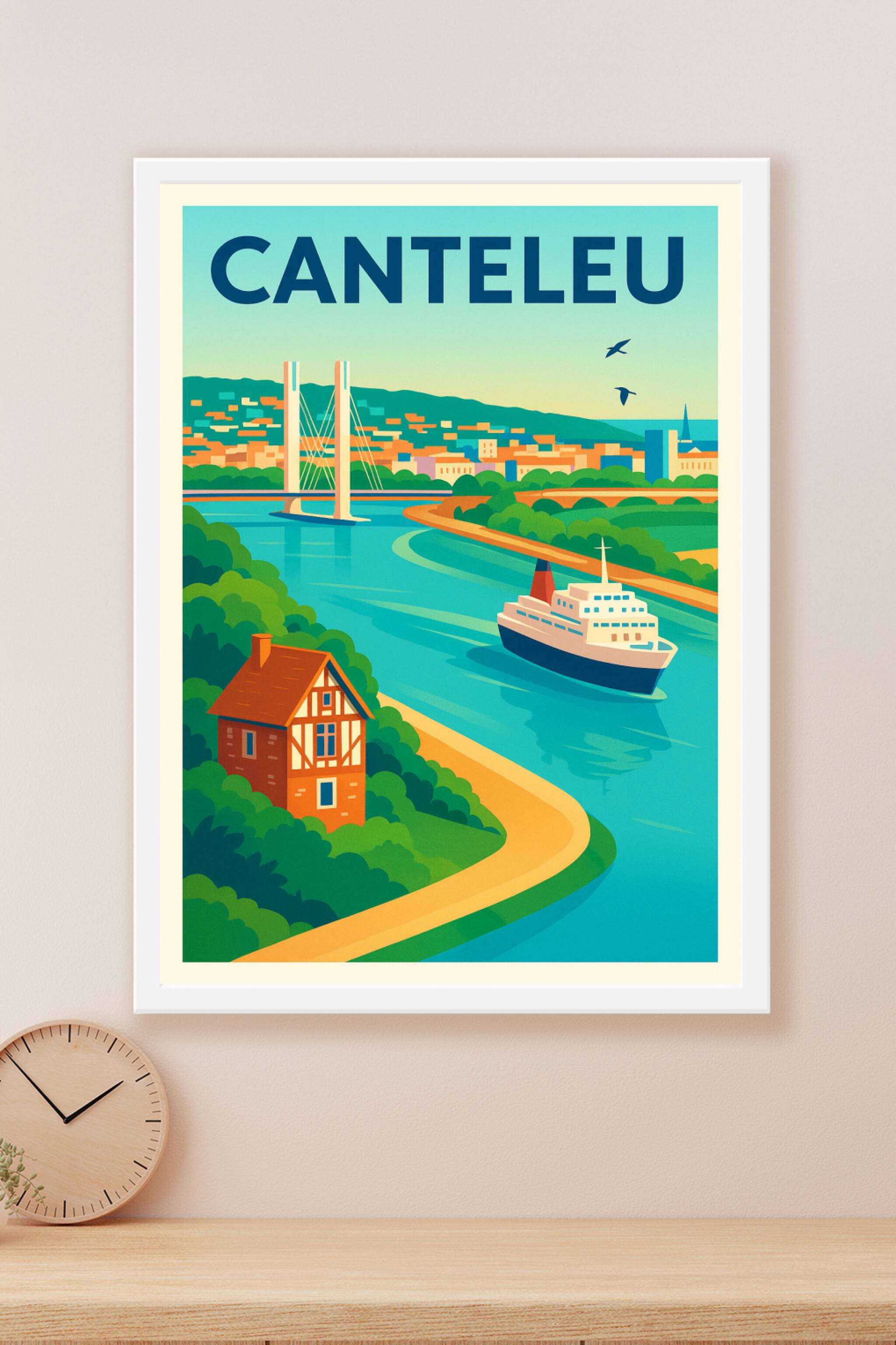 Découvrez Canteleu à travers cette affiche au style graphique et coloré mettant en avant la ville et son paysage fluvial, entre nature verdoyante e...