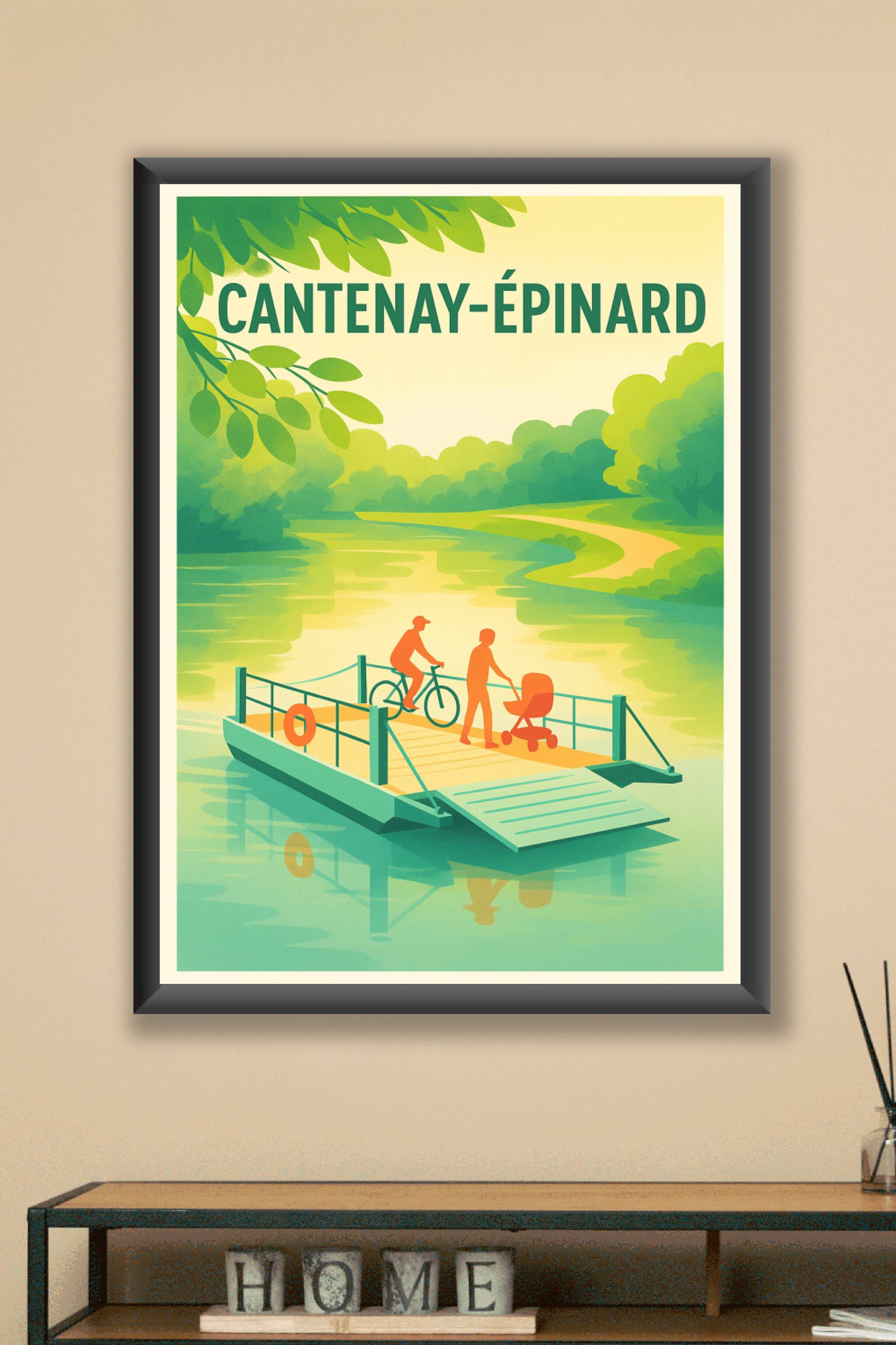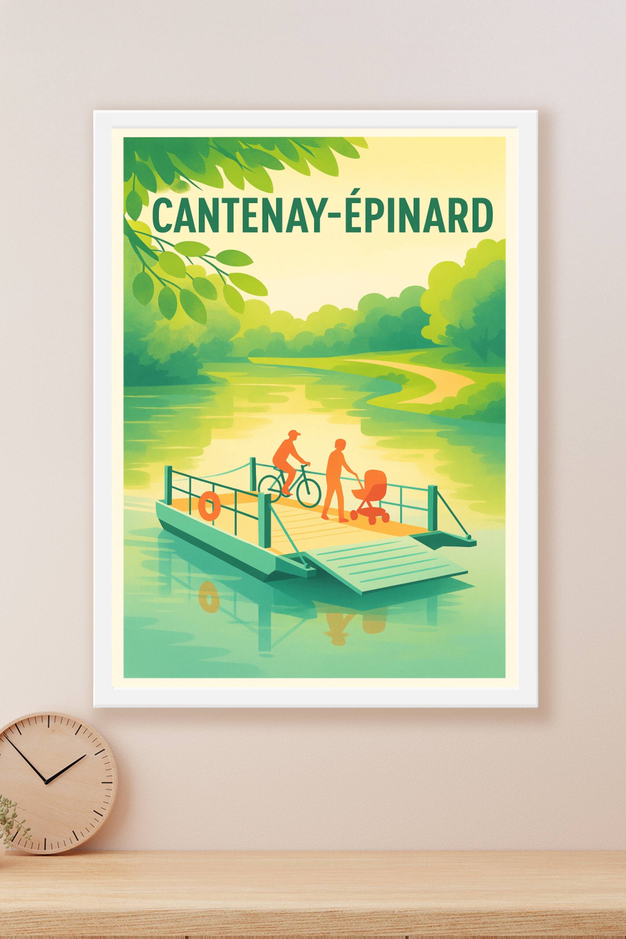 Découvrez la douceur de vivre à Cantenay-Épinard avec cette affiche illustrée mettant en scène un moment paisible au bord de l'eau, où un cycliste ...