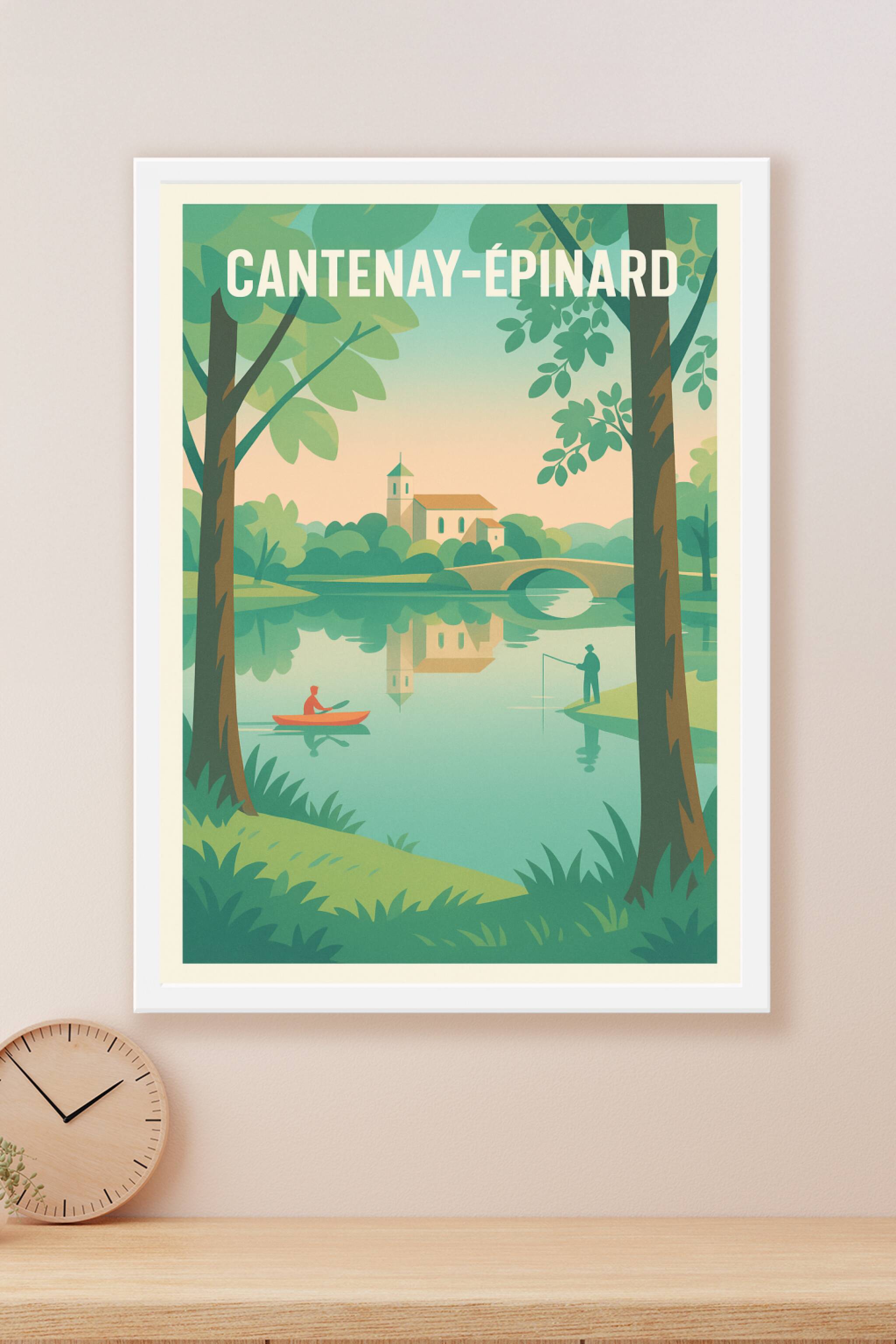 Découvrez la sérénité paisible de Cantenay-Épinard avec cette affiche illustrée au style doux et vintage, mettant en scène un paysage bucolique au bord de l'eau, où un pêcheur et un kayakiste profitent d'un instant calme. Ce poster invite à l'évasion et à la contemplation d'une nature harmonieuse et reposante. Imprimé en tirage "Fine Art" sur un papier de qualité 305g coton, cette affiche bénéficie d'une finition premium pour une reproduction fidèle des couleurs et des détails. Disponible en plusieurs formats du A1 au A4, avec ou sans cadre, elle s'intègre parfaitement à votre décoration intérieure, apportant une touche d'authenticité et de charme. Profitez d'une impression 100% française pour offrir ou vous offrir un souvenir élégant et durable de Cantenay-Épinard.