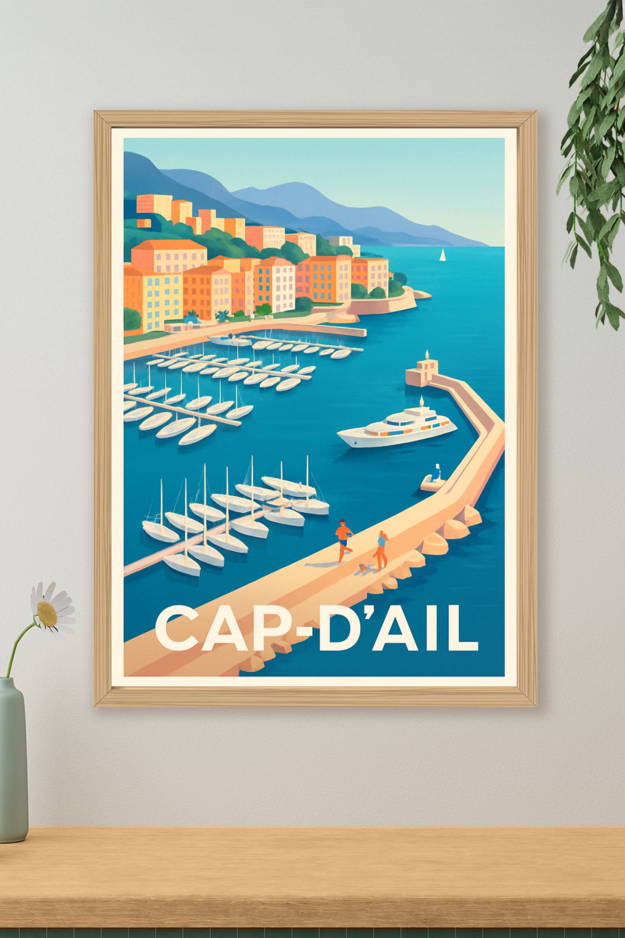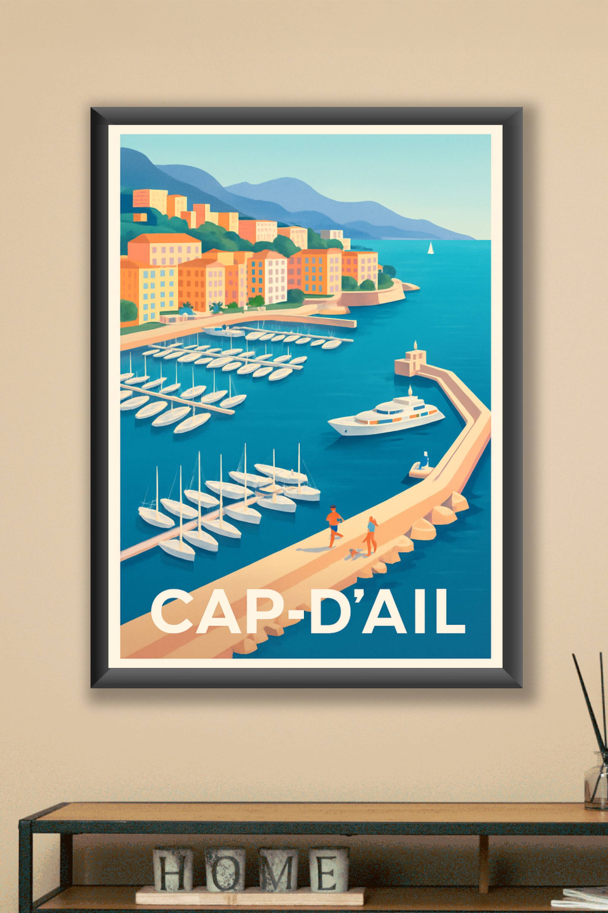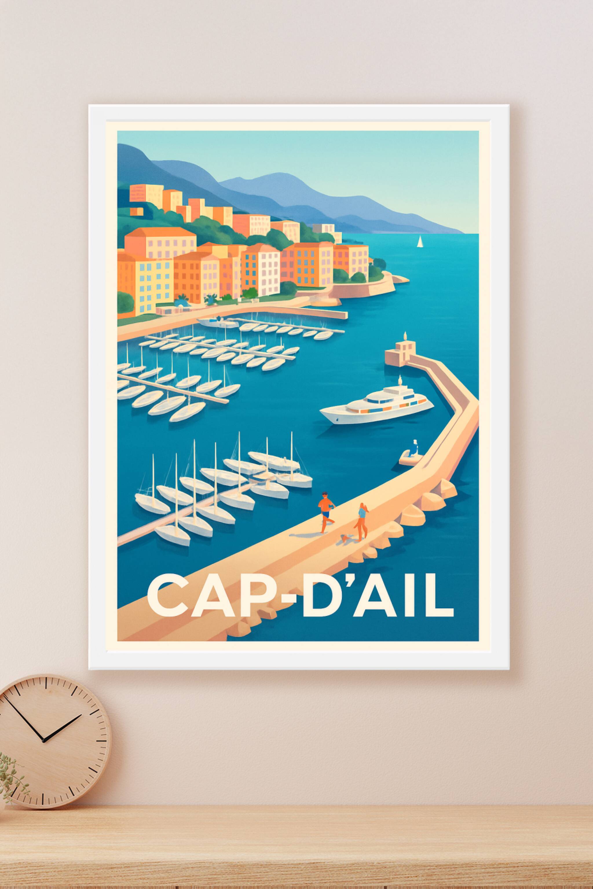 Découvrez la douceur méditerranéenne avec cette superbe affiche illustrant le charmant port de Cap-d'Ail et ses eaux limpides. Ce poster, aux coule...