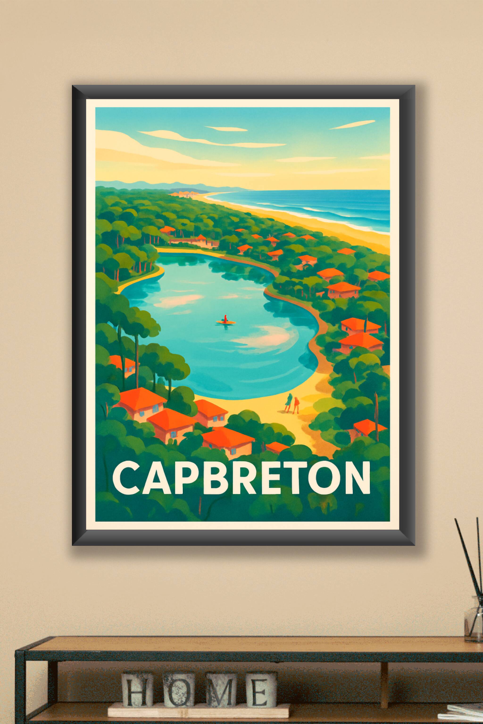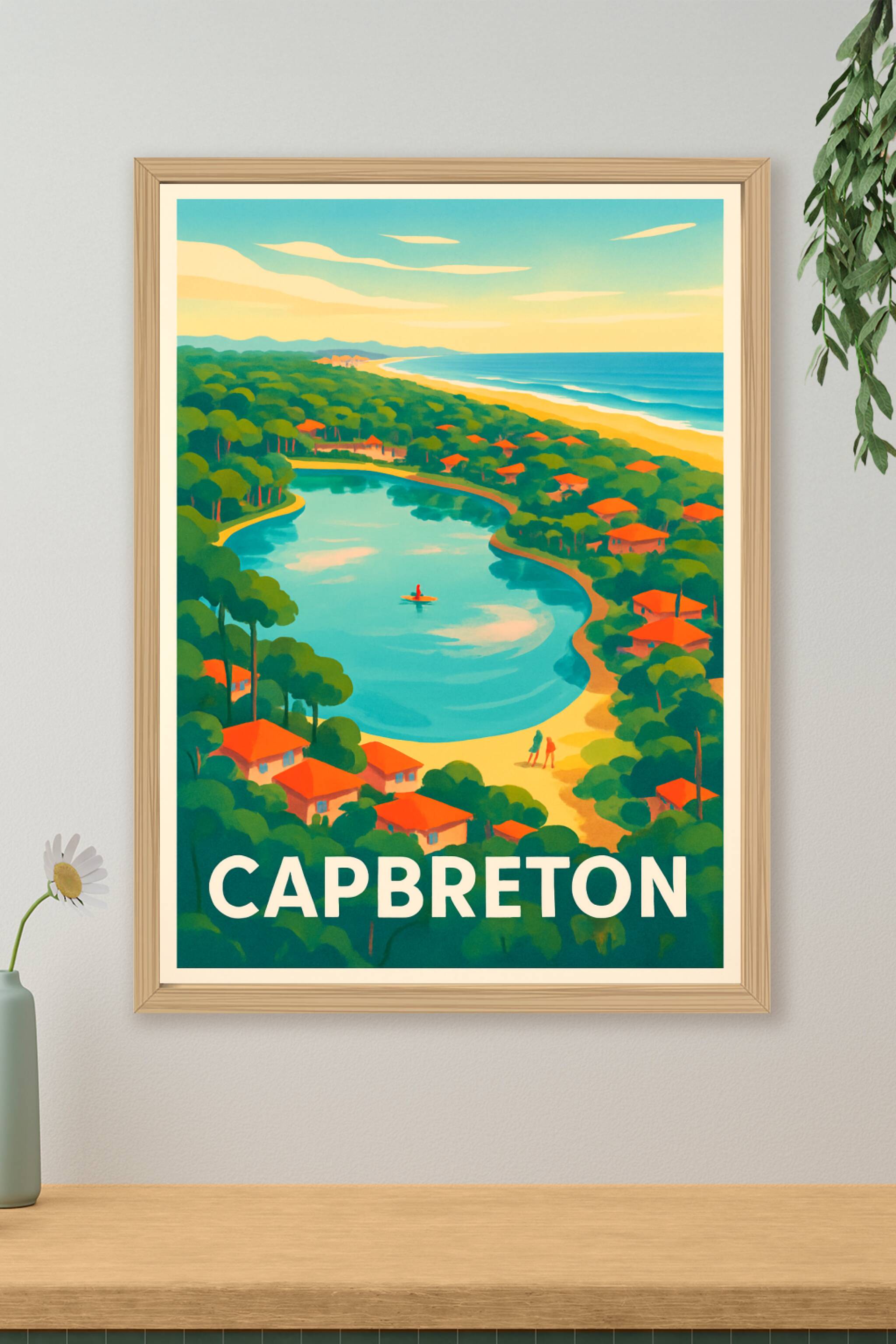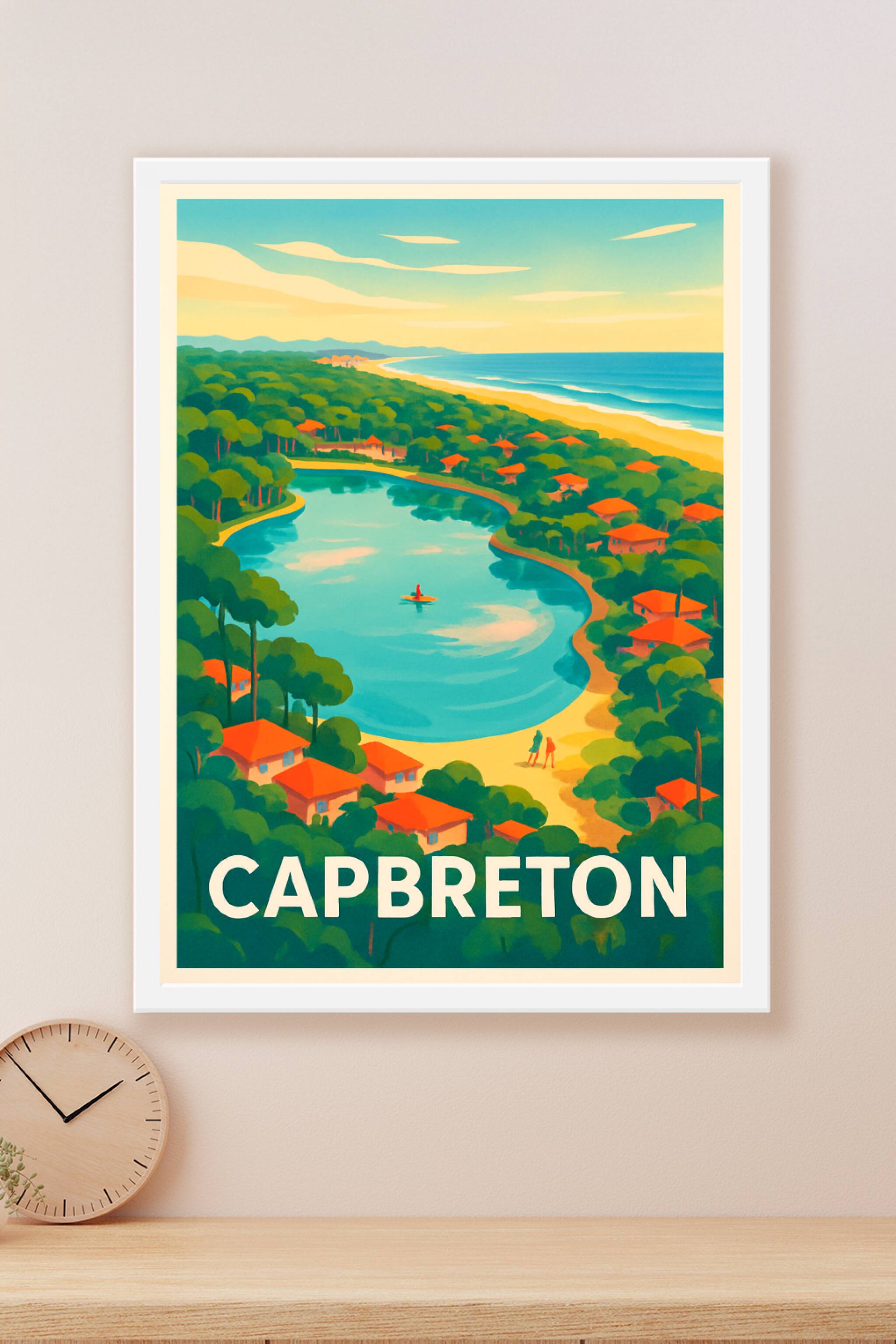 Découvrez l'univers paisible et enchanteur de Capbreton avec cette affiche vintage illustrée, mettant en scène un magnifique lac entouré de pins et de petites maisons aux toits rouges, bordé par la plage et l'océan. Ce poster transporte instantanément dans l'ambiance unique de cette station balnéaire du sud-ouest de la France.Cet affiche est imprimée en tirage "Fine Art" sur un papier 305g coton de haute qualité pour garantir des couleurs éclatantes et une durabilité optimale. Disponible en plusieurs formats allant du A1 au A4, avec ou sans cadre, cette décoration murale s'adapte à tous les espaces et styles d'intérieur.Profitez d'une impression premium 100% fabriquée en France, pour embellir votre maison ou offrir un cadeau original et raffiné aux amoureux de la nature et du surf.