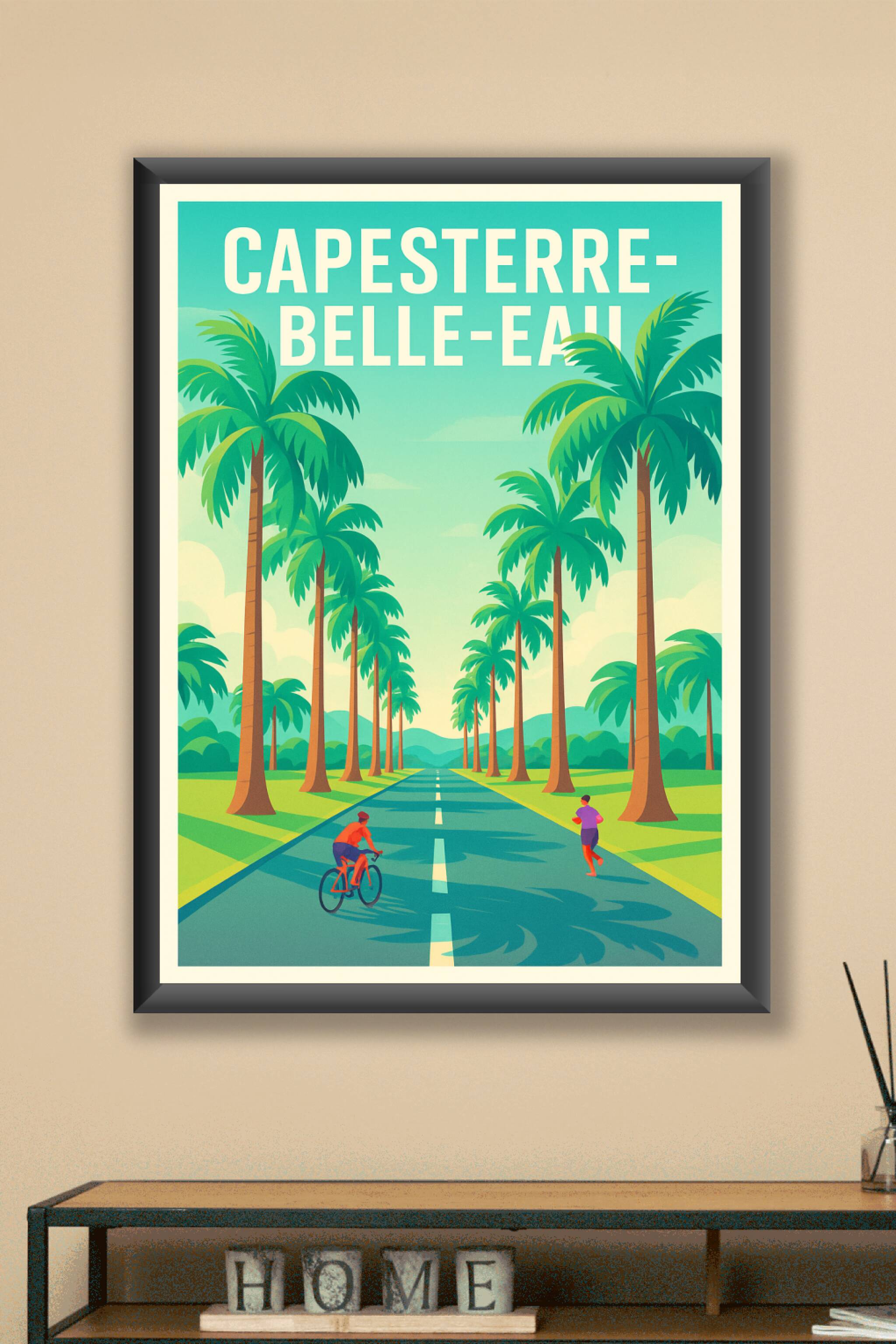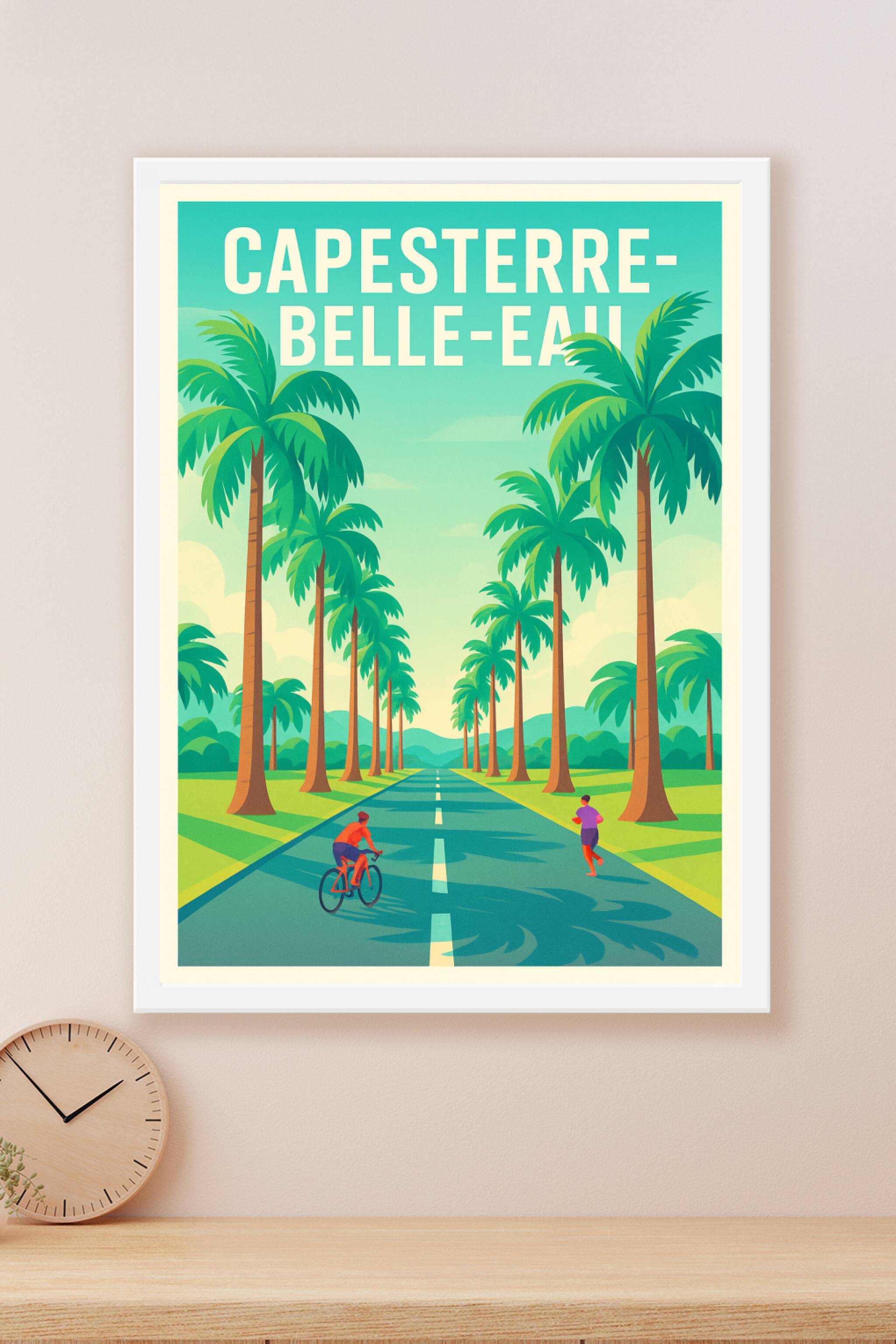 Découvrez l'ambiance paisible et tropicale de Capesterre-Belle-Eau avec cette affiche illustrée représentant une route bordée de palmiers où un cyc...