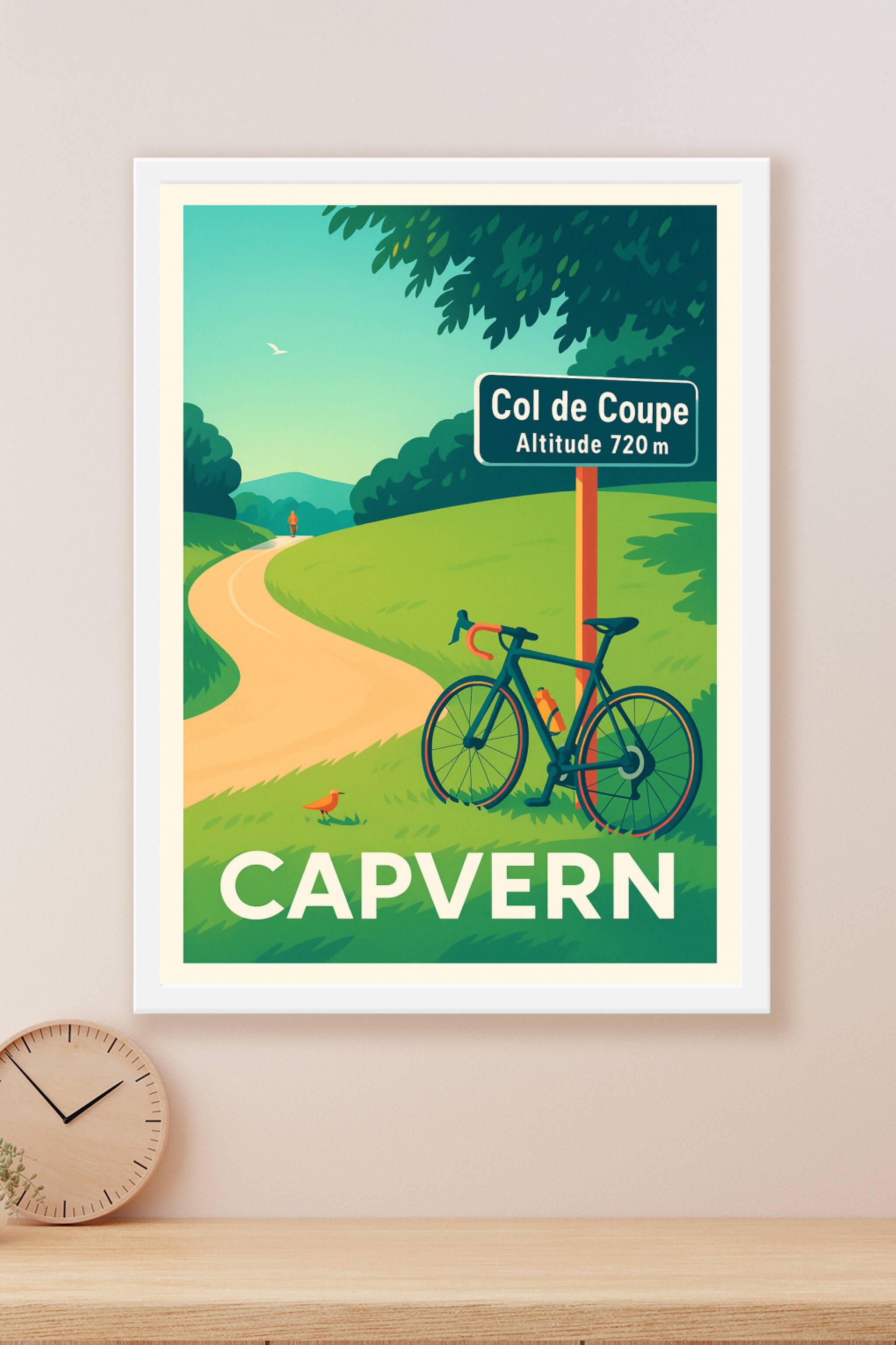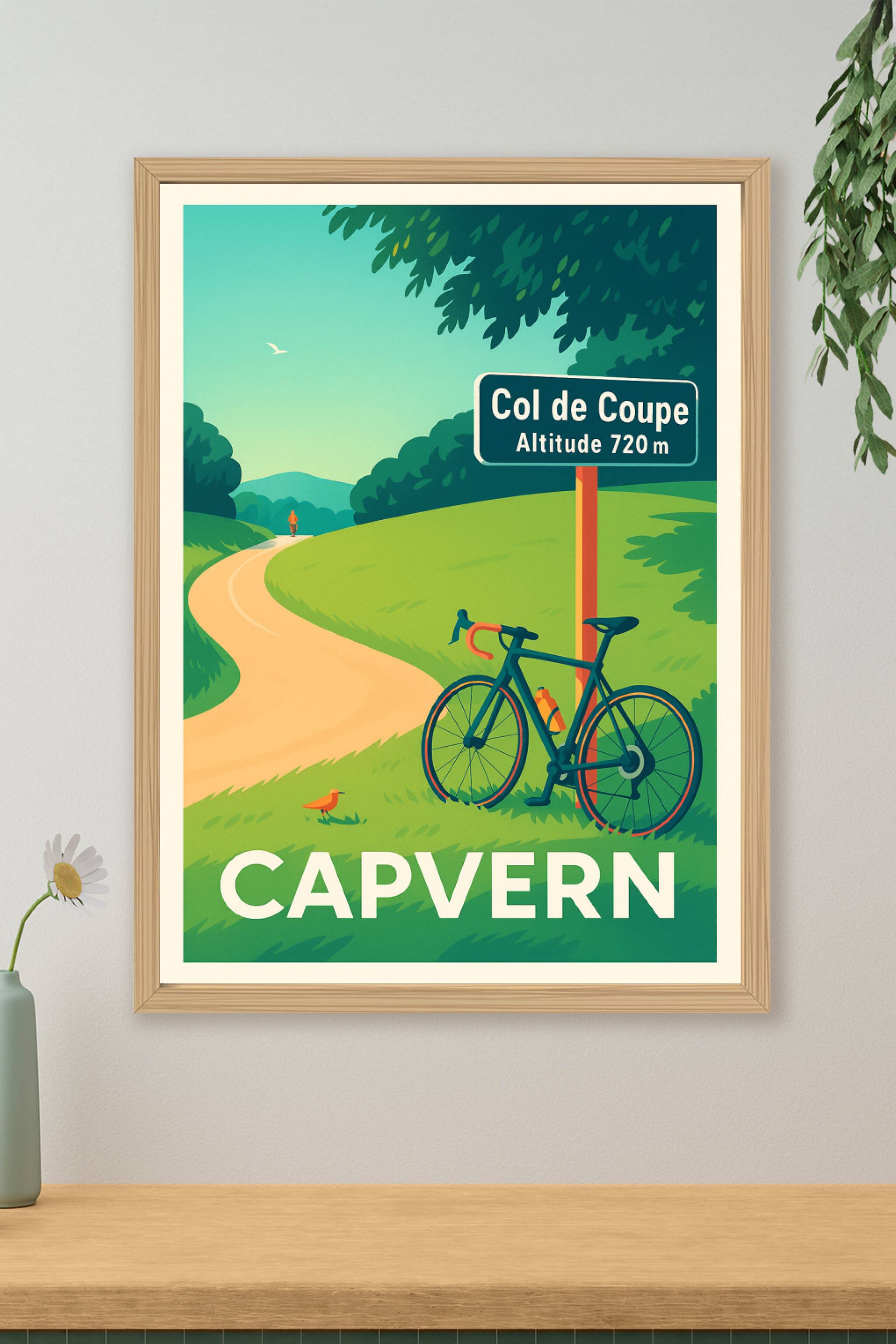 Découvrez l'univers paisible et verdoyant du Col de Coupe à Capvern avec cette affiche illustrée dans un style vintage épuré. Ce poster met en avan...