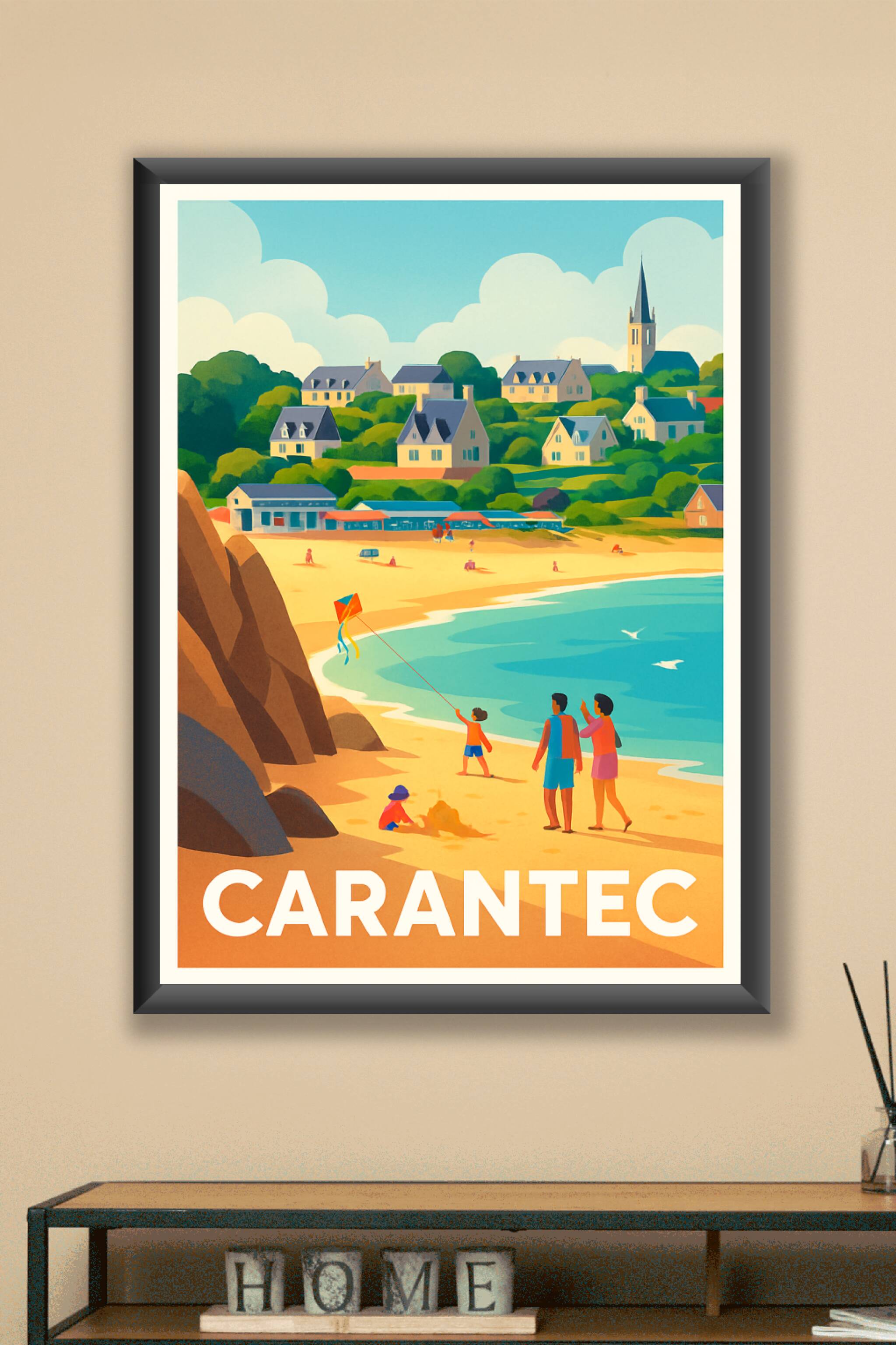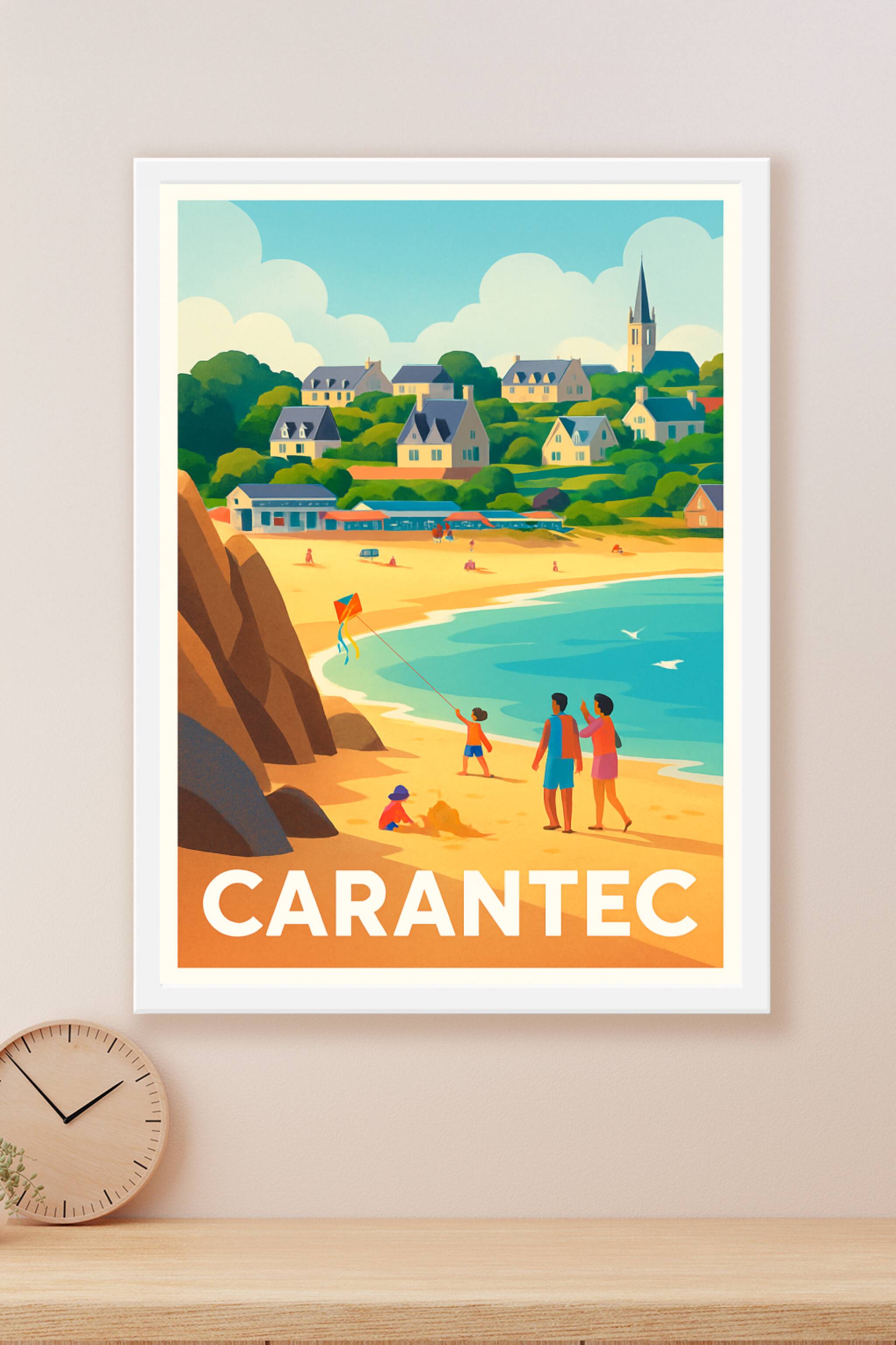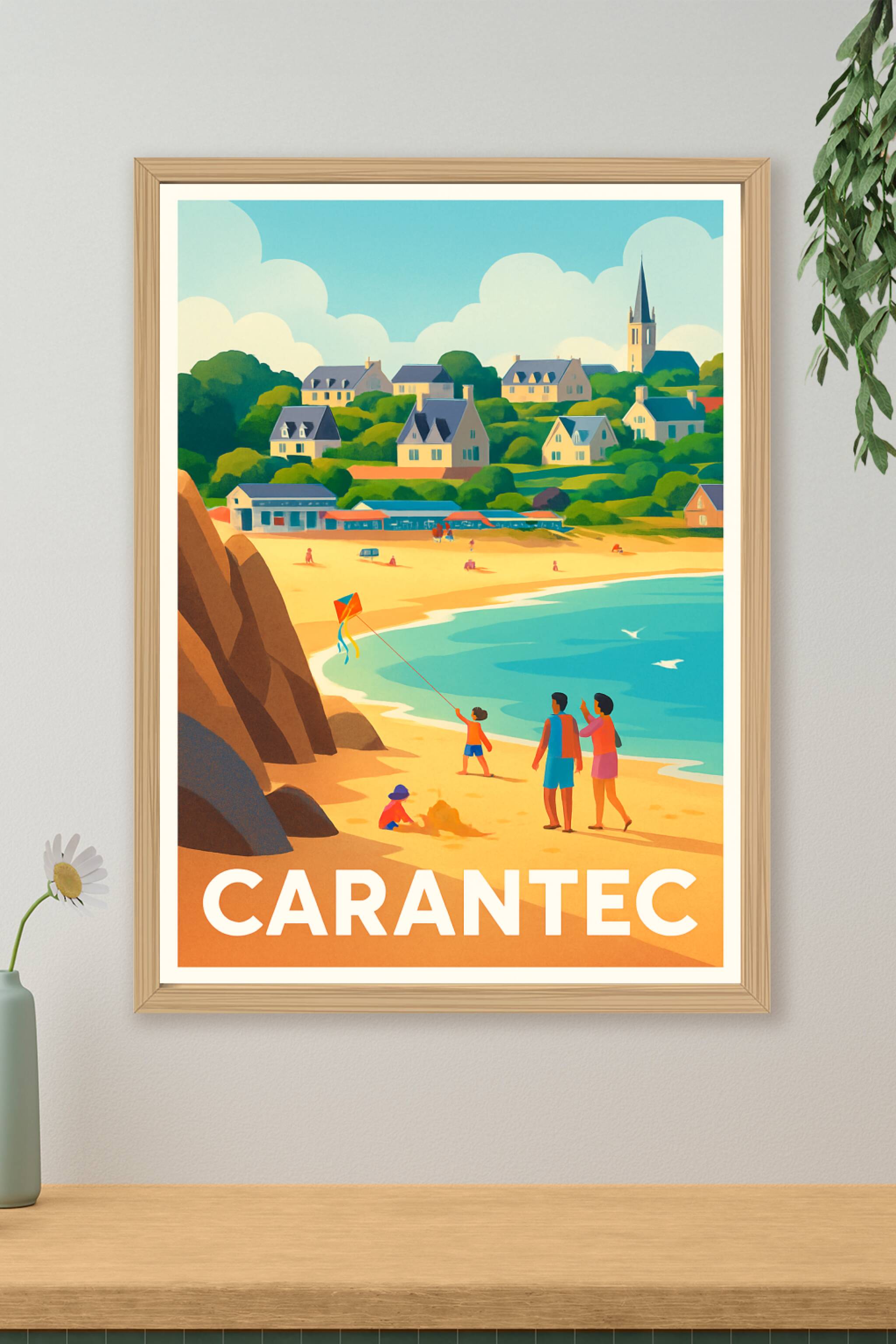 Offrez-vous une parenthèse enchantée avec cette affiche illustrée représentant la plage ensoleillée de Carantec, entre maisons pittoresques et ciel...