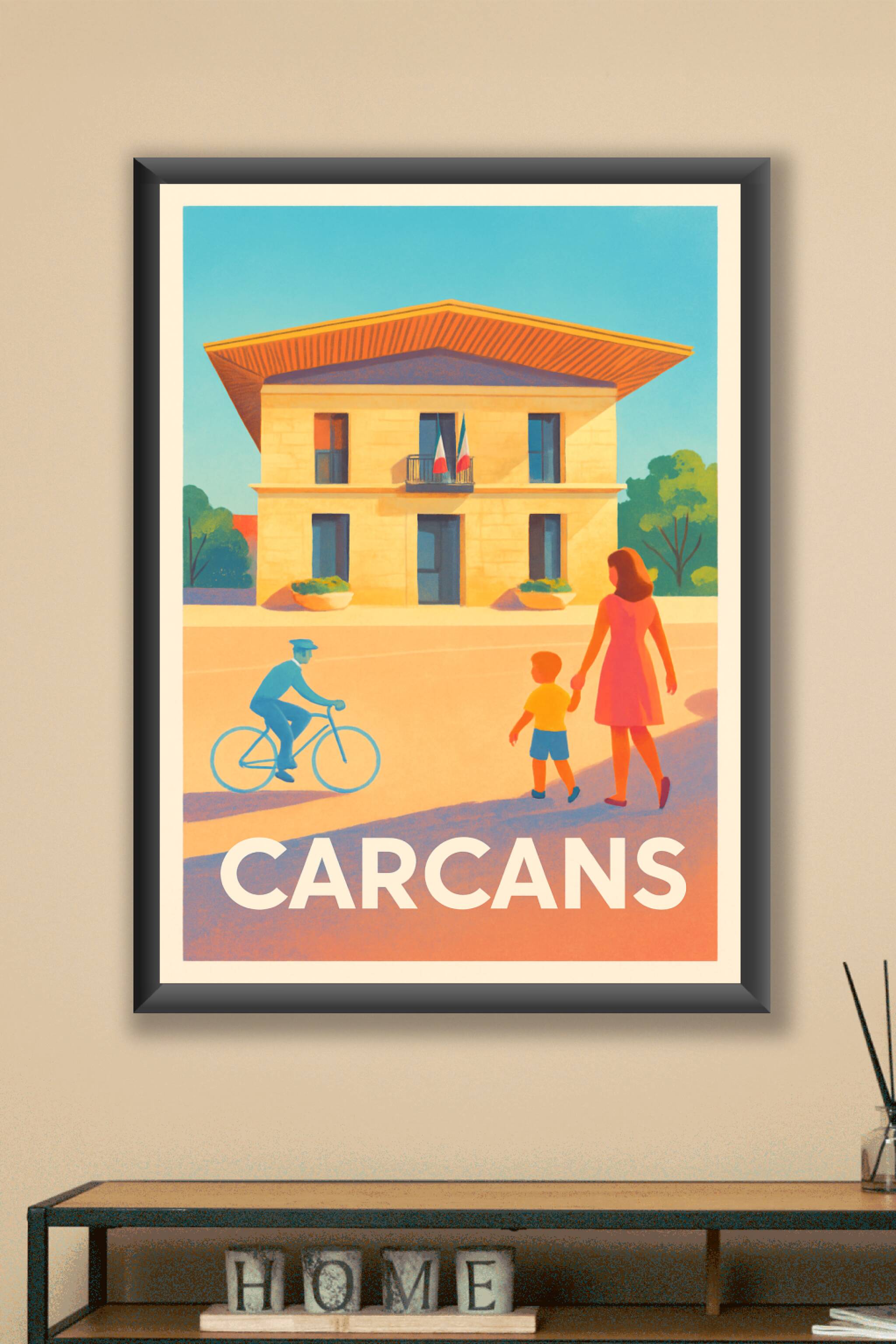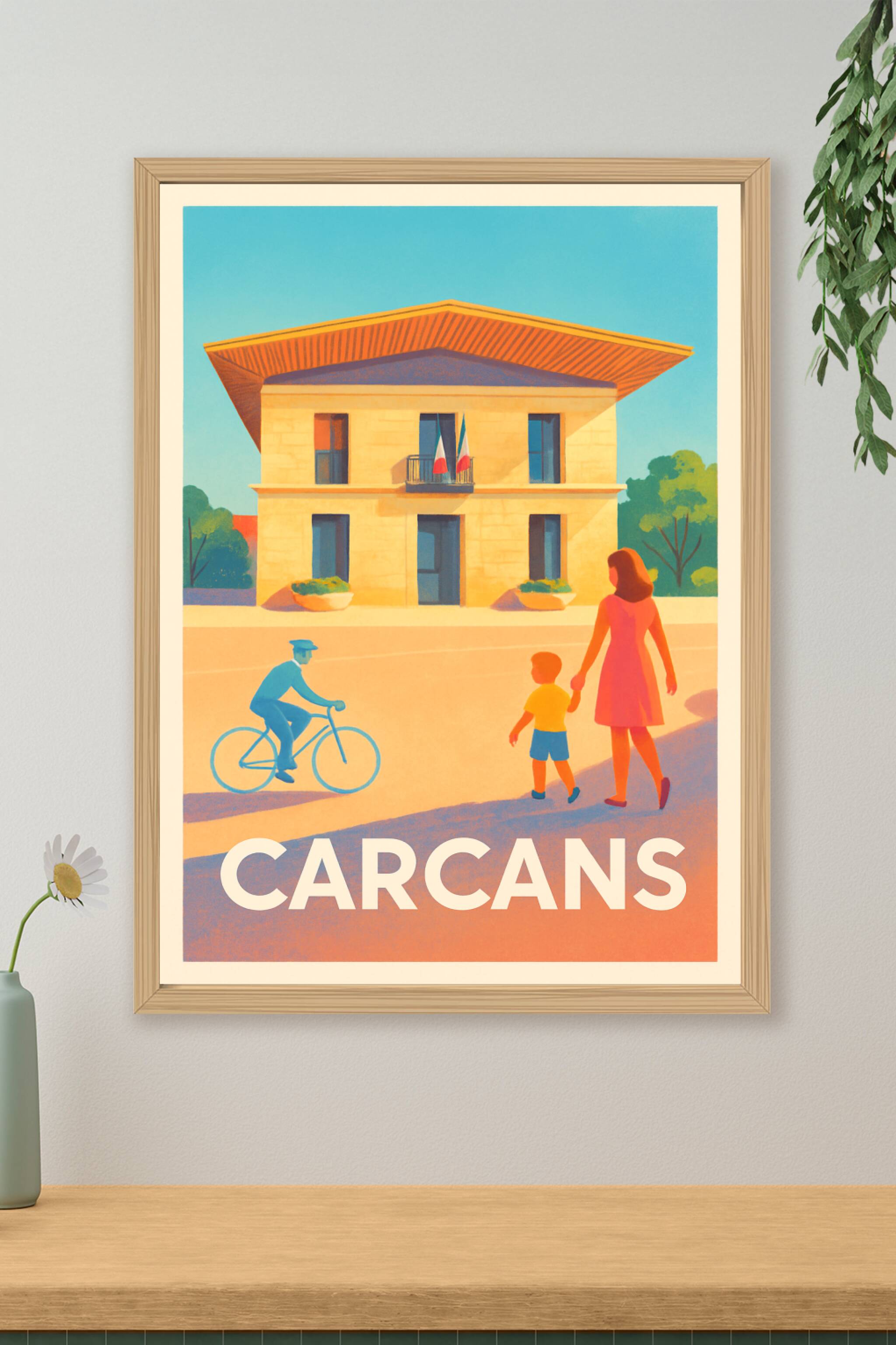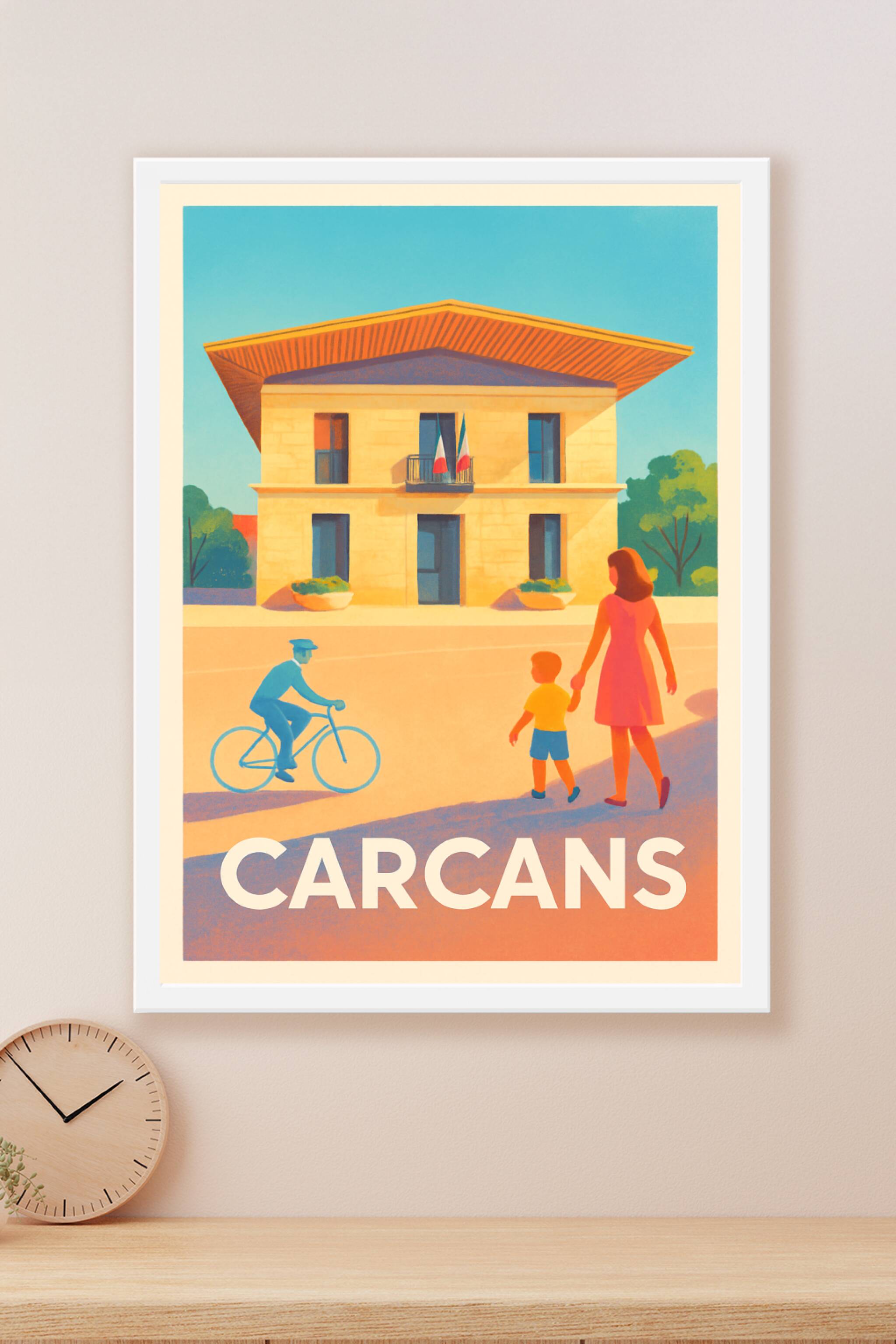 Découvrez l'atmosphère apaisante et intemporelle de Carcans avec cette affiche au style rétro et coloré. Illustrant une scène de la vie quotidienne...