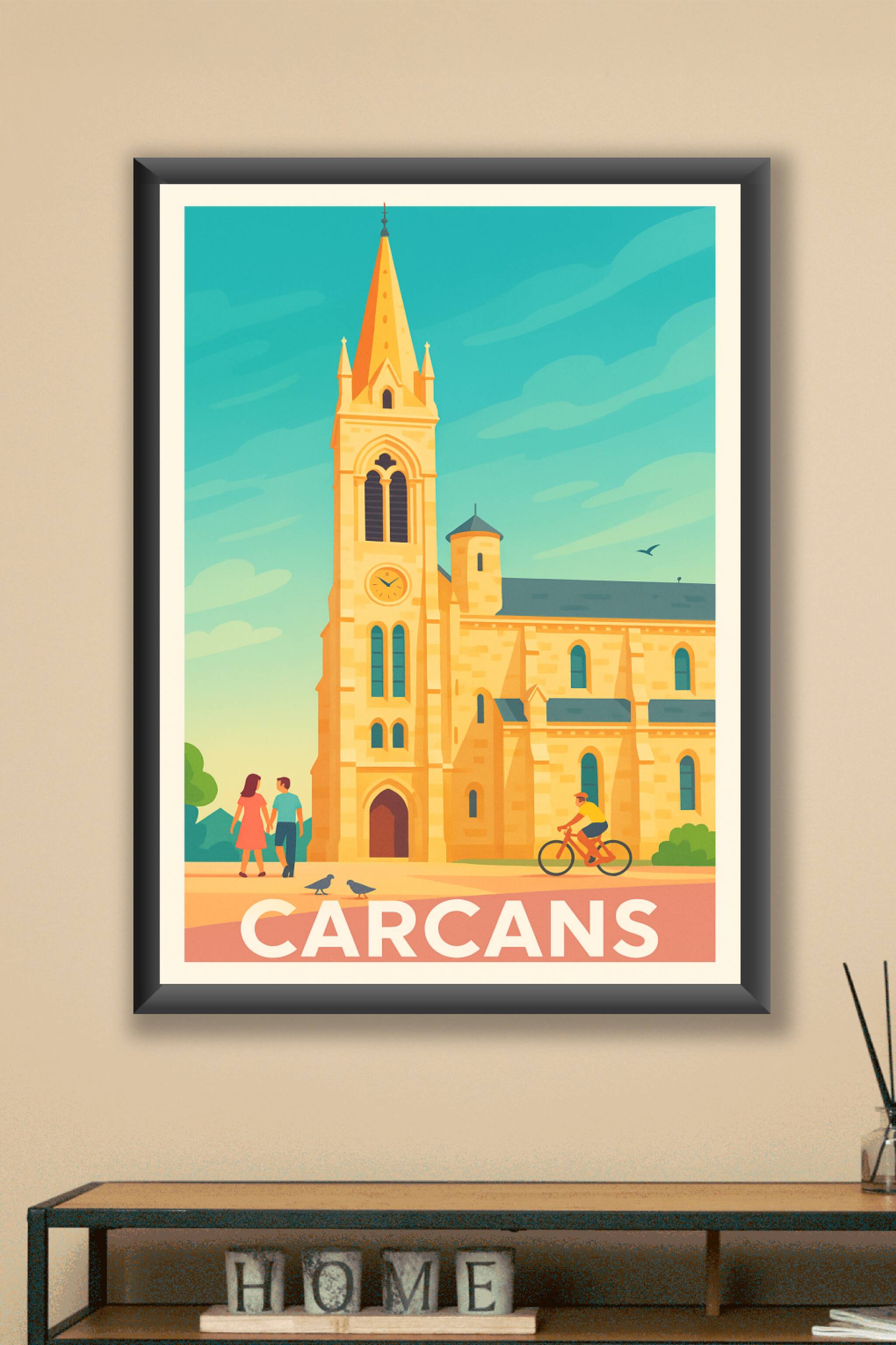 Découvrez le charme élégant de Carcans avec cette affiche illustrée, mettant en lumière son architecture emblématique baignée de lumière dorée. Ce ...