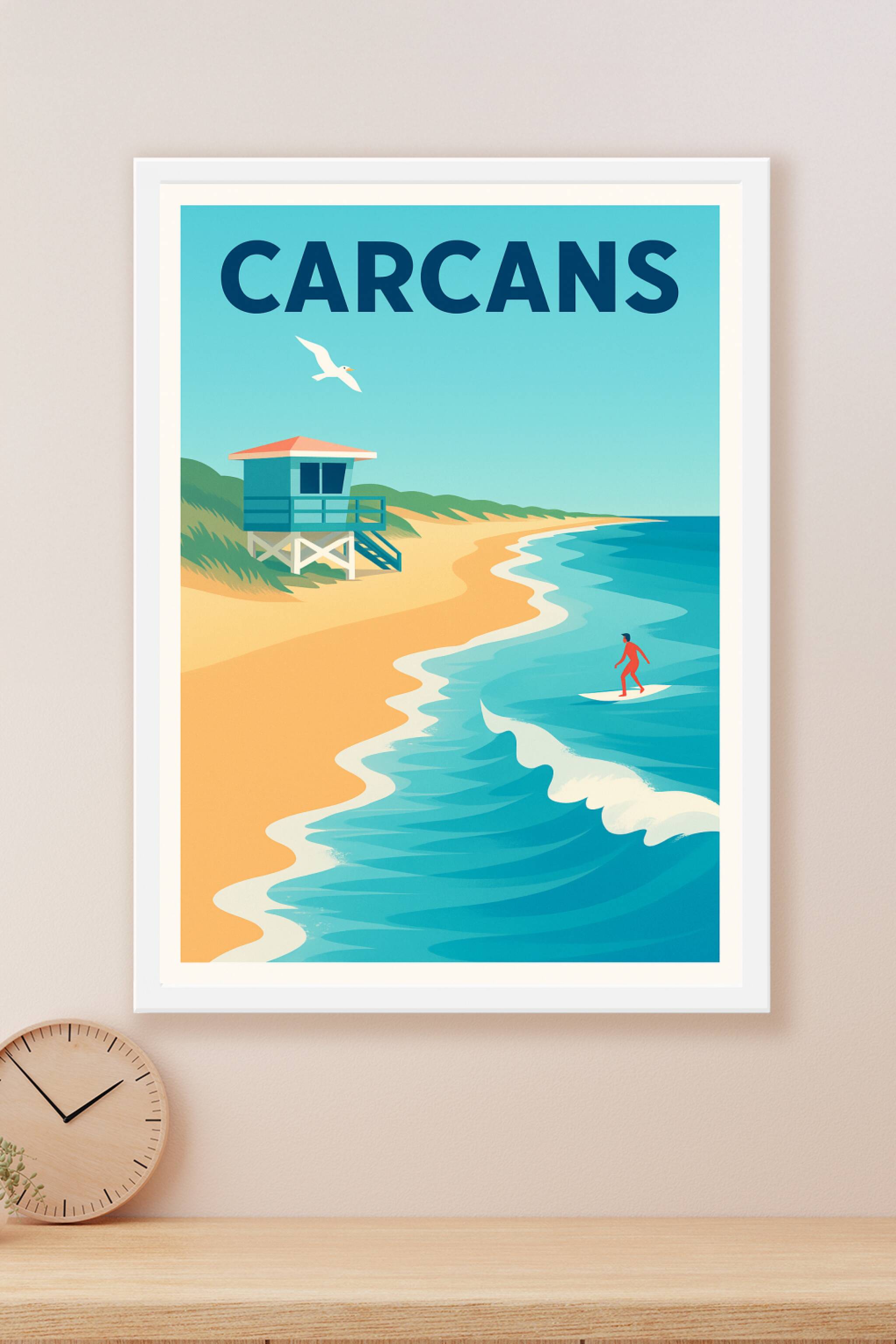 Découvrez la sérénité et l'énergie de la plage de Carcans avec cette affiche au design épuré et contemporain. Le poster illustre une scène balnéair...