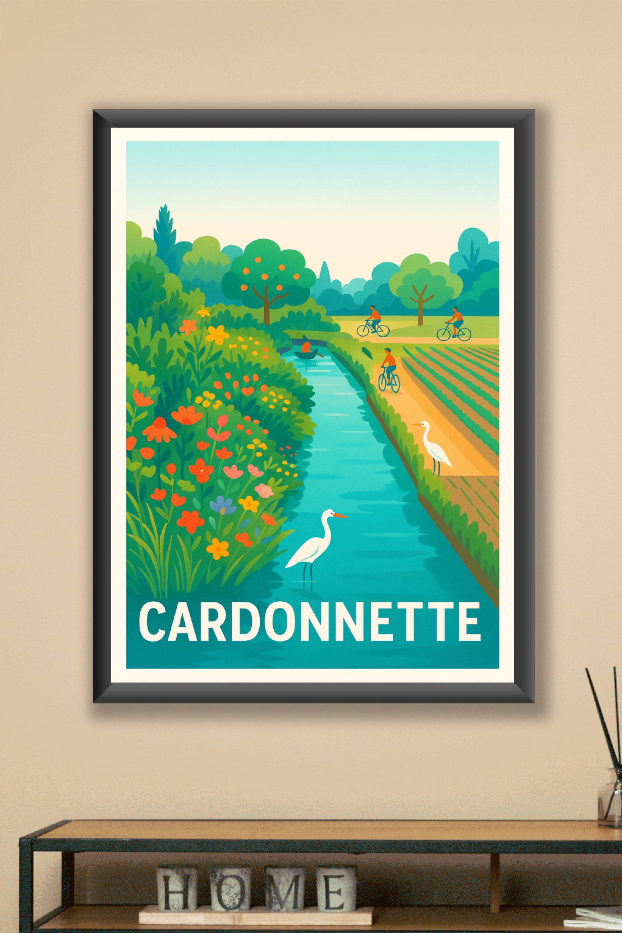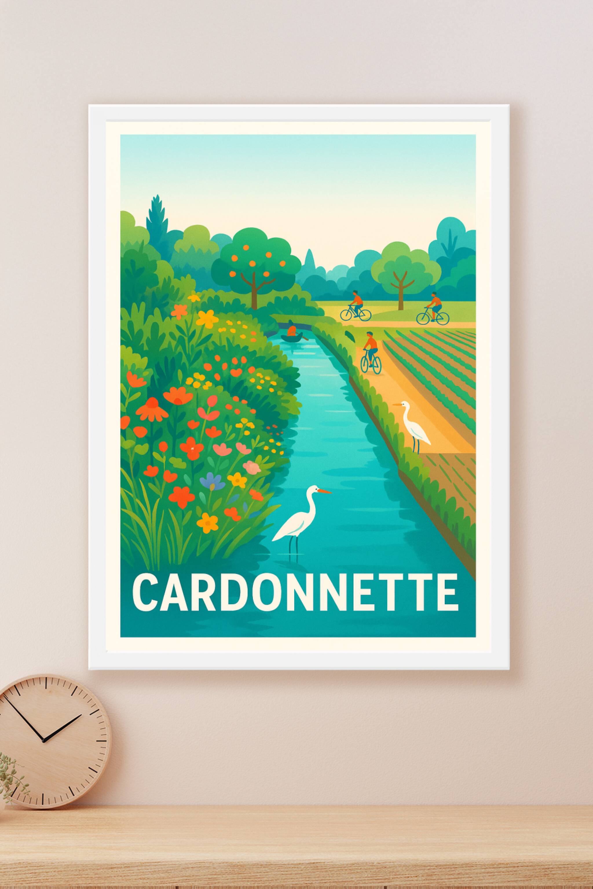 Découvrez la douceur de vivre à Cardonnette avec cette affiche illustrée qui capture un paysage bucolique où campagne, rivière paisible et biodiver...