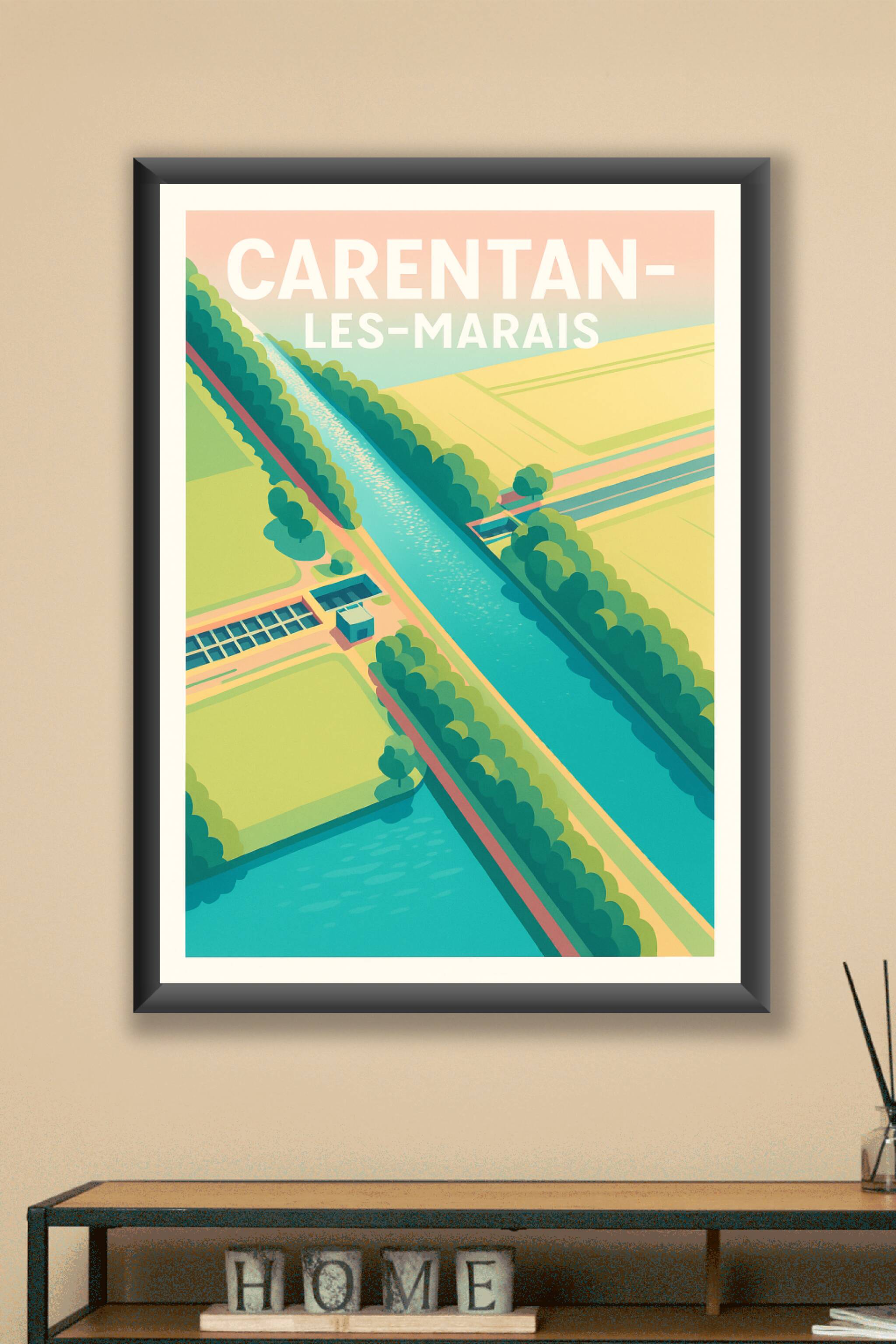 Découvrez la beauté apaisante de Carentan-les-Marais avec cette affiche stylisée illustrant ses paysages de canaux et de verdure. Ce poster évoque ...