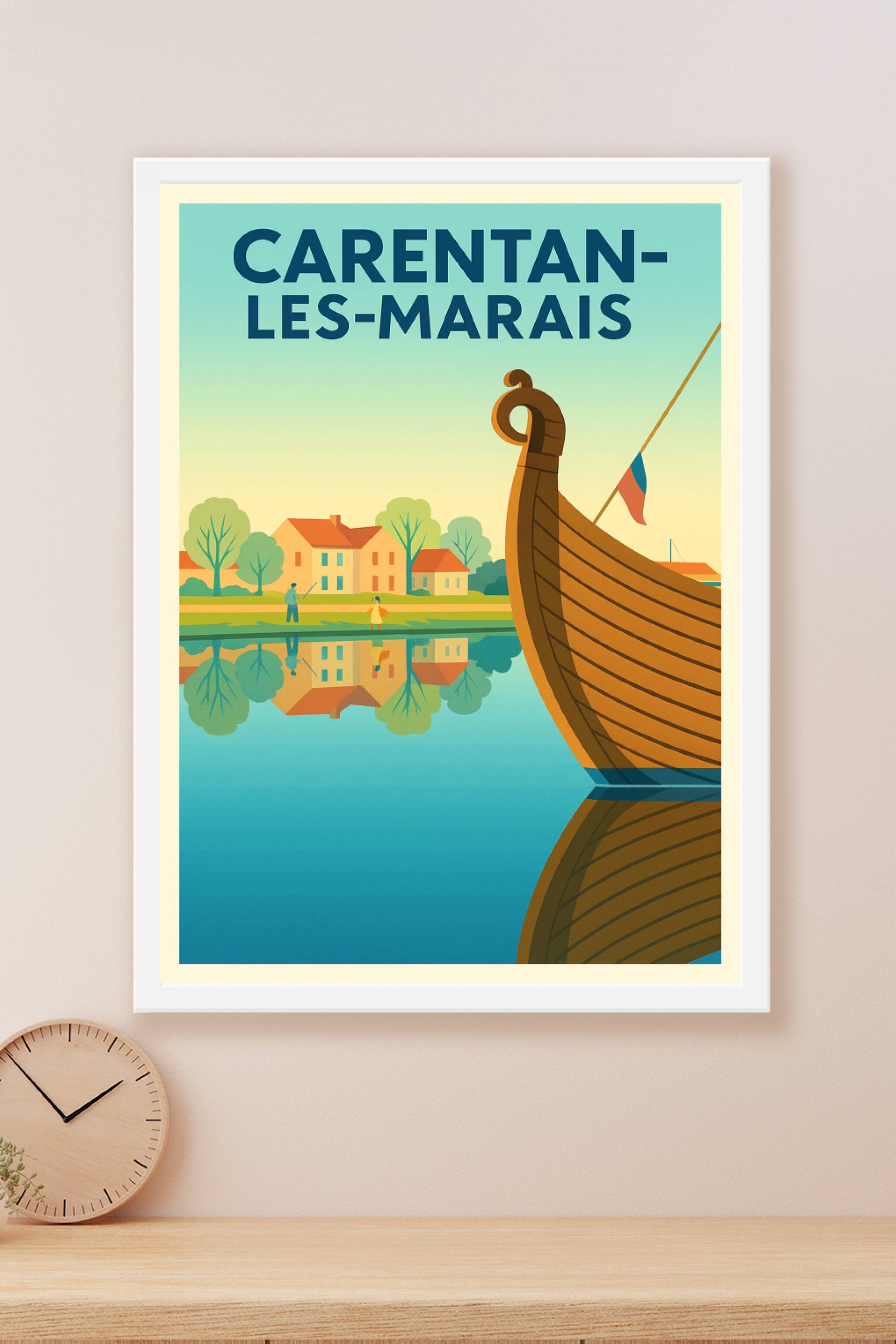 Découvrez la sérénité des paysages de Carentan-les-Marais avec cette affiche au style rétro illustrant un village paisible au bord de l'eau, où se ...