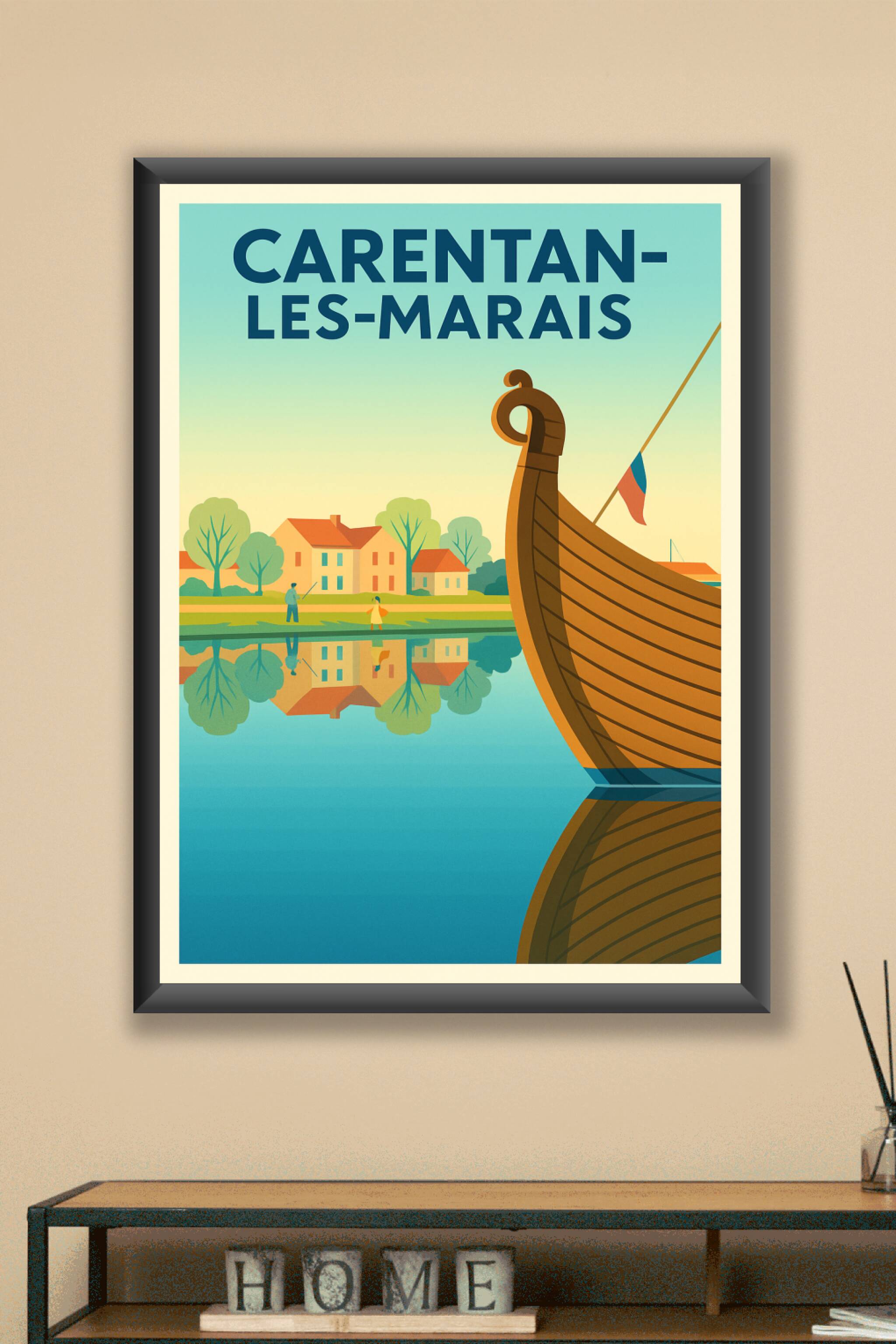 Découvrez la sérénité des paysages de Carentan-les-Marais avec cette affiche au style rétro illustrant un village paisible au bord de l'eau, où se reflètent maisons et nature. La proue d'un bateau traditionnel souligne le lien profond de la ville avec son patrimoine fluvial.Ce poster est proposé en tirage "Fine Art" sur un papier 305g coton garantissant une qualité d'impression remarquable et une longévité optimale. Disponible en formats A1 à A4, avec ou sans cadre, ce tirage sublime votre décoration intérieure ou offre un souvenir unique aux passionnés de Carentan-les-Marais. Fabriqué en France, ce poster est un véritable hommage à cette charmante cité marécageuse.