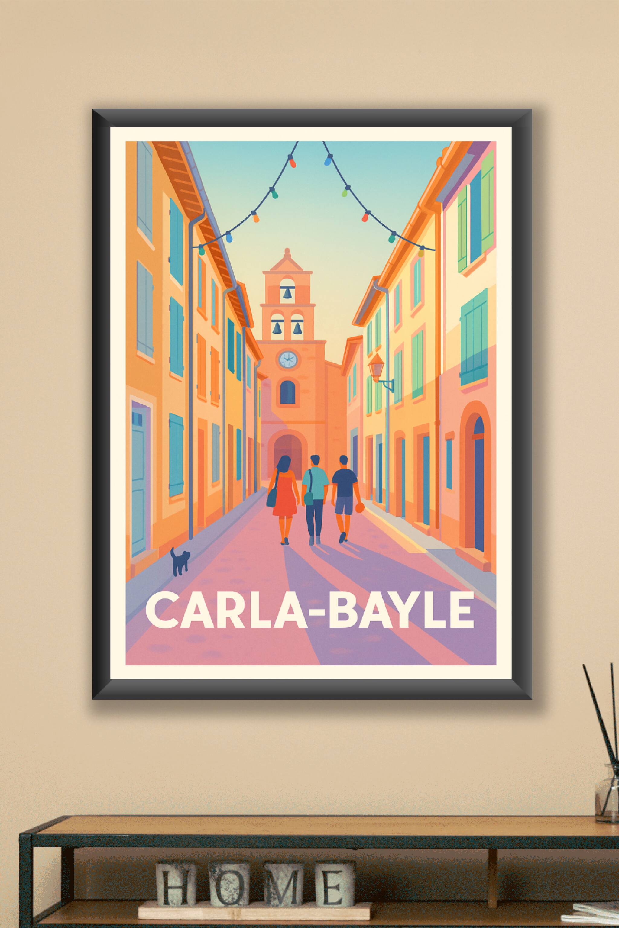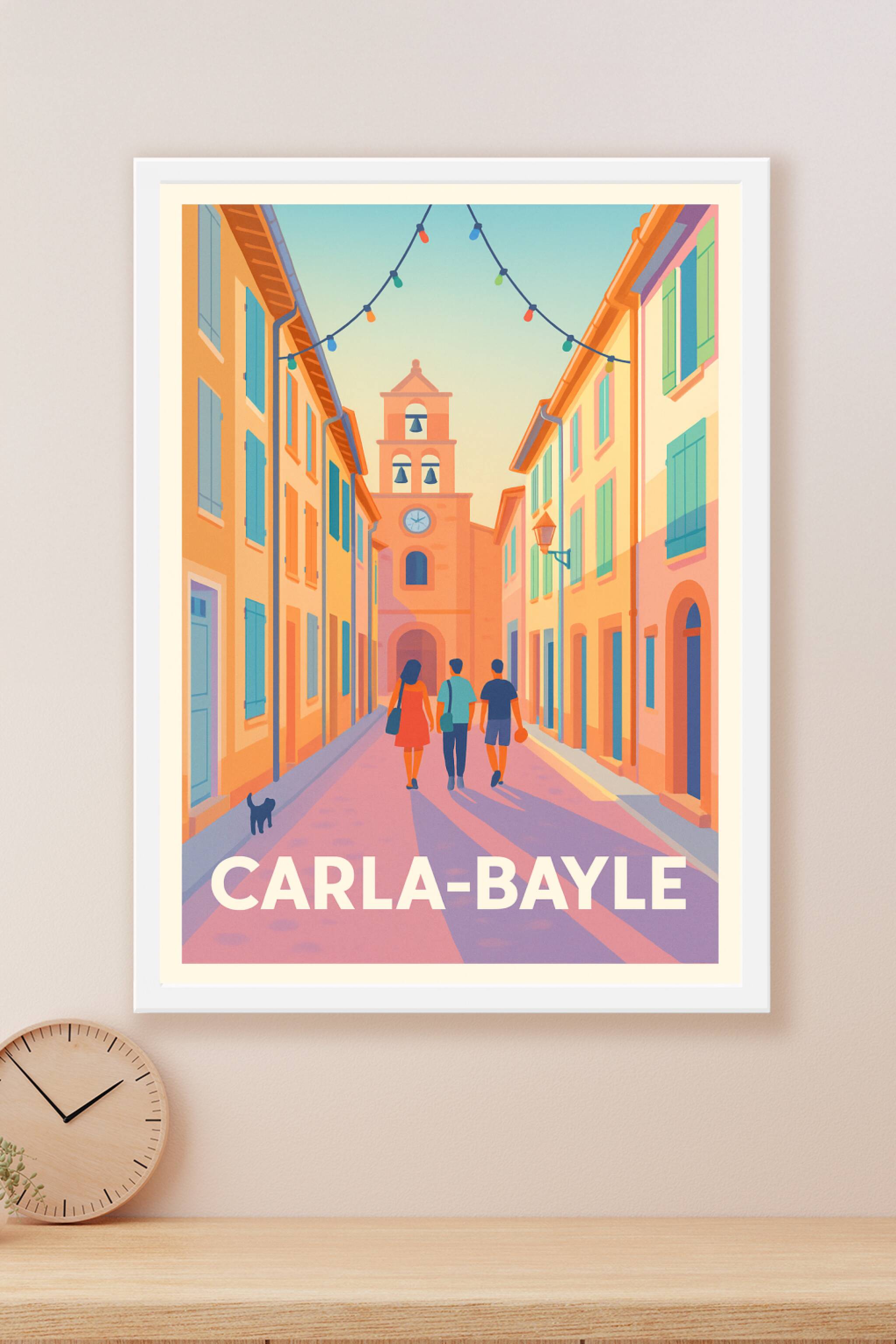 Découvrez l'atmosphère charmante et colorée de Carla-Bayle avec cette affiche illustrée pleine de douceur. Cette scène captivante montre une ruelle...