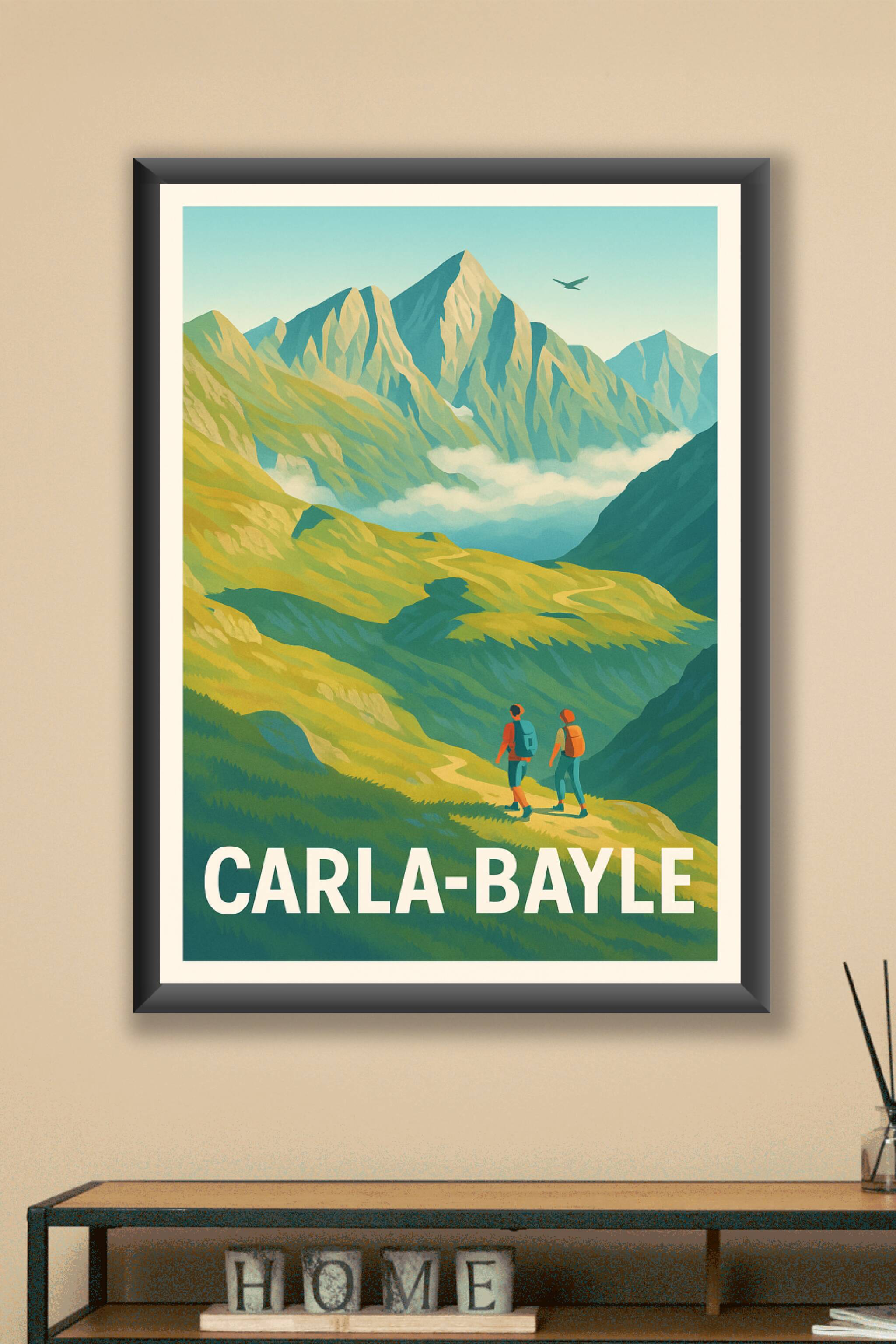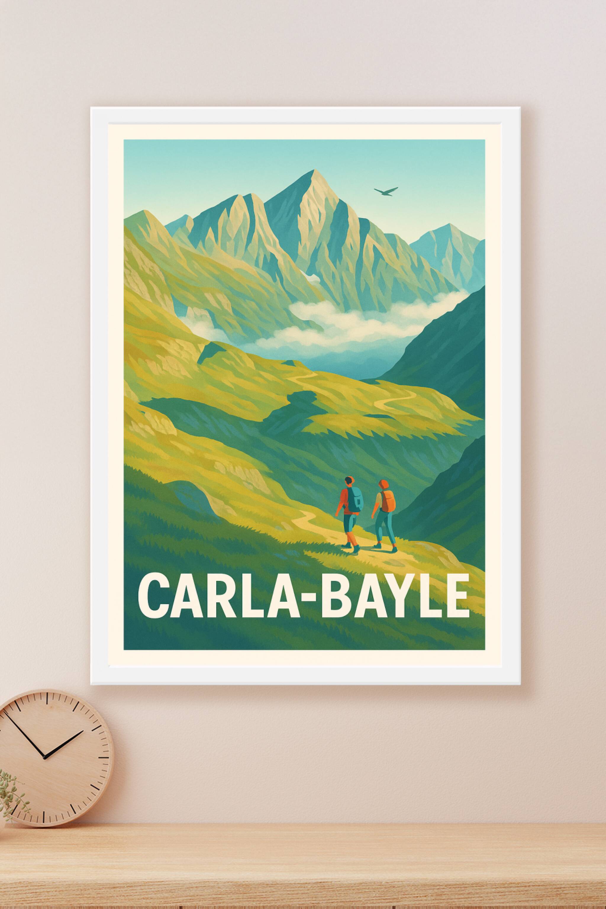Découvrez la beauté sauvage des montagnes autour de Carla-Bayle avec cette affiche illustrée qui invite à la randonnée et à l'exploration. Ce poste...