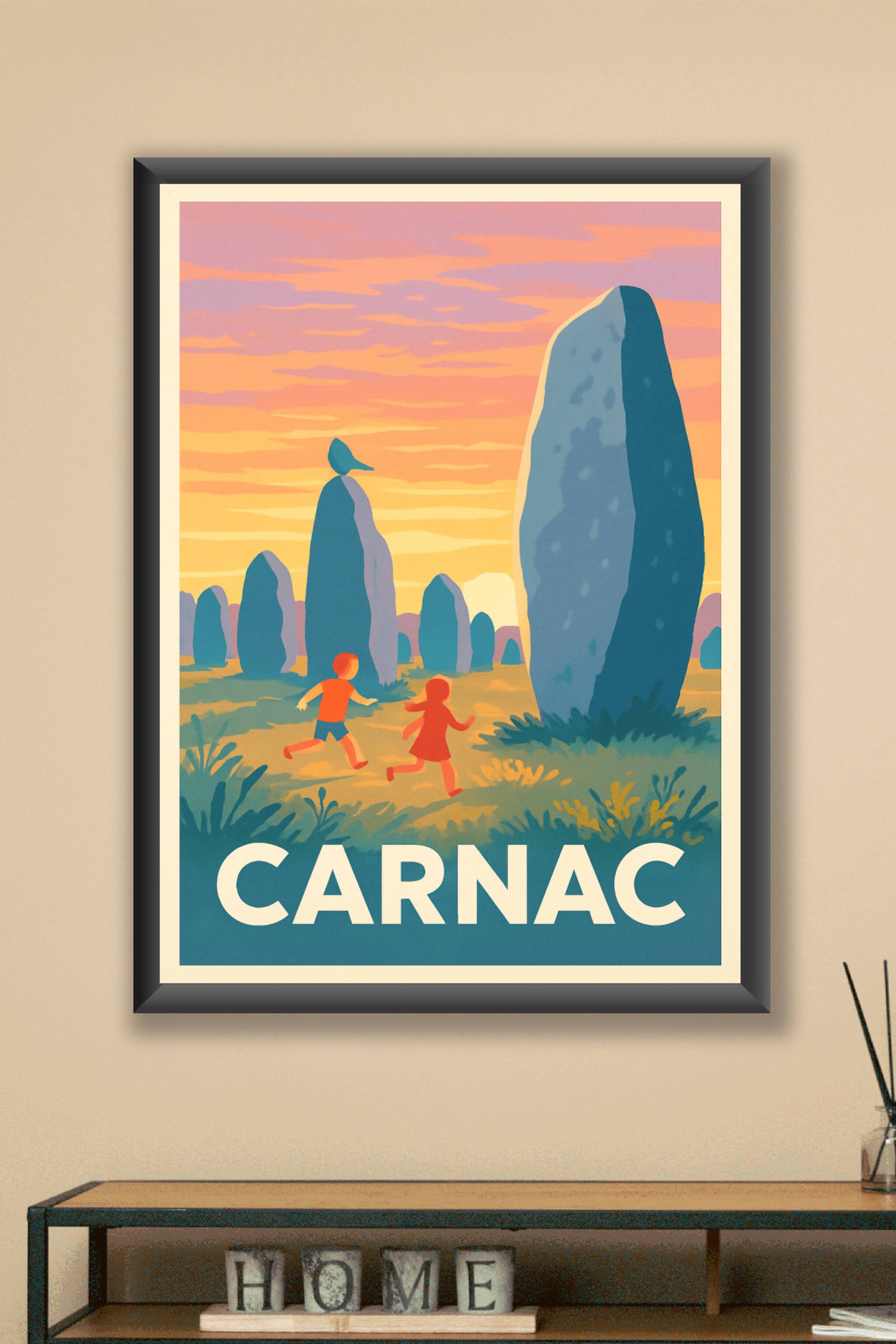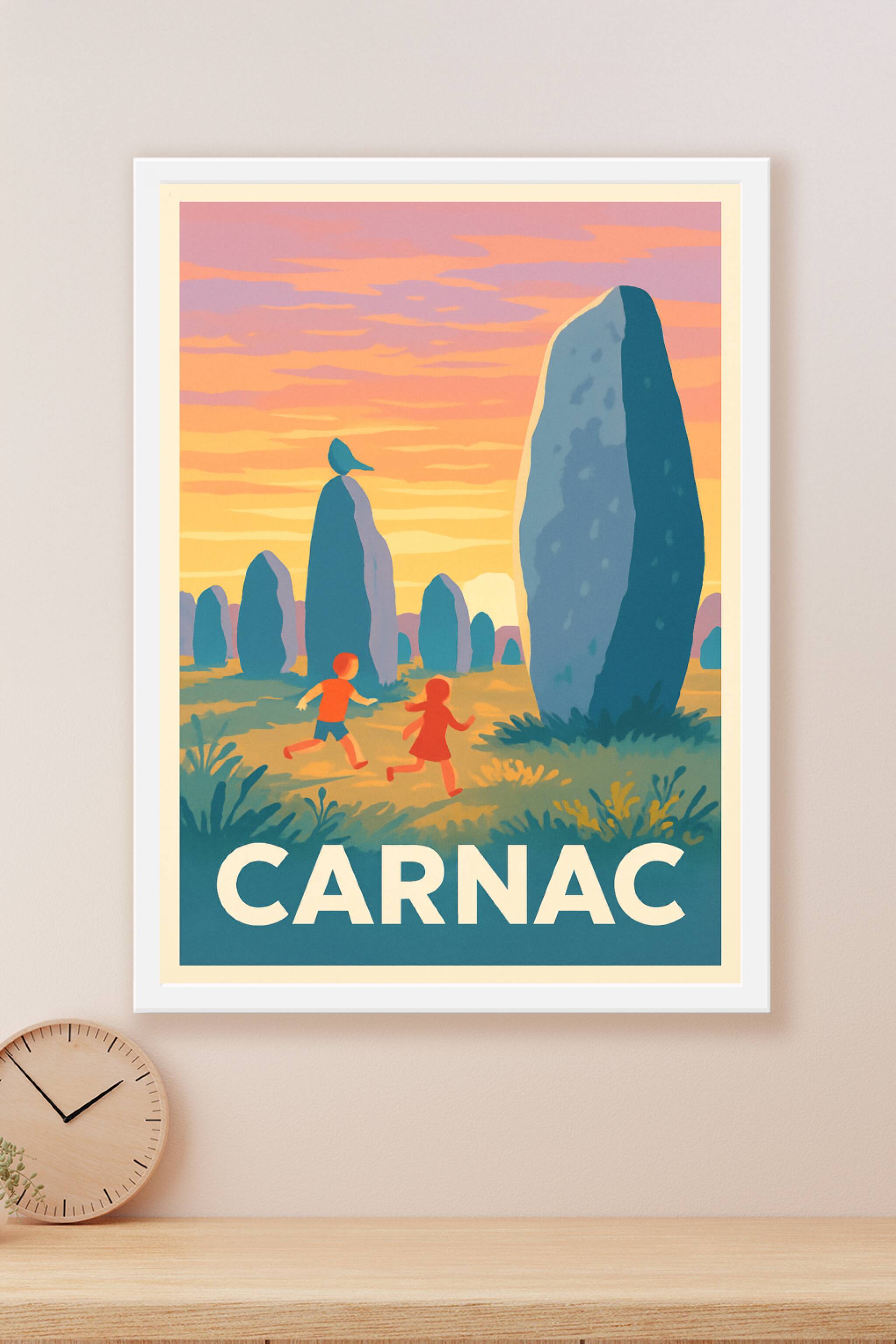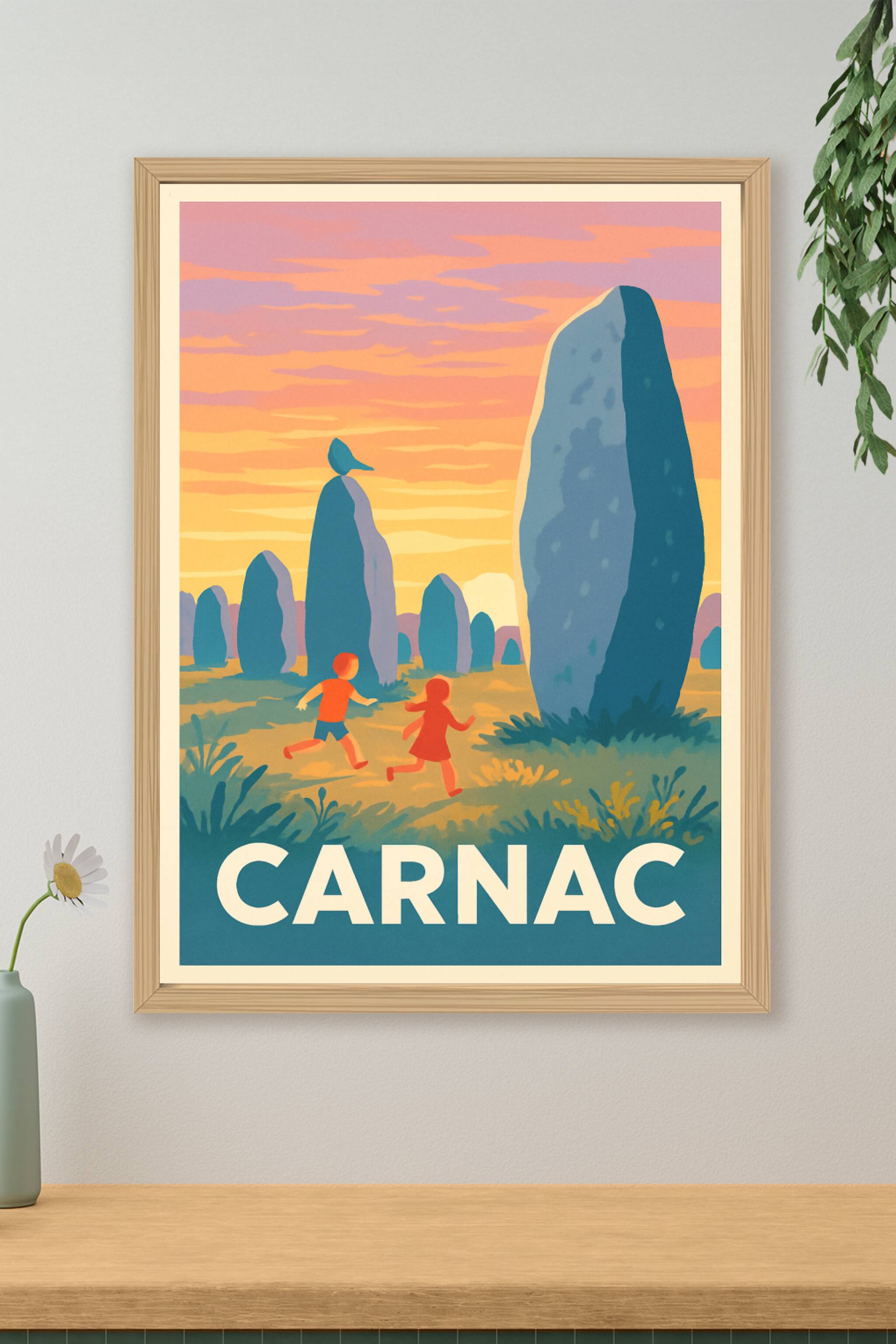 Découvrez la magie intemporelle des alignements de Carnac avec cette affiche au style illustré chaleureux et poétique. Ce poster met en scène les c...