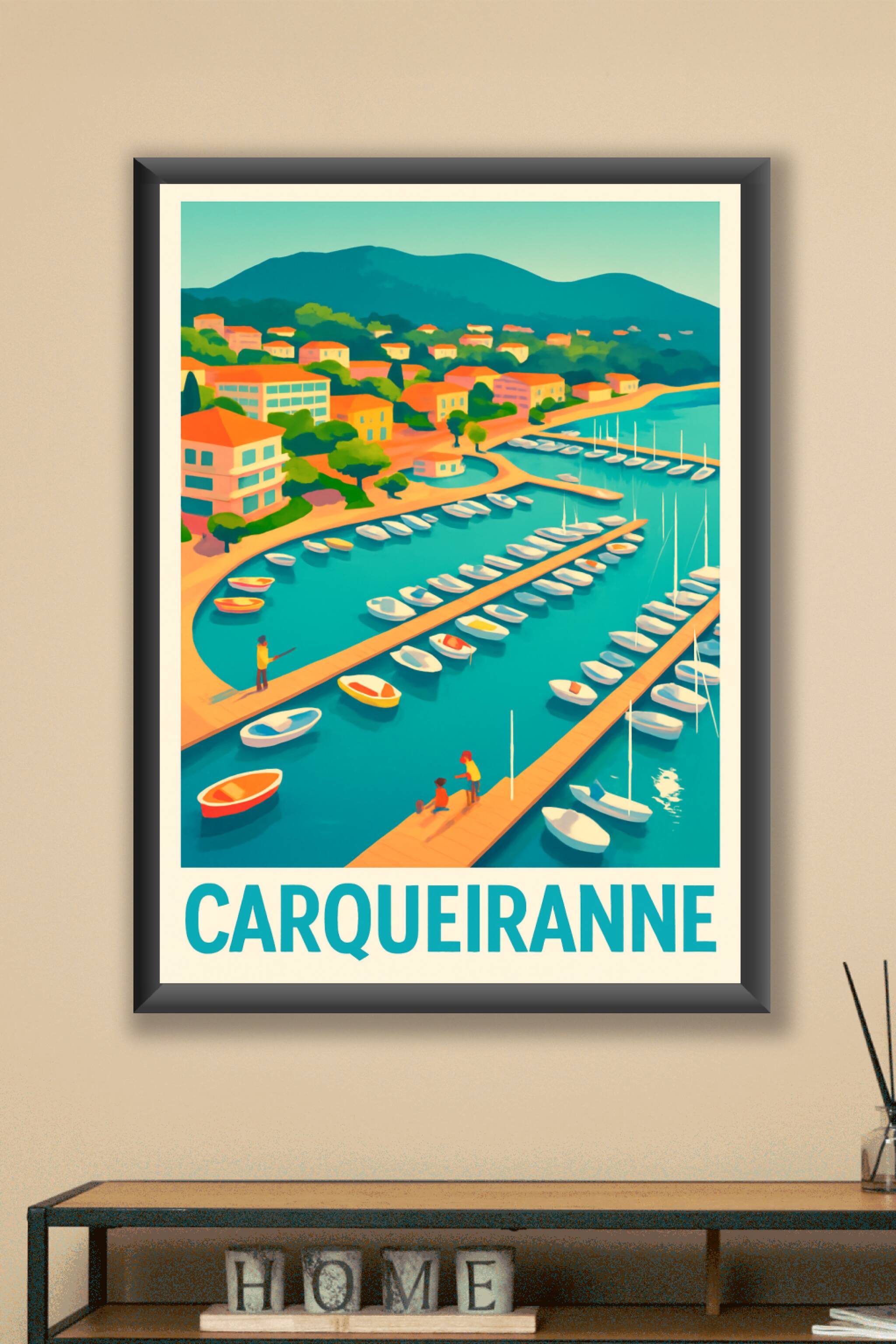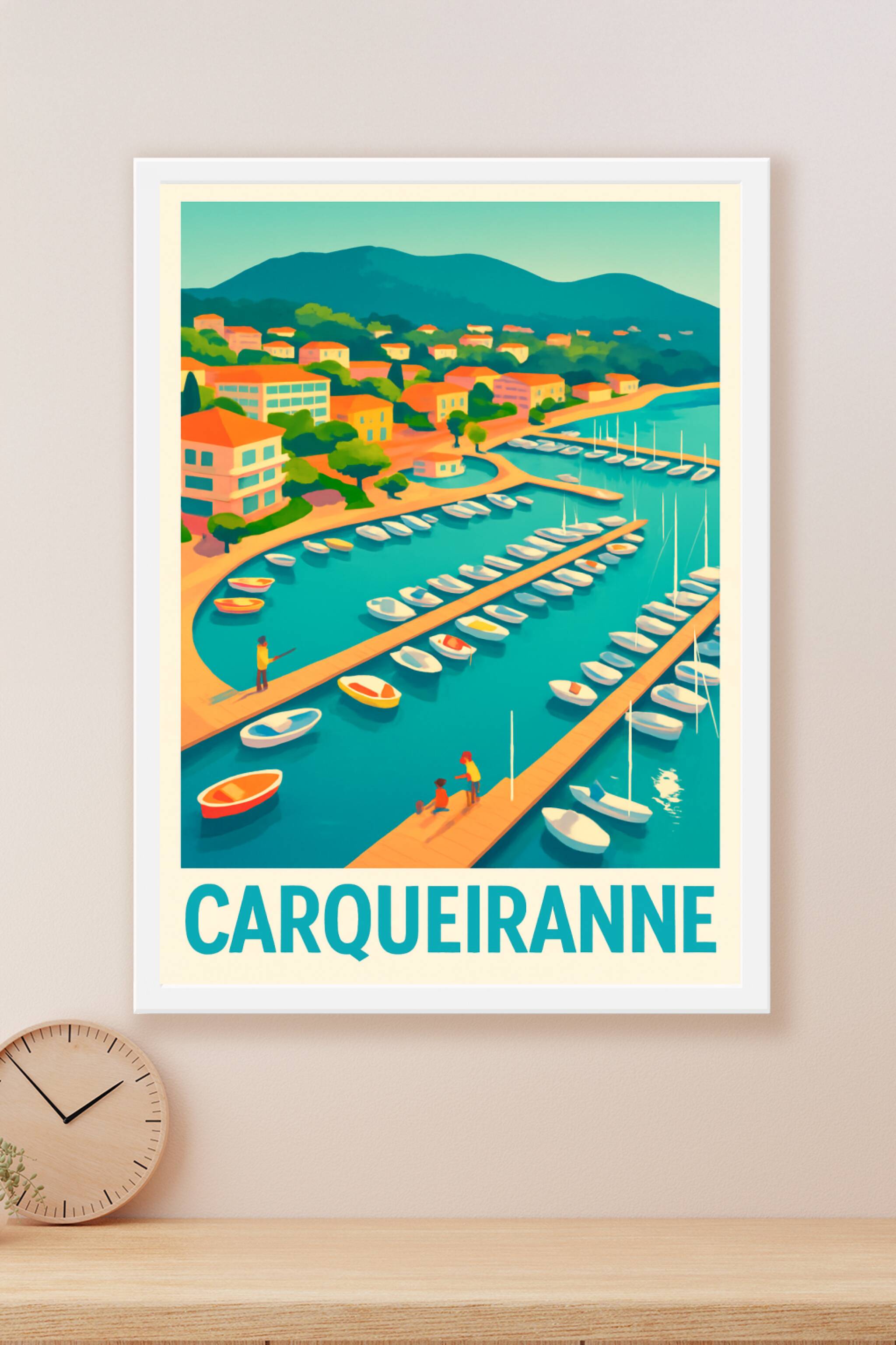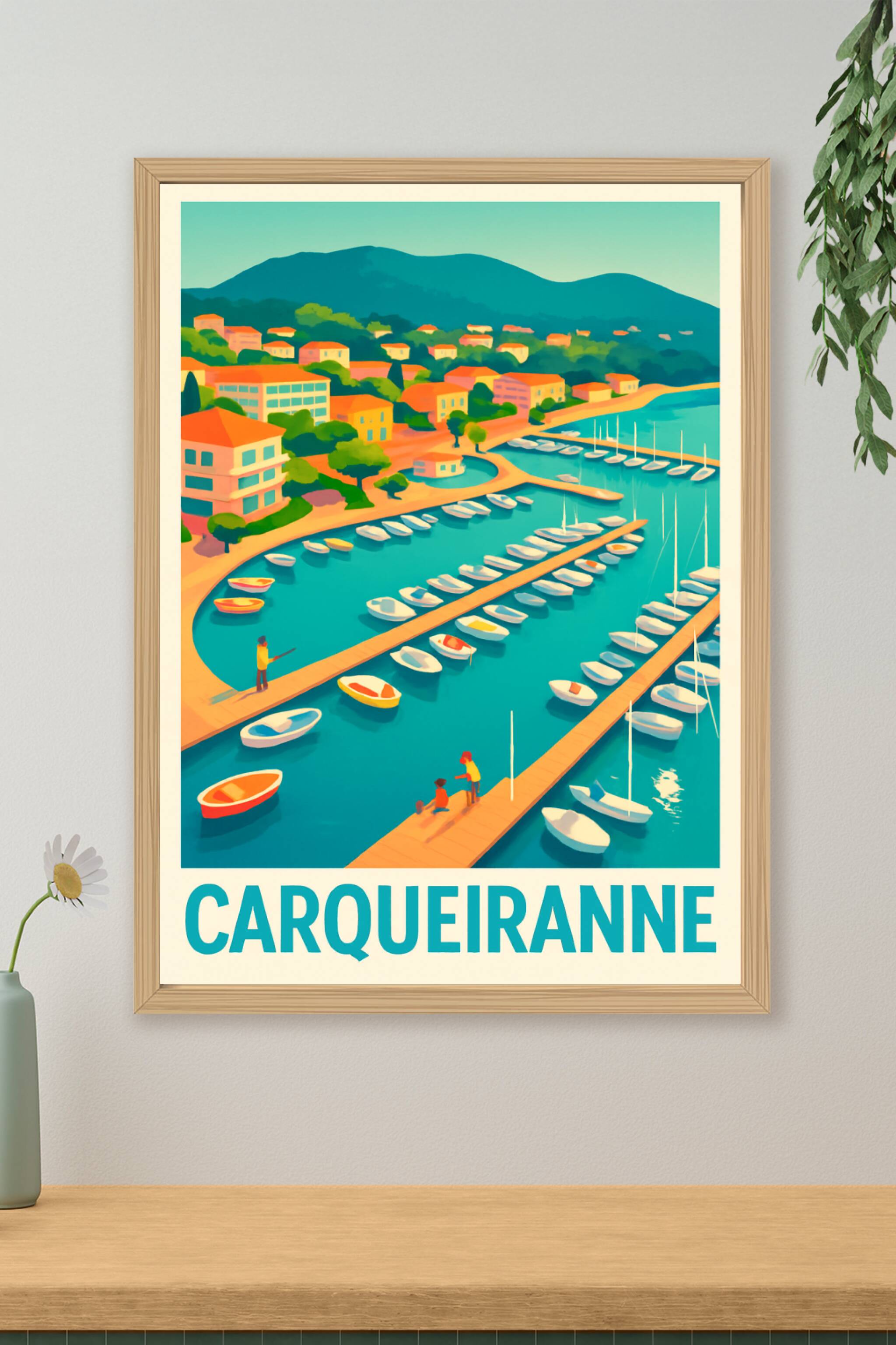 Découvrez la douceur de vivre méditerranéenne avec cette affiche illustrée de Carqueiranne, mettant en scène son charmant port et ses eaux turquois...