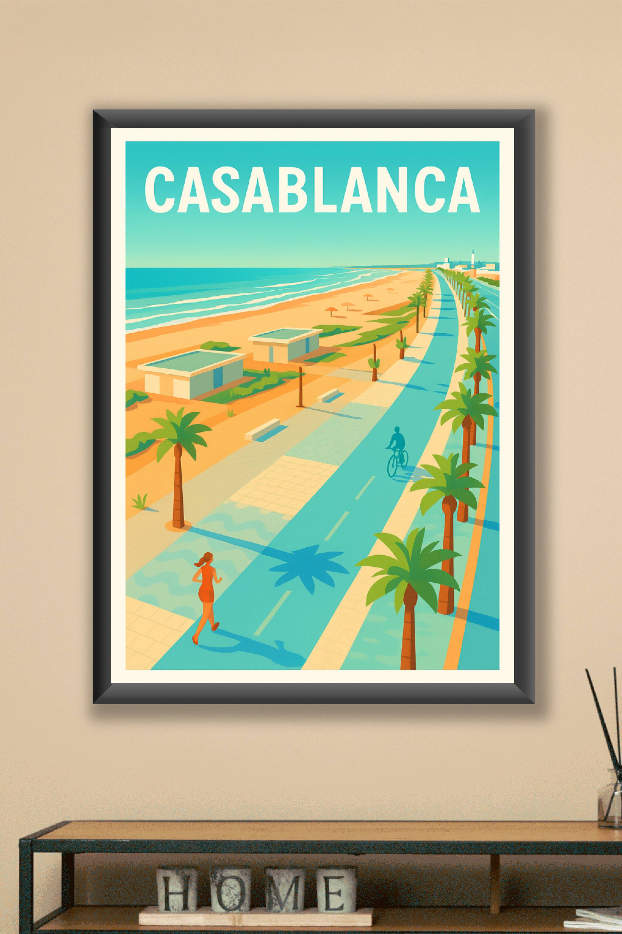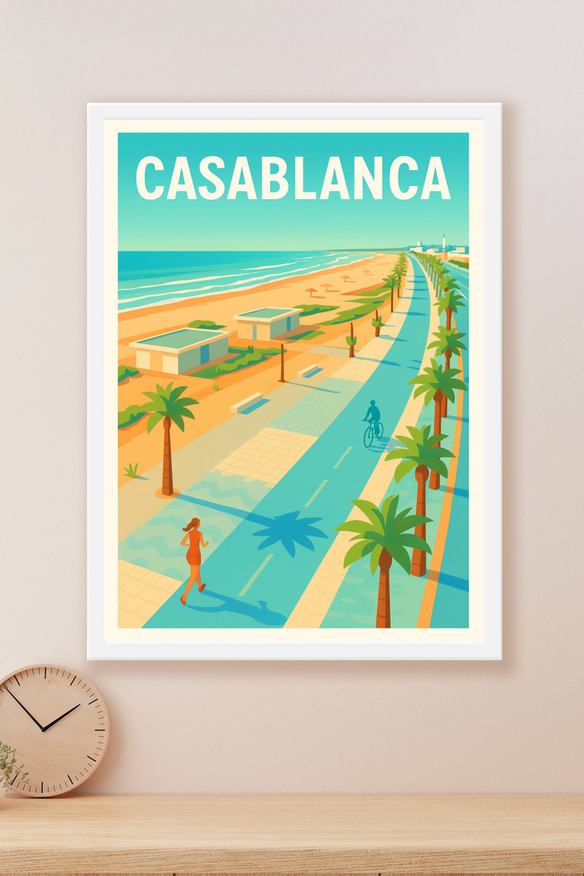 Découvrez la douceur de vivre à Casablanca avec cette affiche illustrant la célèbre corniche et ses plages ensoleillées. Ce poster aux couleurs viv...