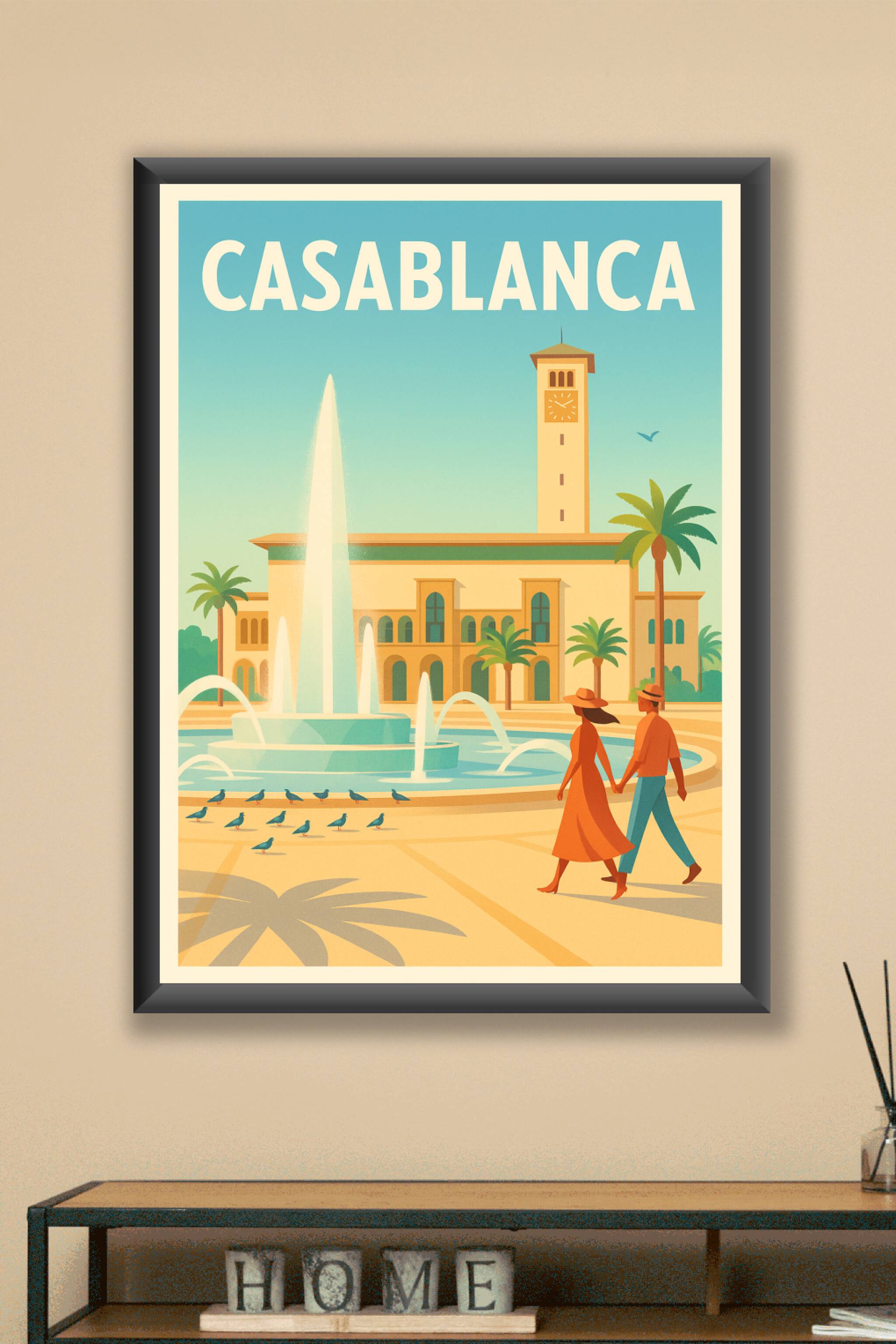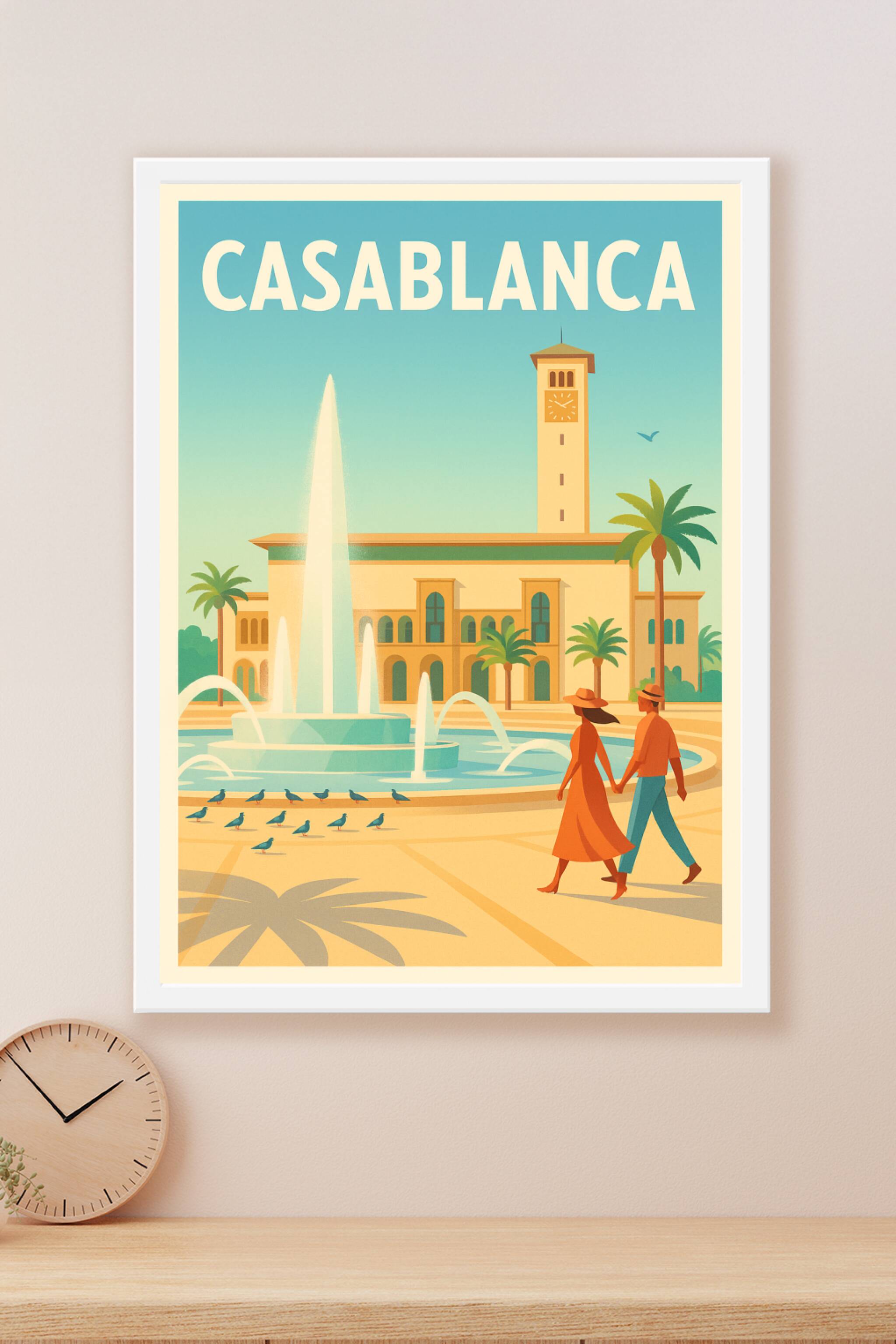 Découvrez l'élégance intemporelle de Casablanca avec cette affiche illustrée représentant la célèbre fontaine et l'architecture emblématique de la ...