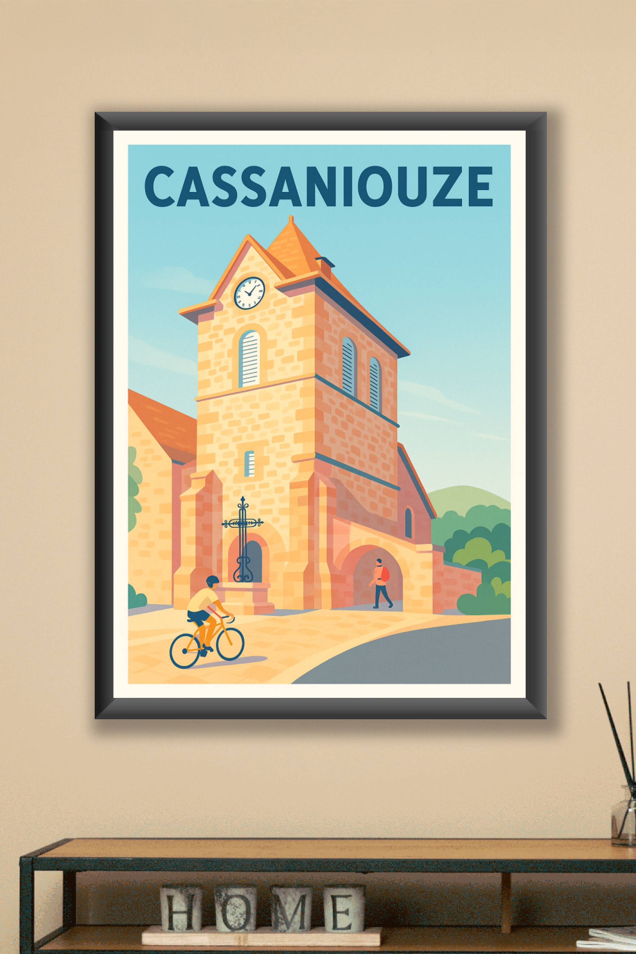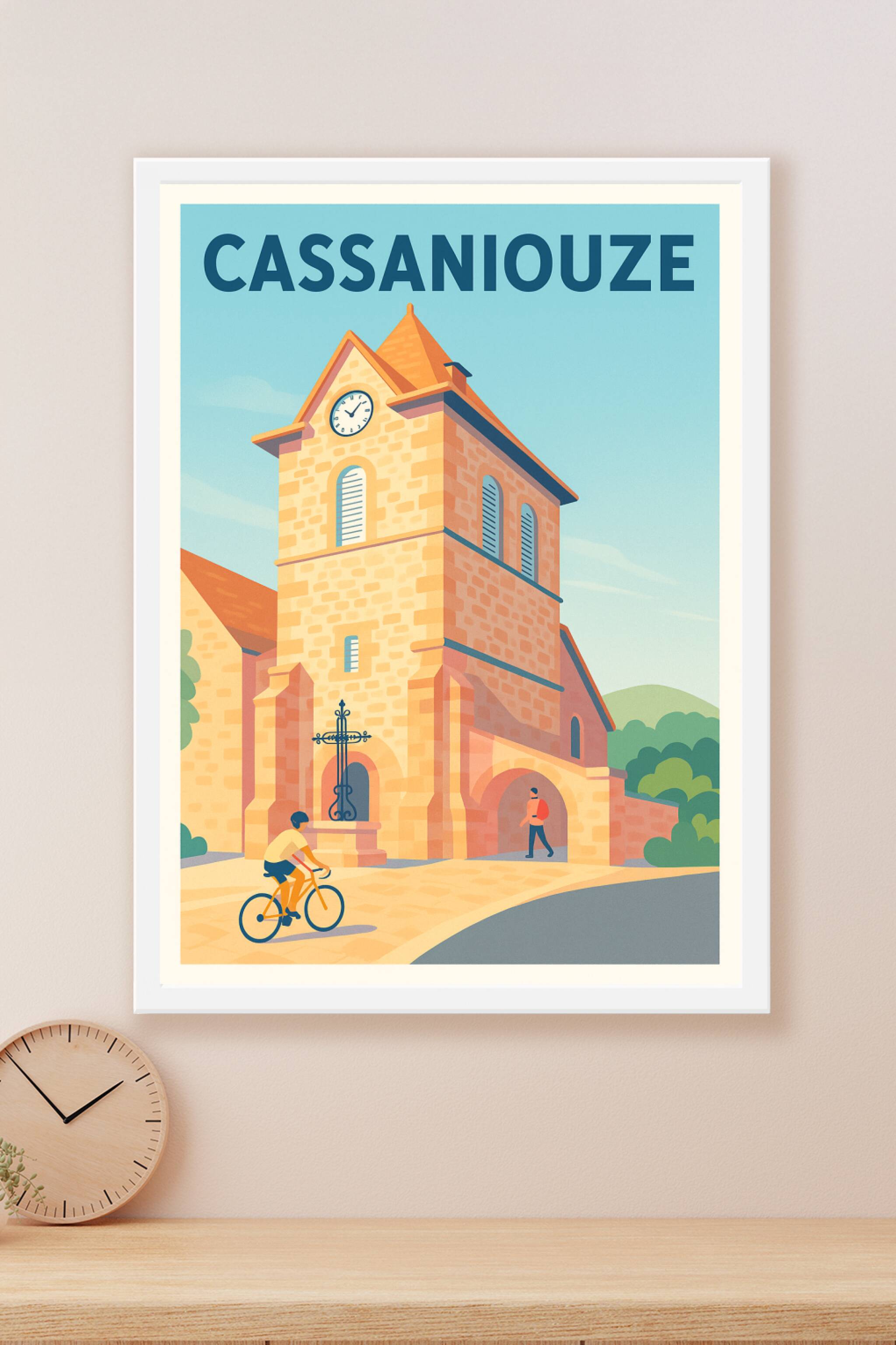 Découvrez l'élégance intemporelle de Cassaniouze à travers cette affiche illustrée, mettant en valeur l'architecture pittoresque et la douceur de v...