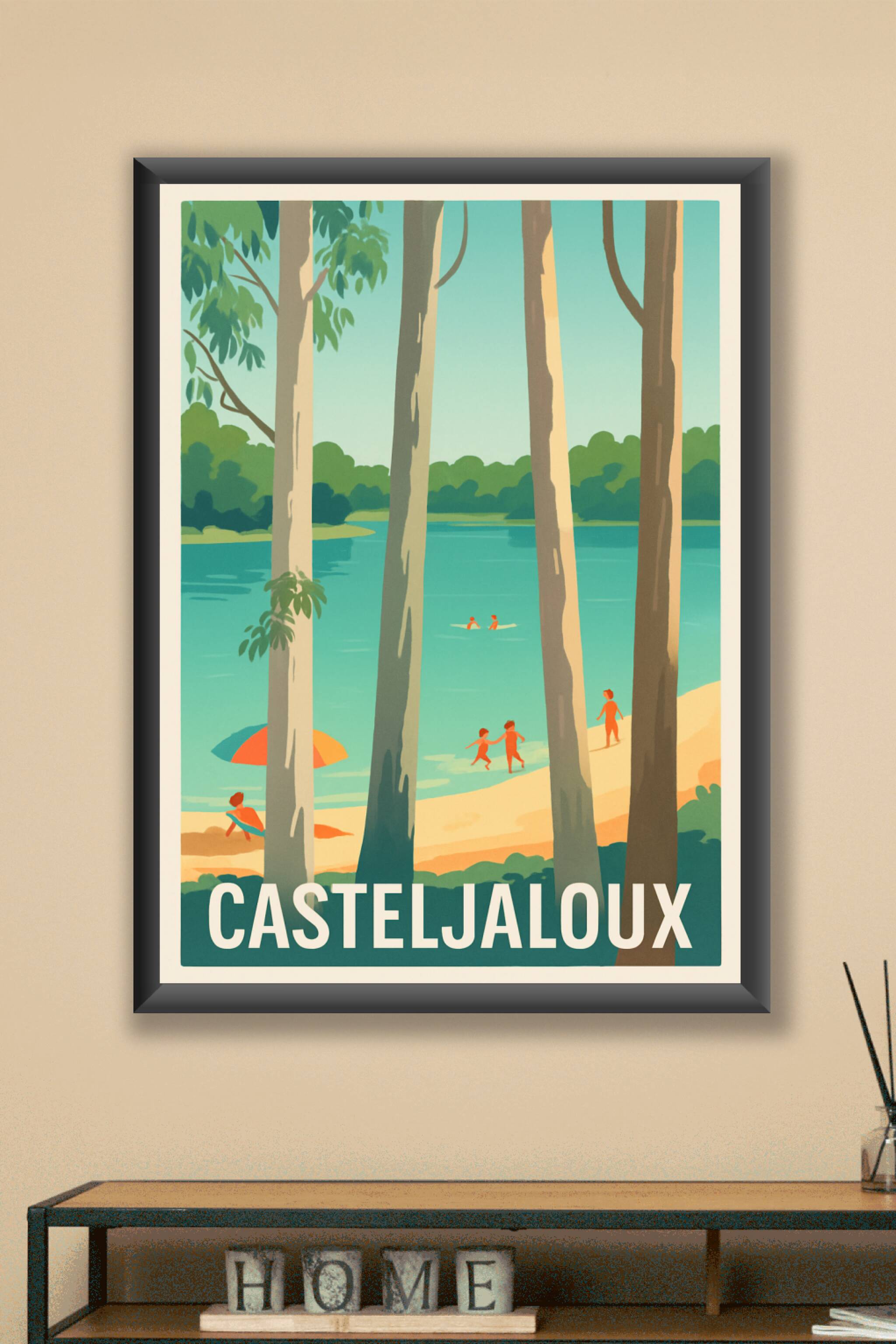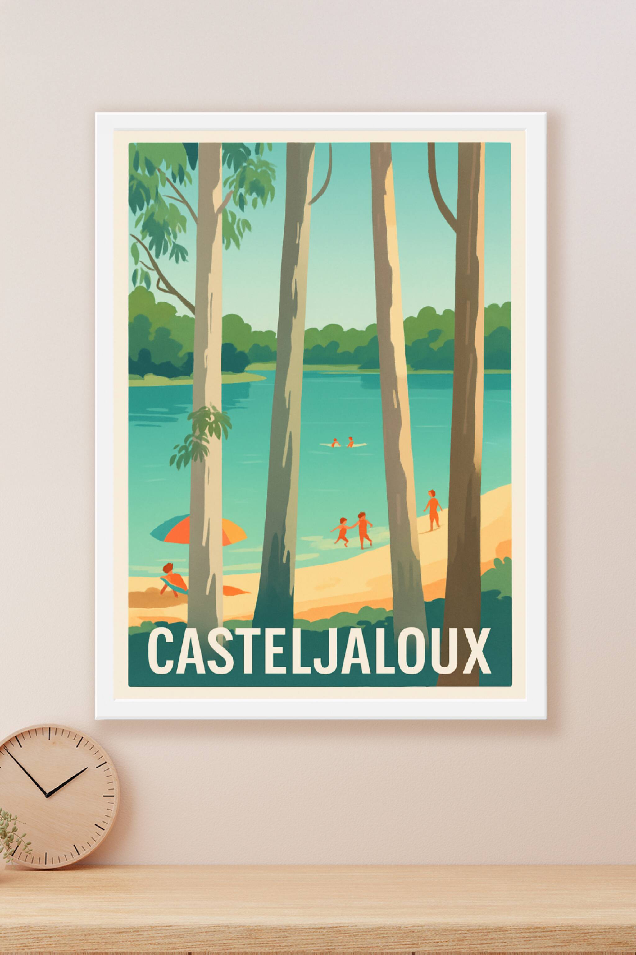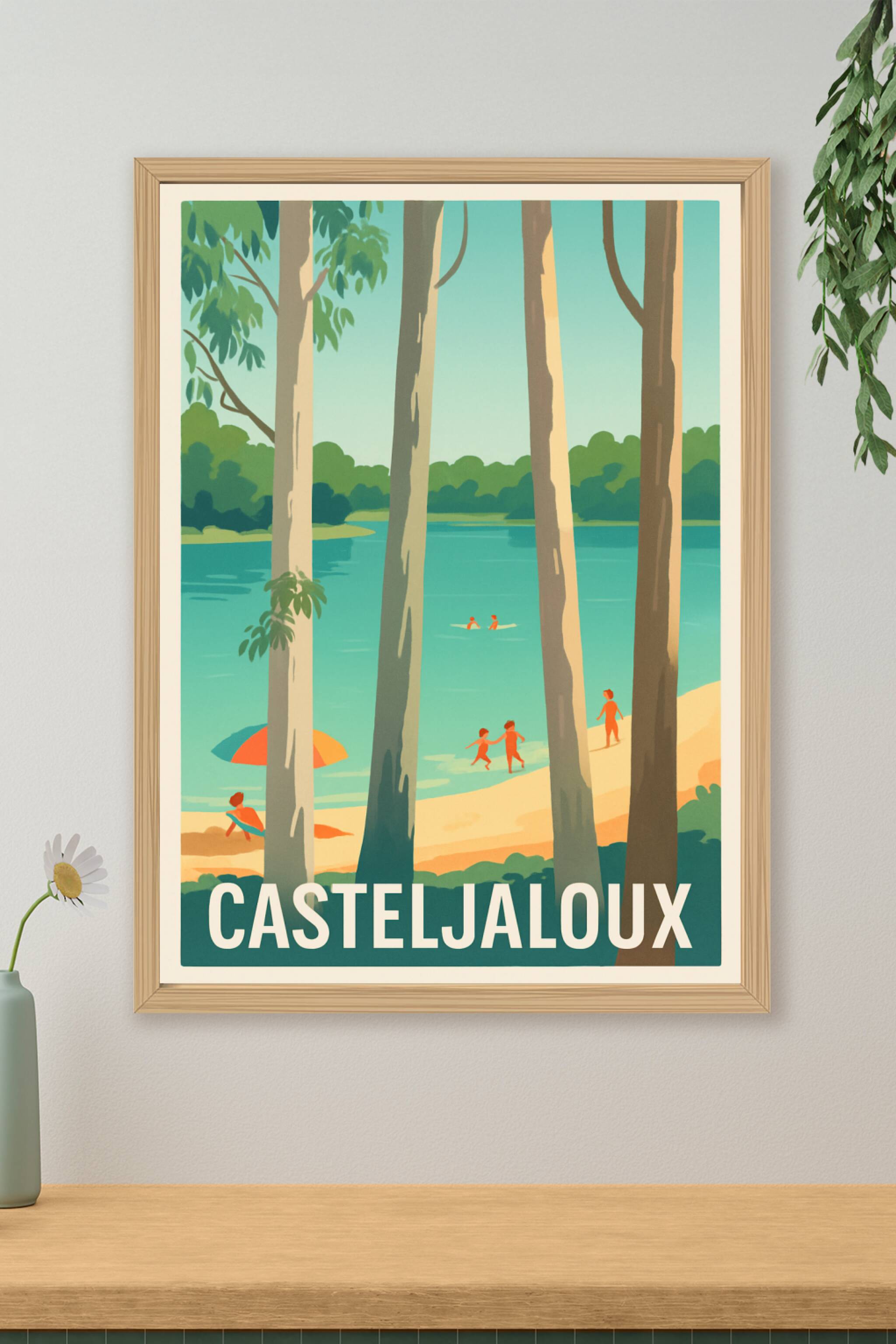 Découvrez la sérénité et la douceur de vivre de Casteljaloux à travers ce poster vintage illustré mettant en scène un lac paisible encadré par de m...