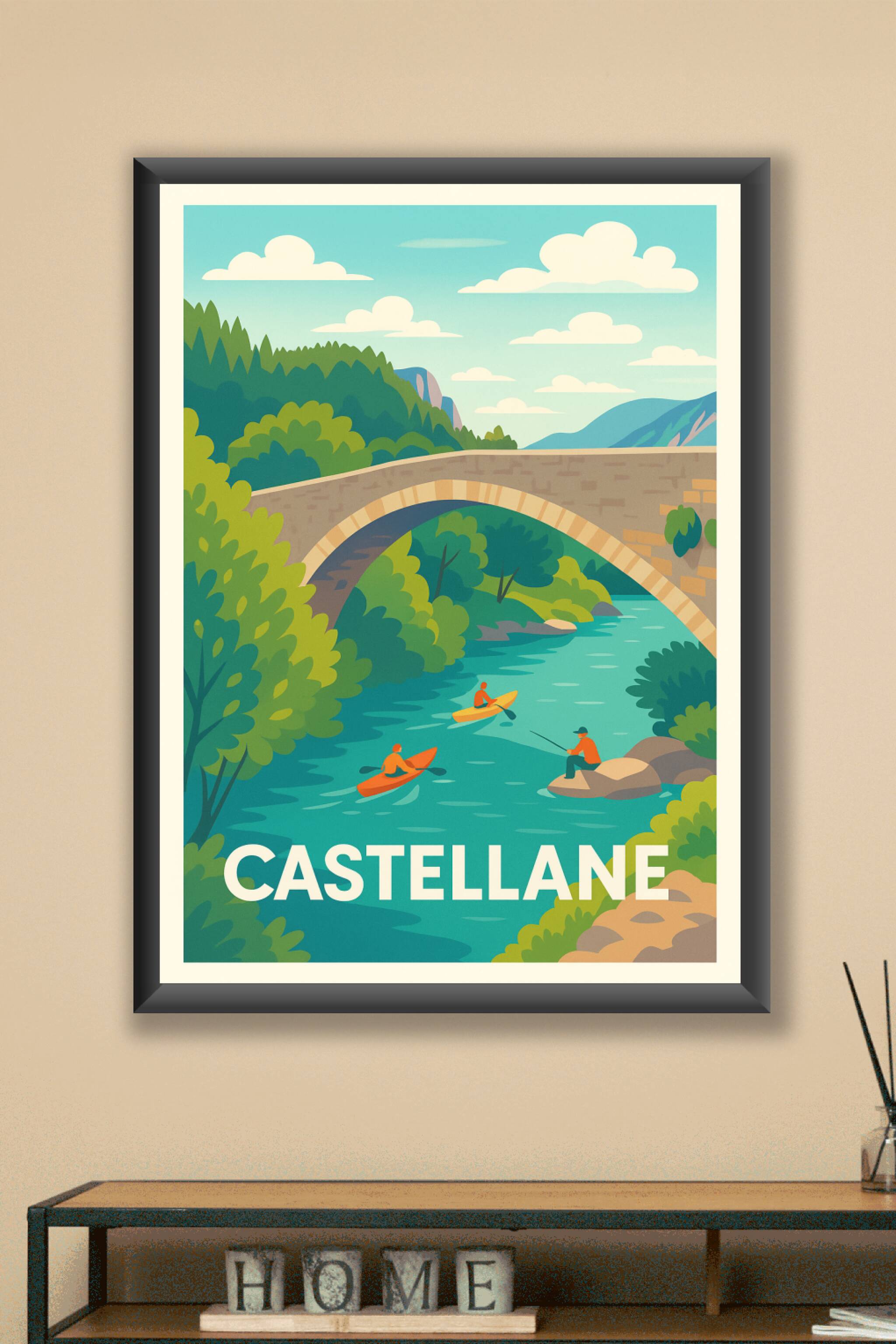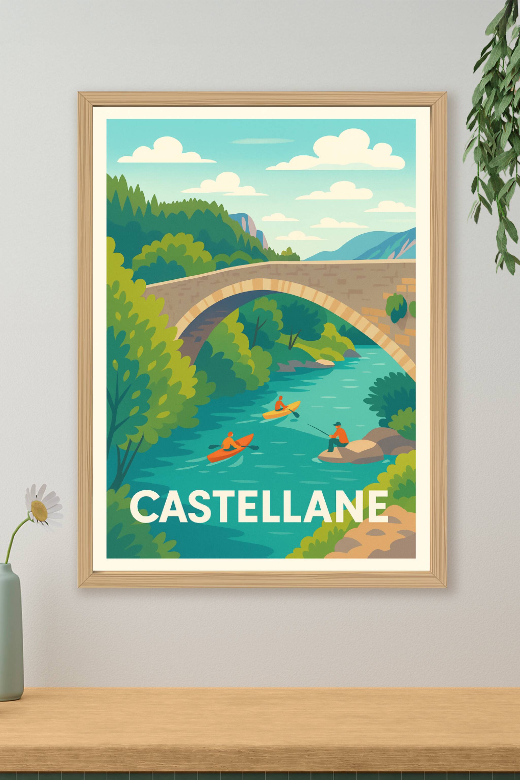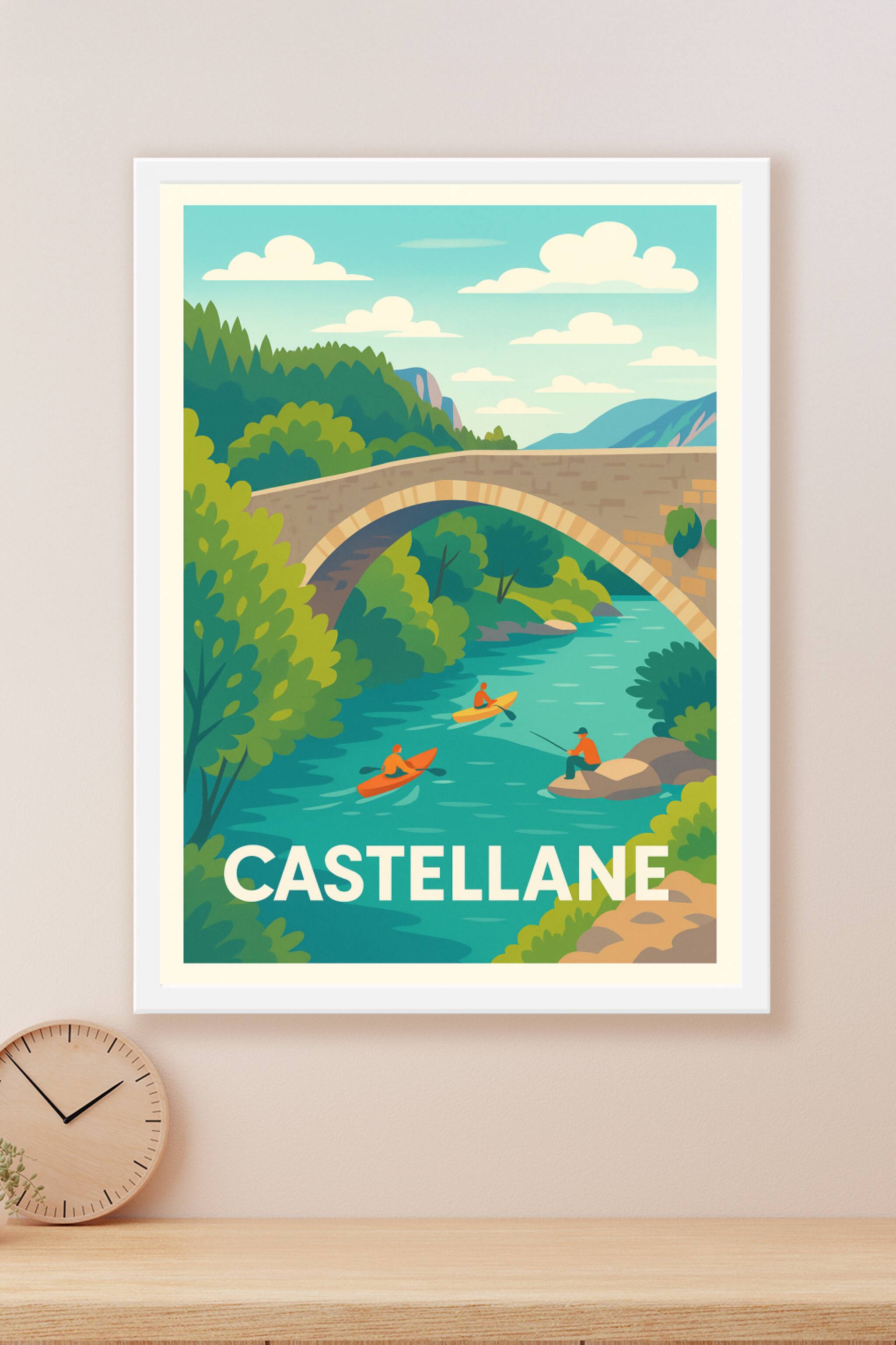 Découvrez la beauté authentique de Castellane avec cette affiche au design épuré qui met en scène un paysage naturel vallonné et une rivière paisible où s'adonnent kayakistes et pêcheur. Ce poster évoque la sérénité et l’aventure en pleine nature, parfait pour les amoureux des grands espaces.Présentée en tirage "Fine Art" sur papier 305g coton, cette affiche garantit une qualité d’impression exceptionnelle, aux couleurs vives et aux détails précis. Disponible en formats A1 à A4, avec ou sans cadre, elle s’intègre facilement à tout type de décoration intérieure.Faites entrer un souffle de nature et de fraîcheur chez vous avec ce poster premium, 100% fabriqué en France, idéal pour décorer votre salon ou offrir un cadeau chaleureux aux passionnés de plein air.