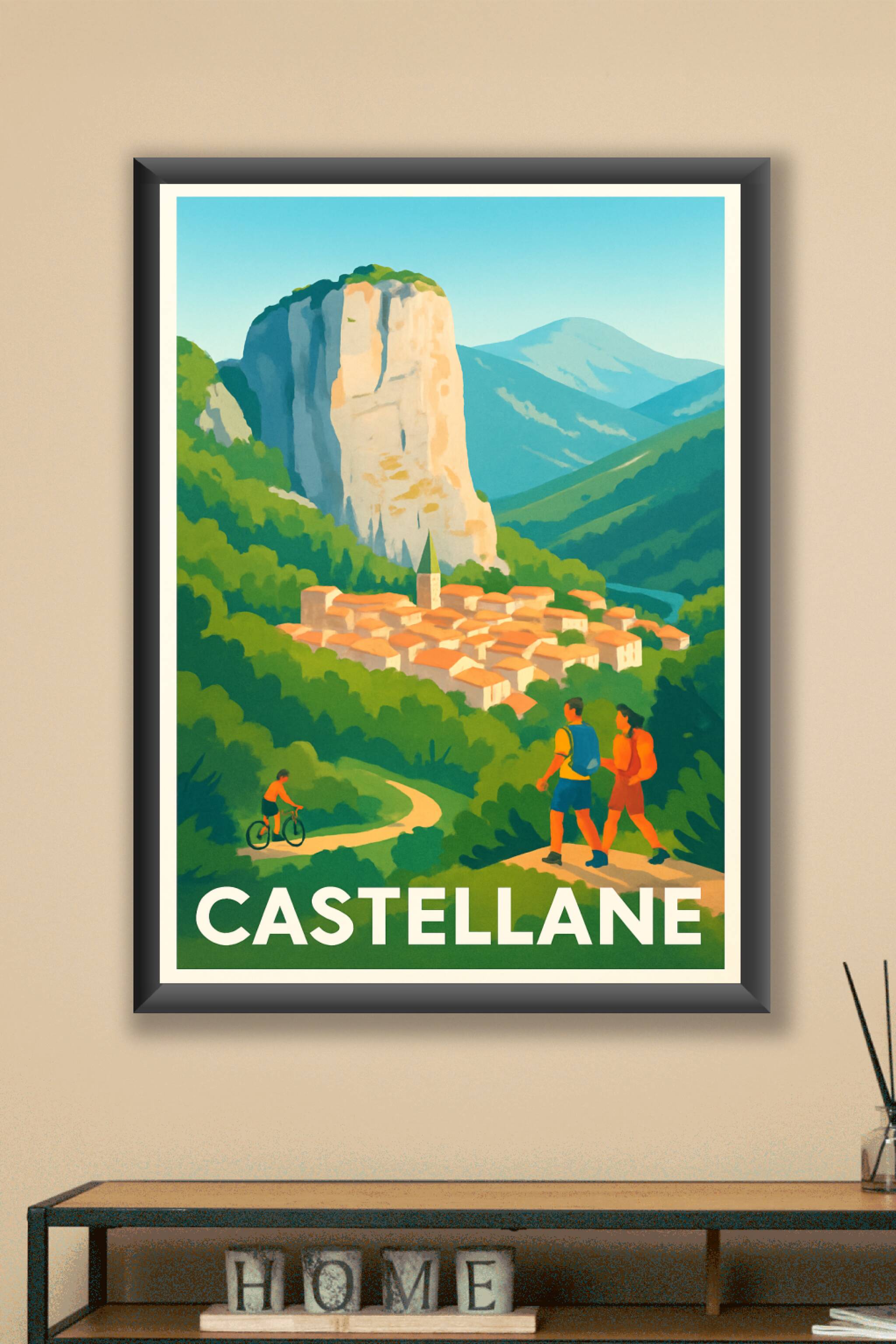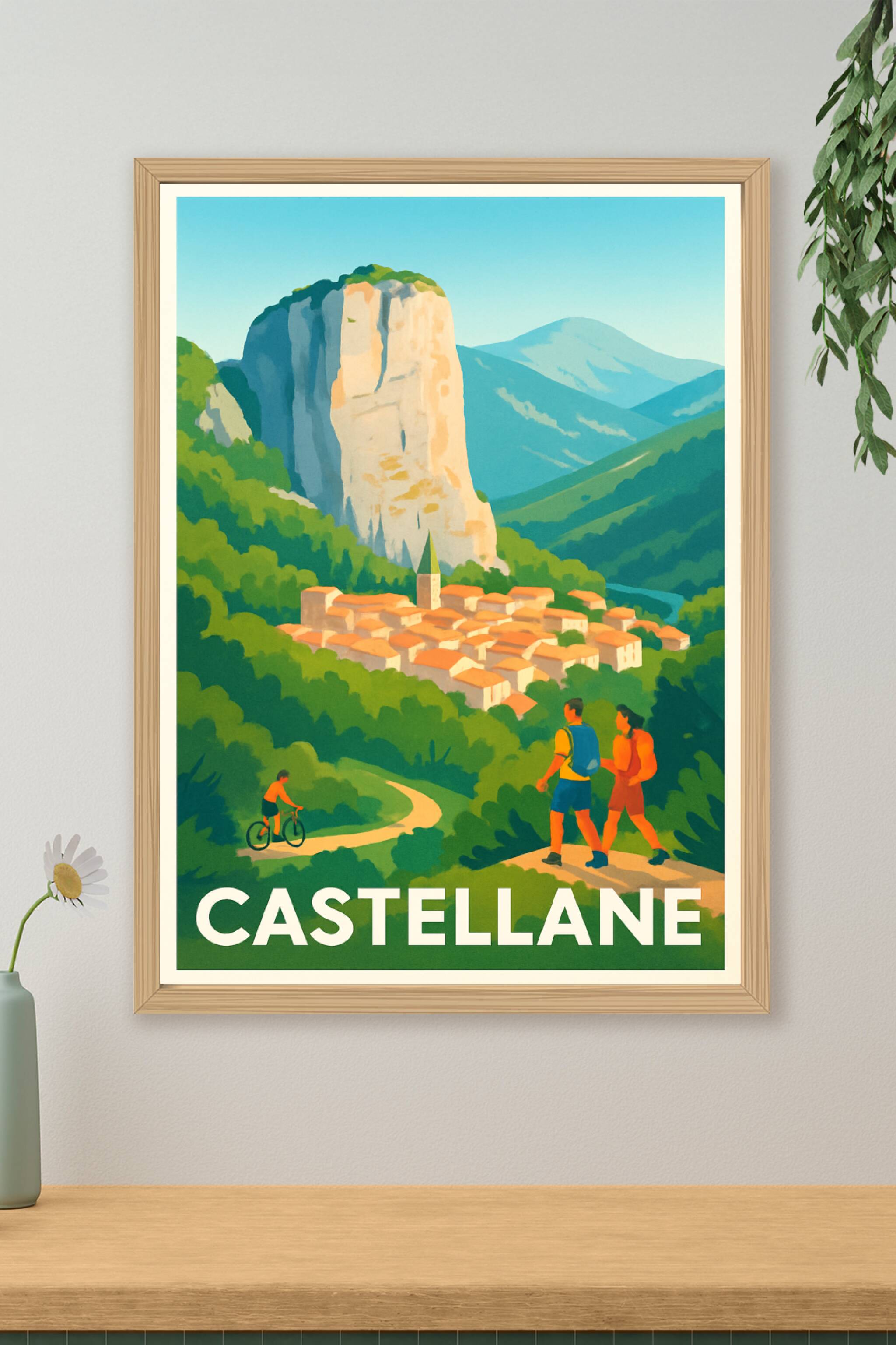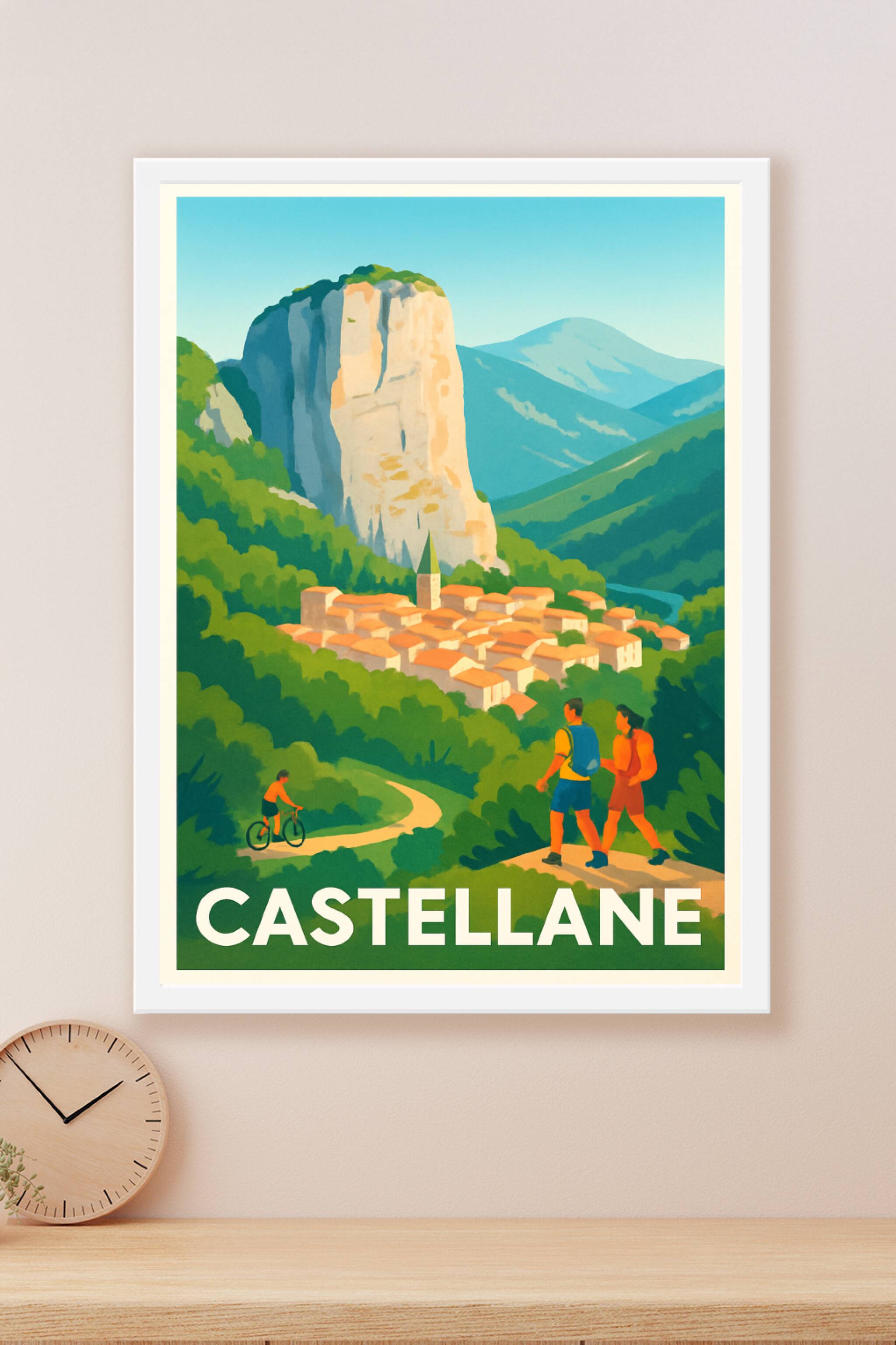 Découvrez la beauté authentique de Castellane à travers ce poster vintage qui met en avant ses paysages emblématiques et son village niché au pied ...