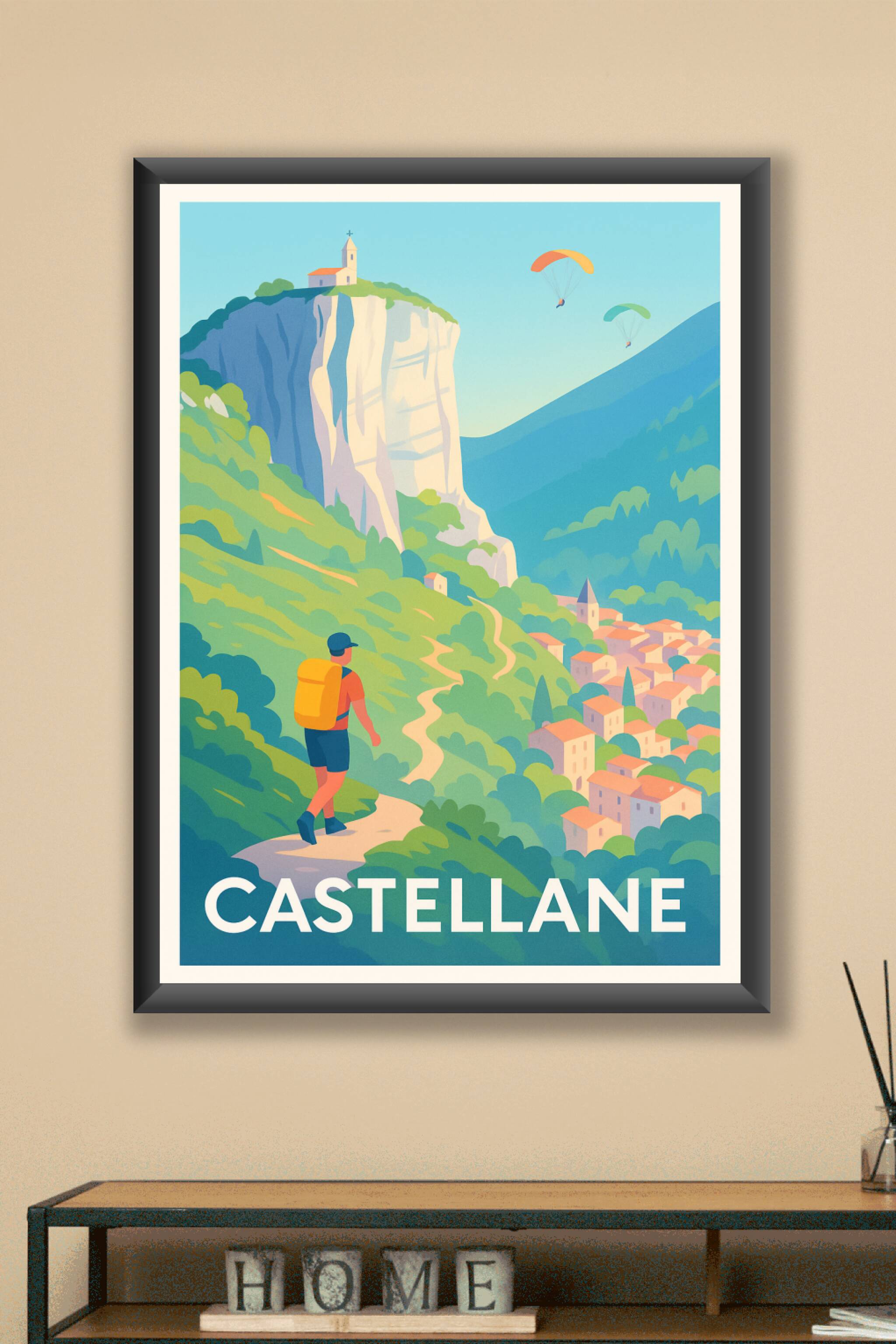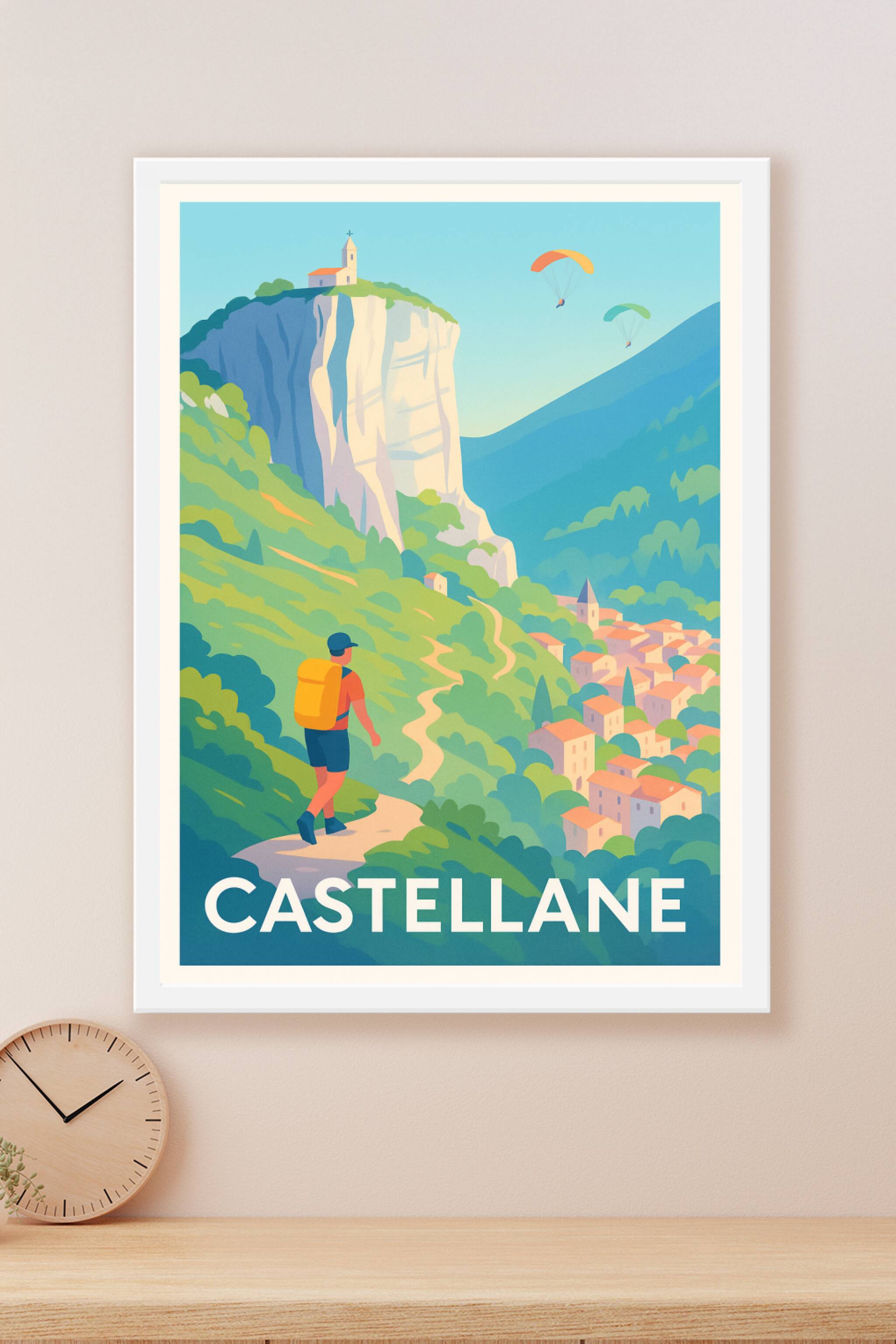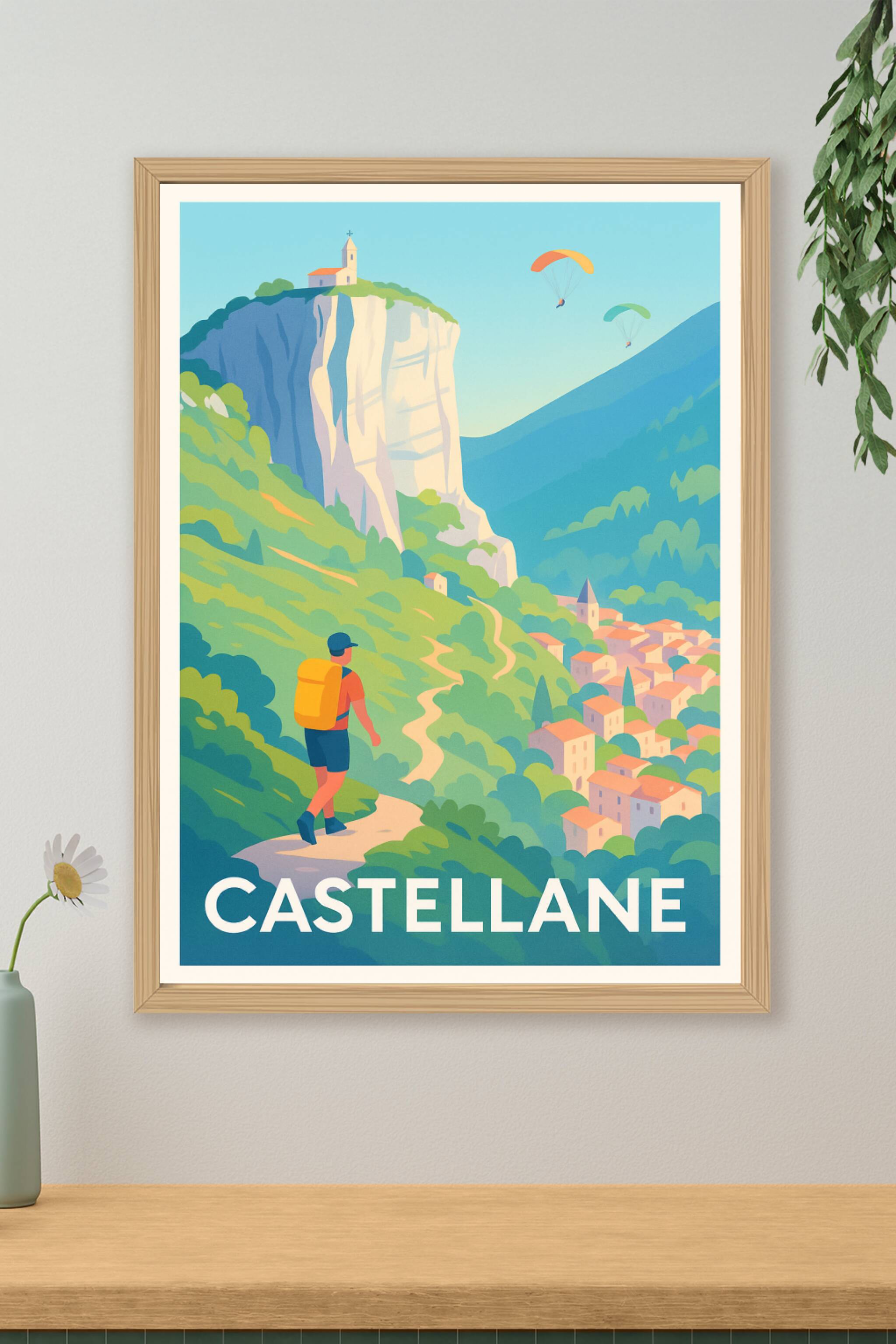 Découvrez la beauté authentique de Castellane avec cette affiche aux couleurs douces et inspirantes, illustrant un randonneur admirant la vue sur l...