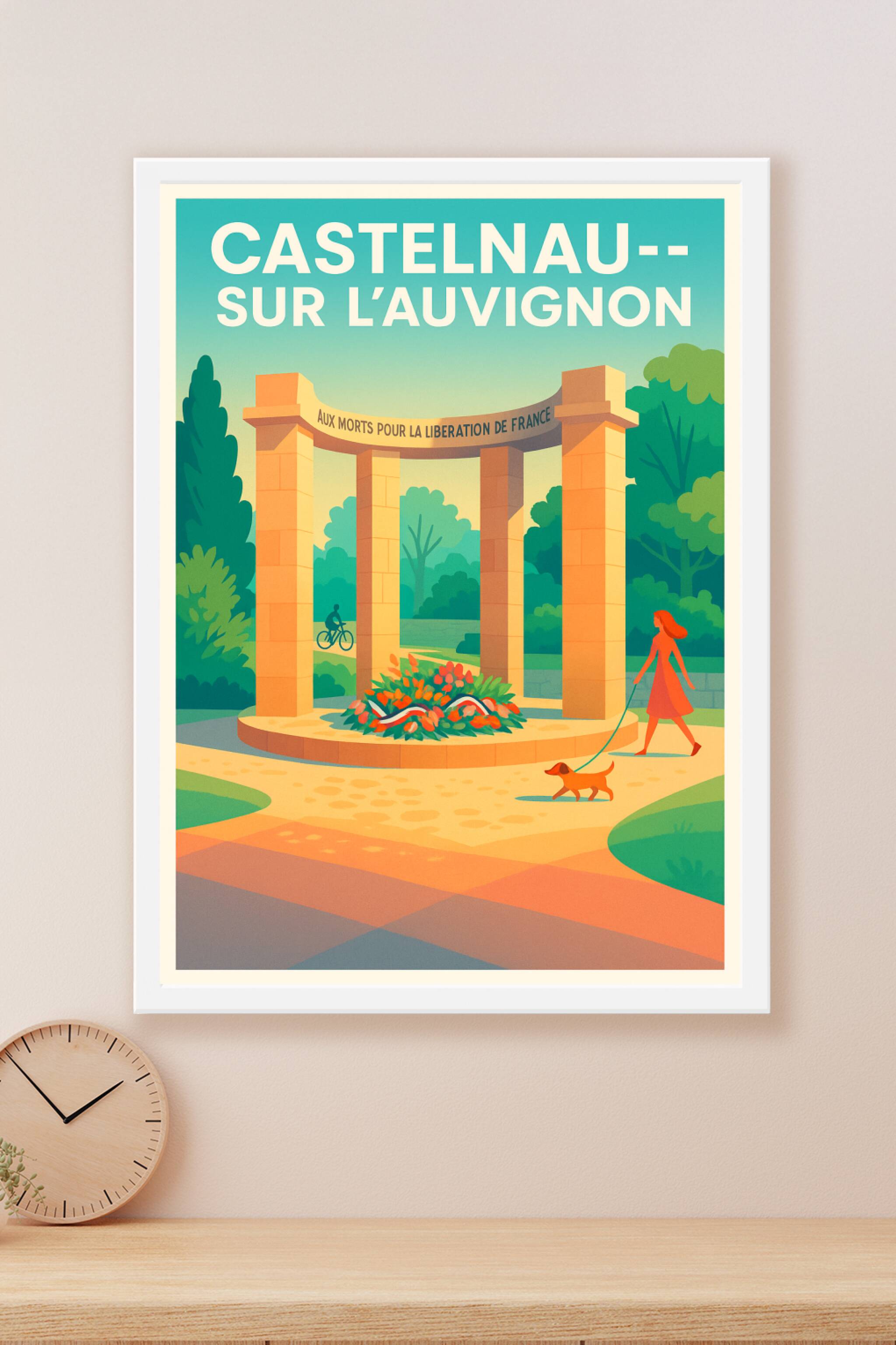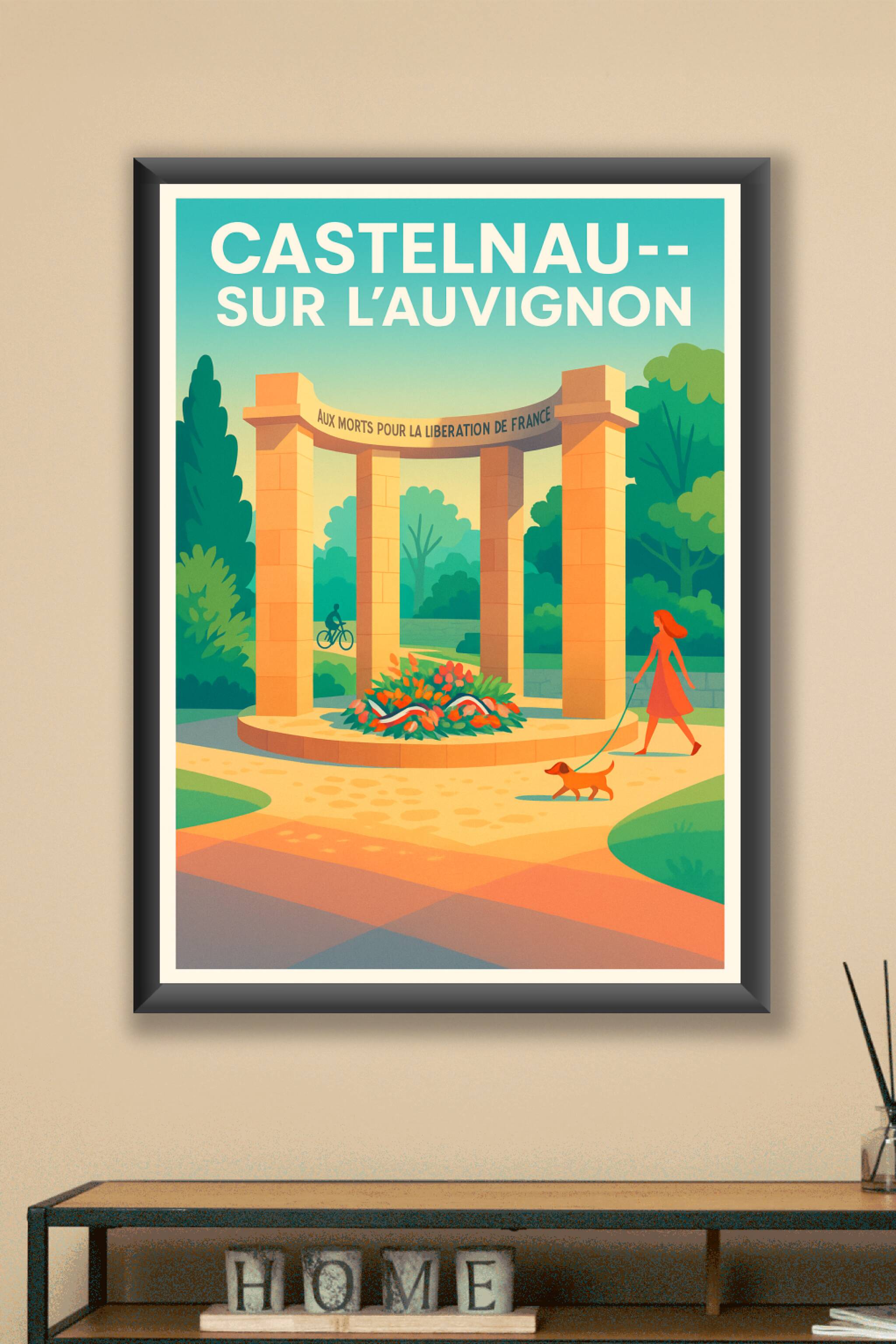 Découvrez cette affiche artistique illustrant un monument commémoratif entouré d'une nature paisible à Castelnau-sur-l'Auvignon. Ce poster capture ...