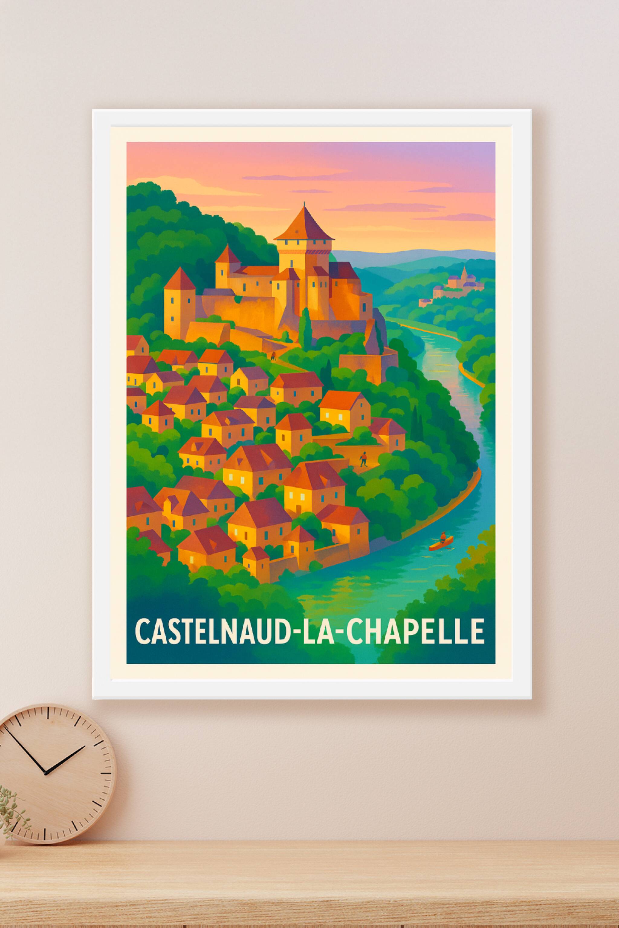 Découvrez la beauté médiévale de Castelnaud-la-Chapelle avec cette affiche illustrant son célèbre château perché surplombant la rivière. Les maison...