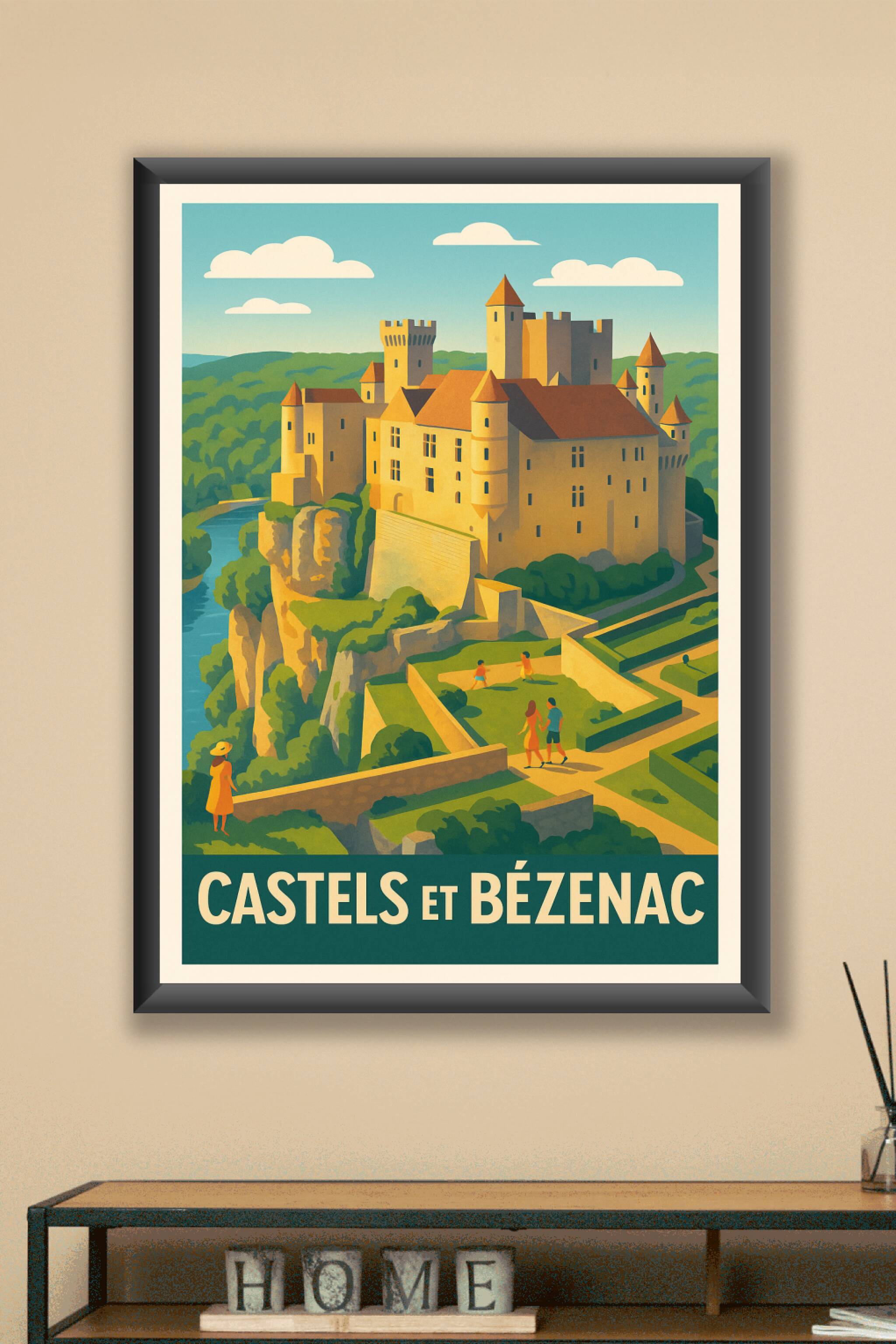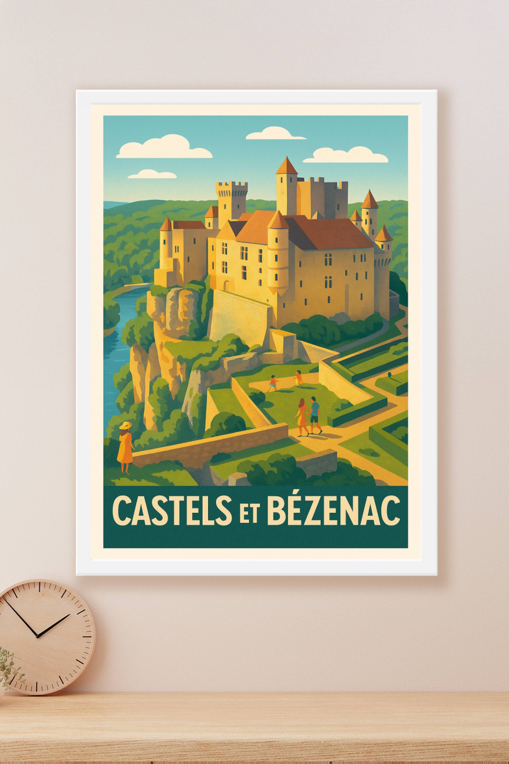 Découvrez le charme intemporel de Castels et Bézenac avec cette affiche illustrée qui capture la majesté d'un château médiéval perché sur les falai...