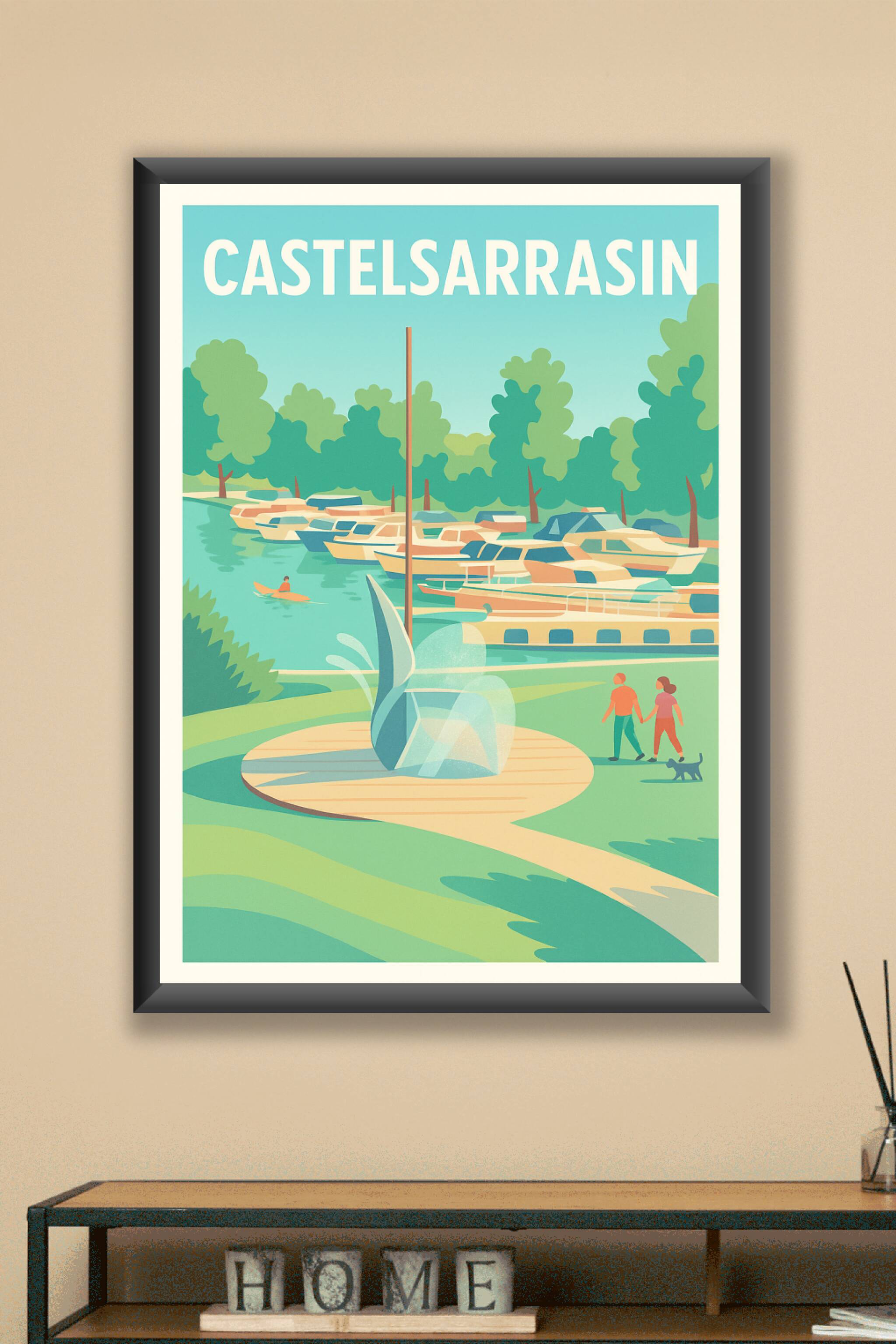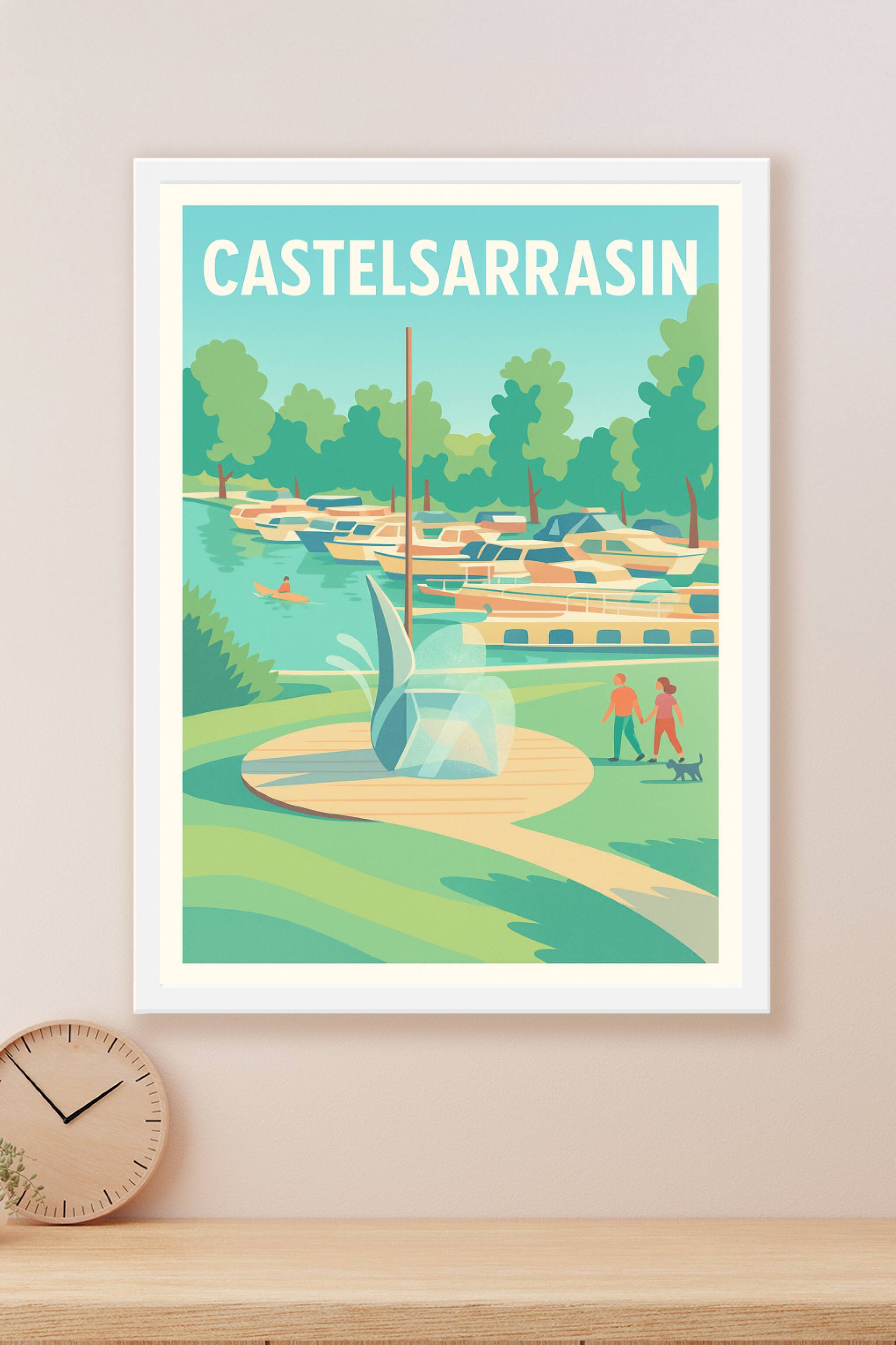 Découvrez la sérénité de Castelsarrasin avec ce poster illustré mettant en scène une promenade tranquille au bord du canal, entourée de bateaux ama...