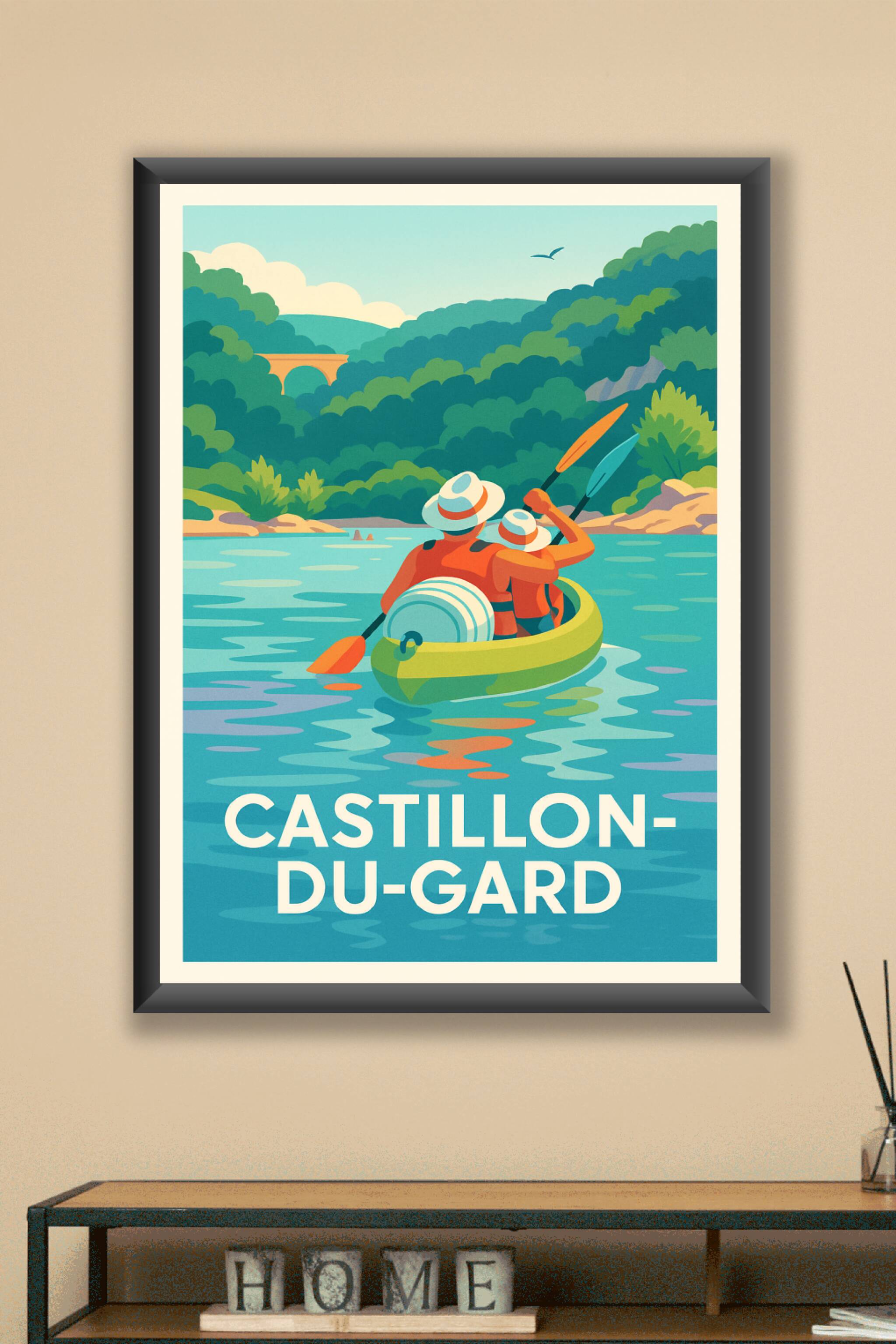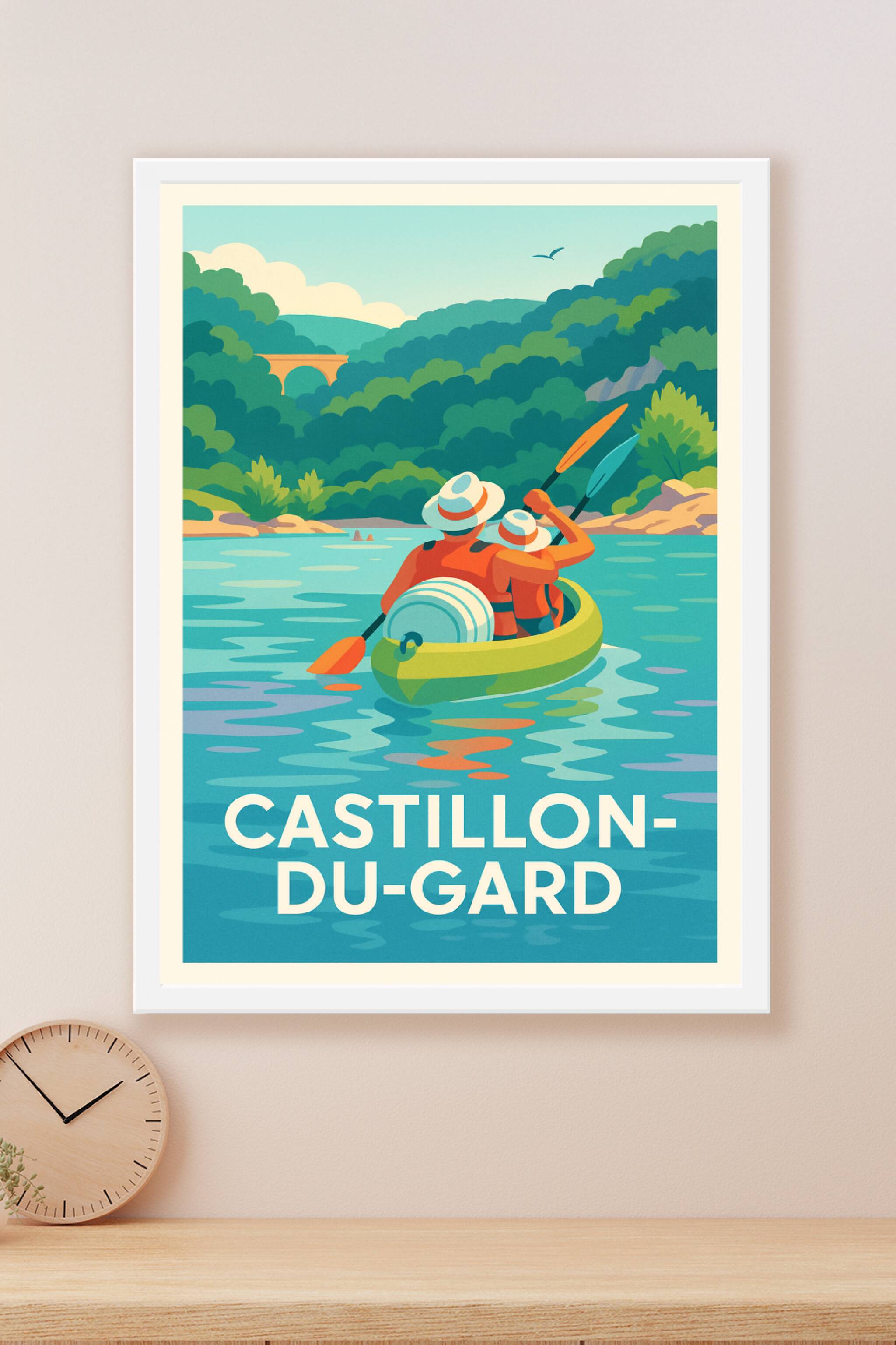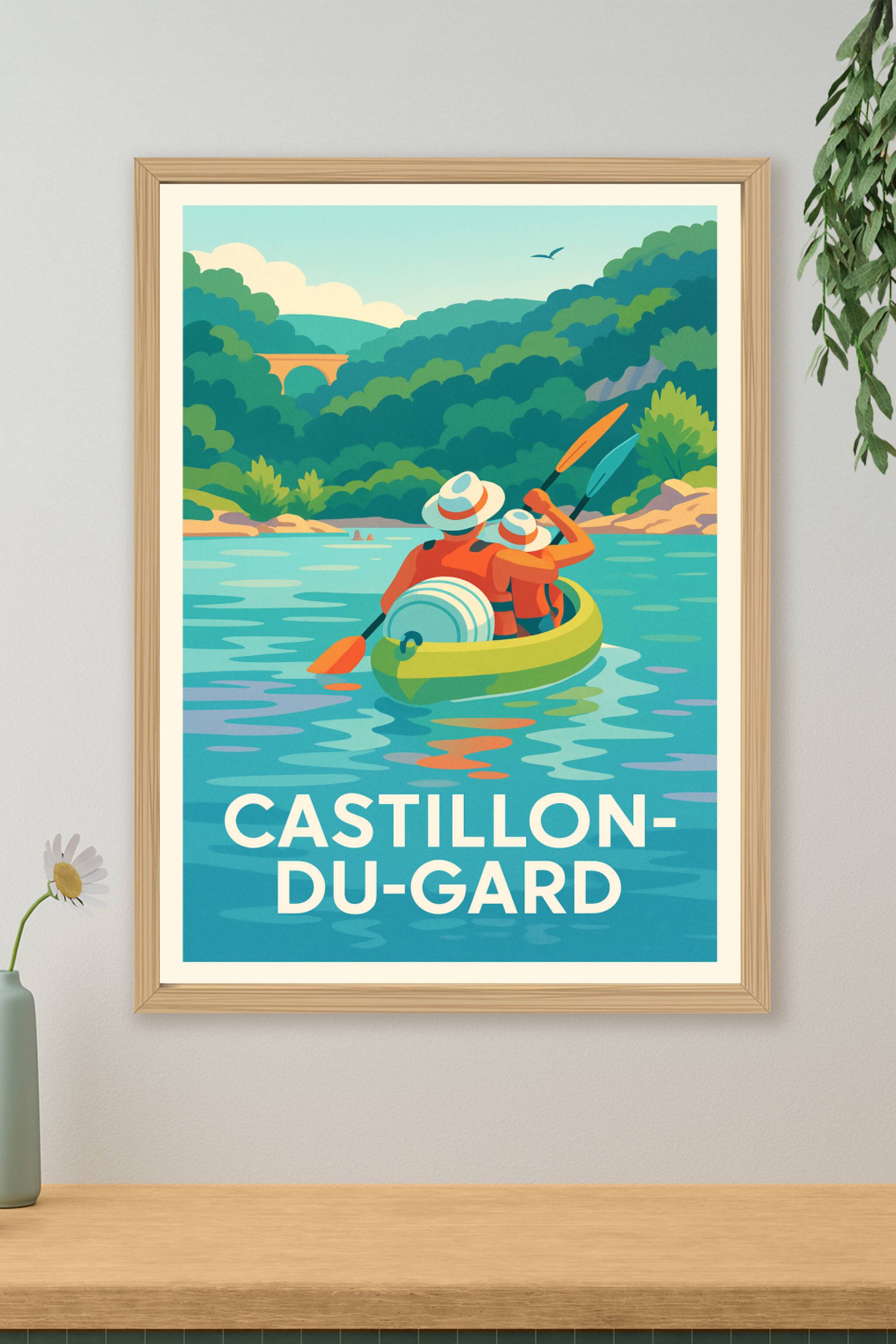 Découvrez la sérénité et la beauté naturelle de Castillon-du-Gard avec cette affiche illustrée représentant une balade en canoë sur des eaux paisib...