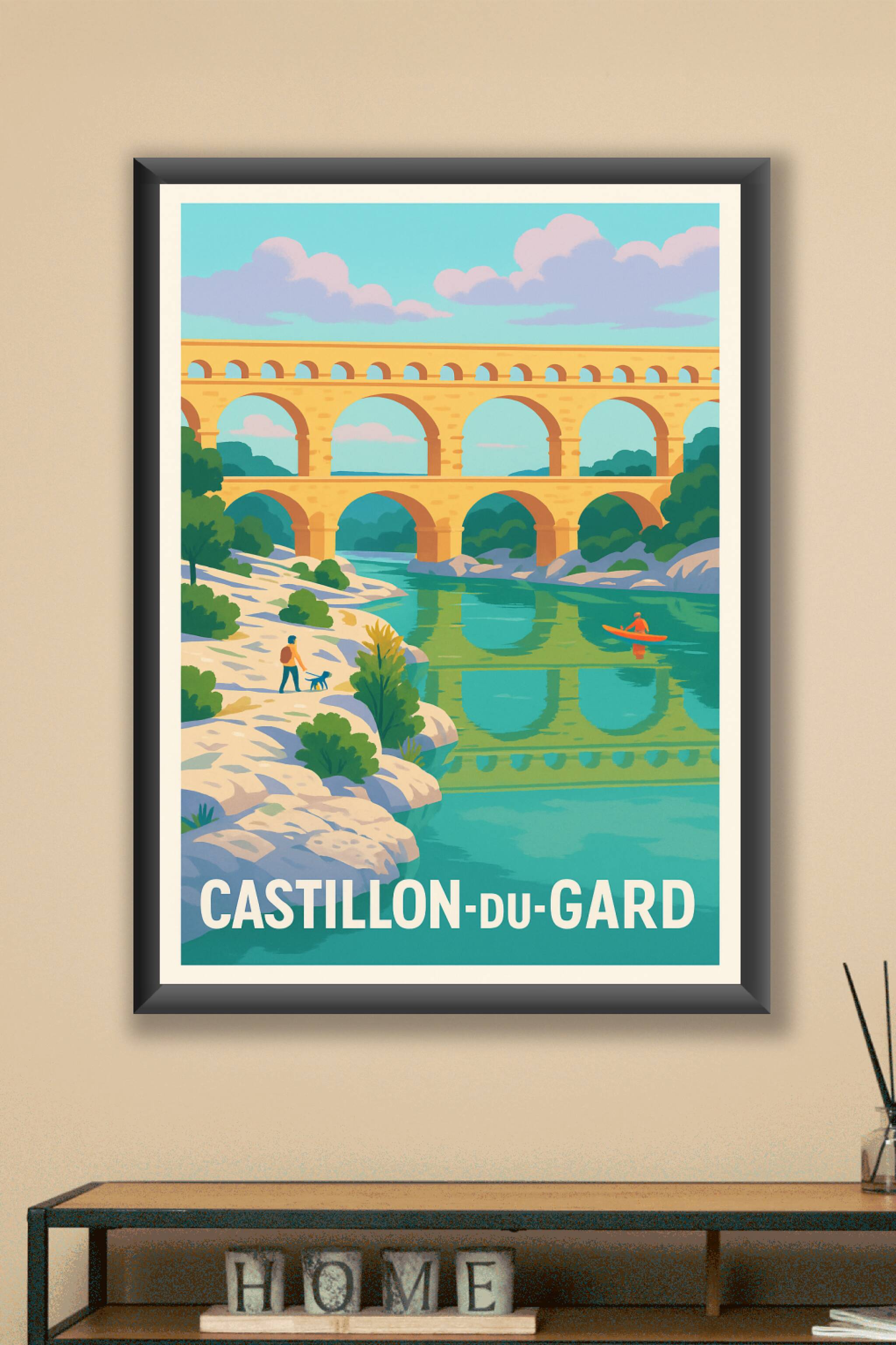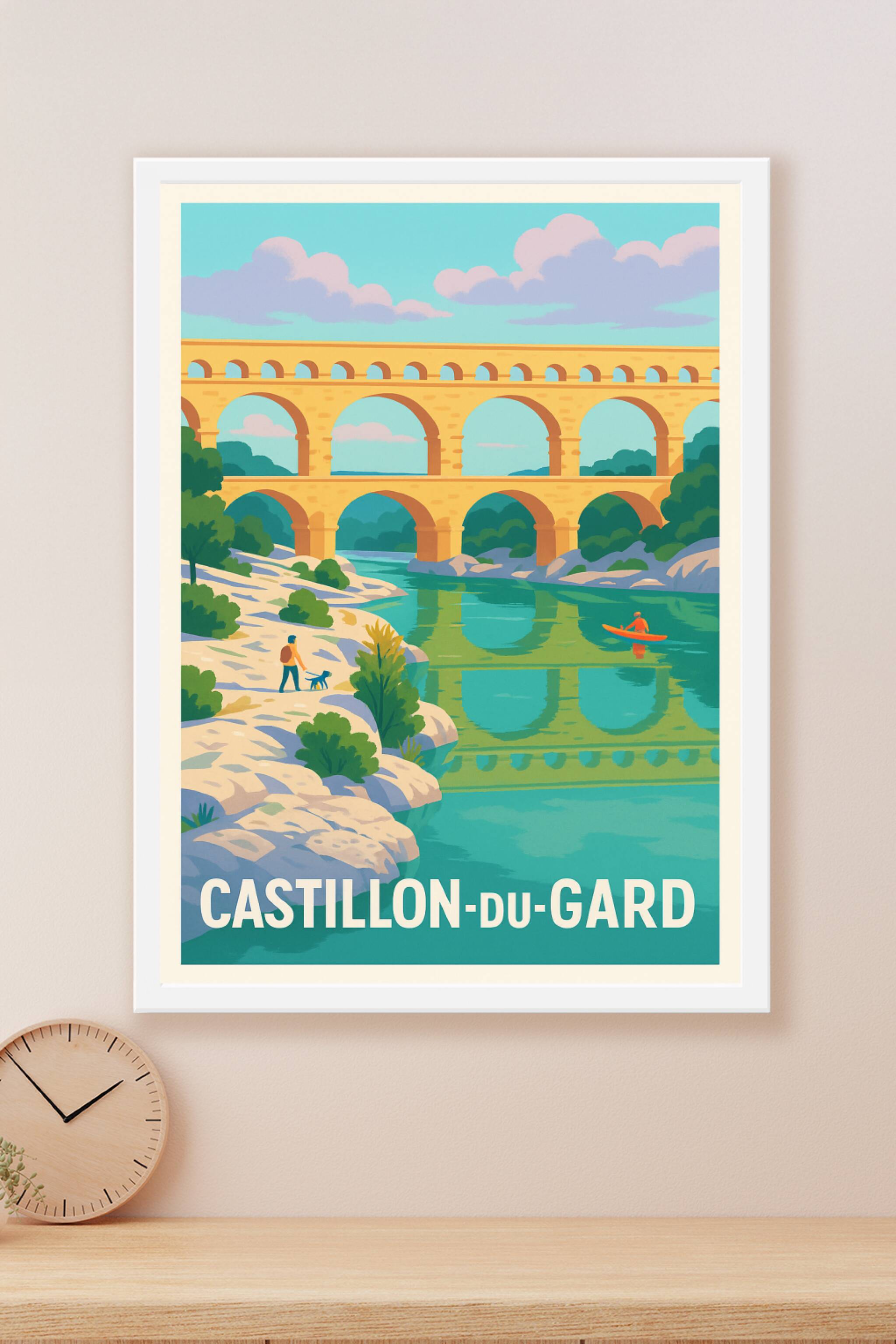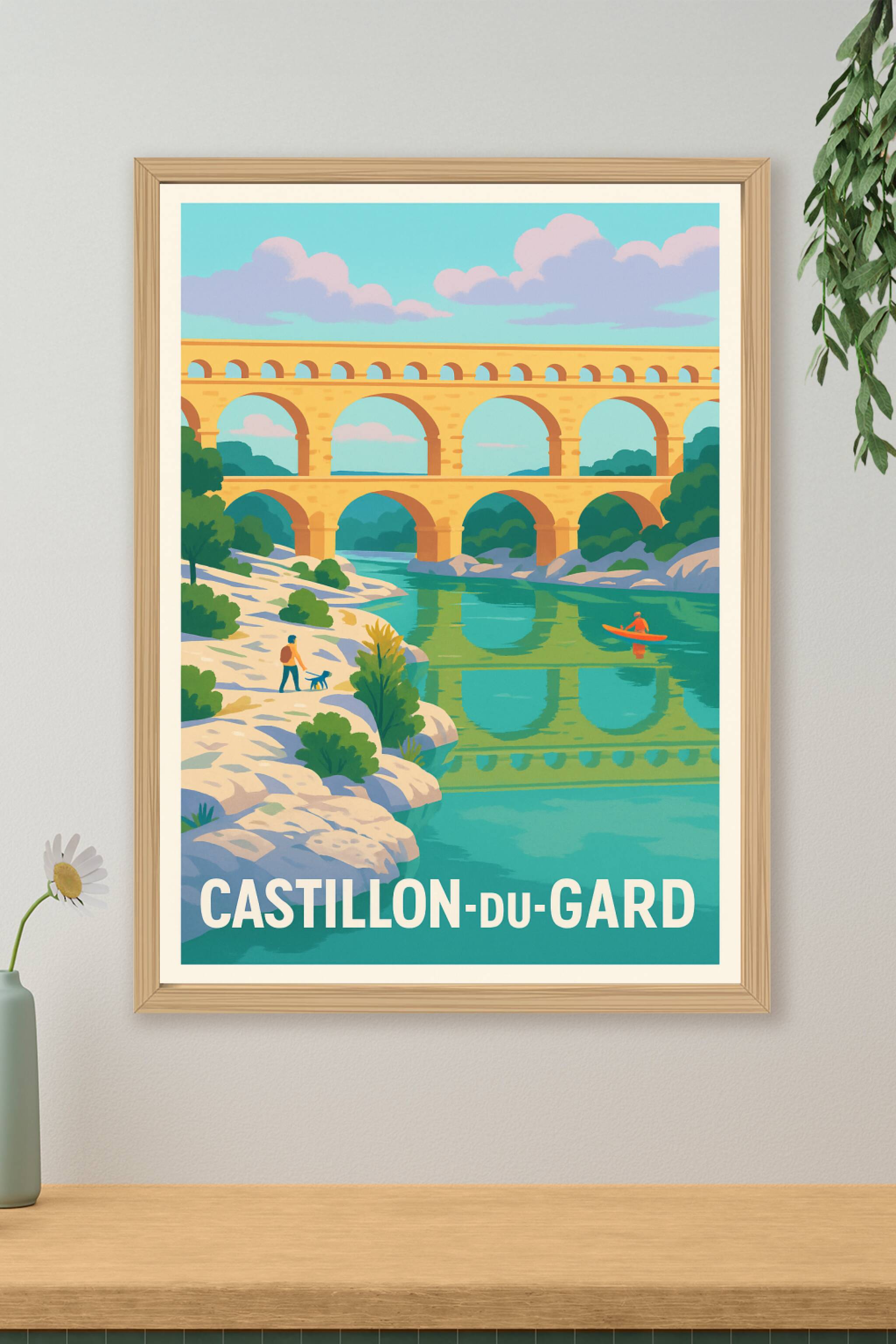 Découvrez la sérénité de Castillon-du-Gard avec cette affiche illustrée mettant en scène le célèbre aqueduc romain dans un paysage apaisant où se m...