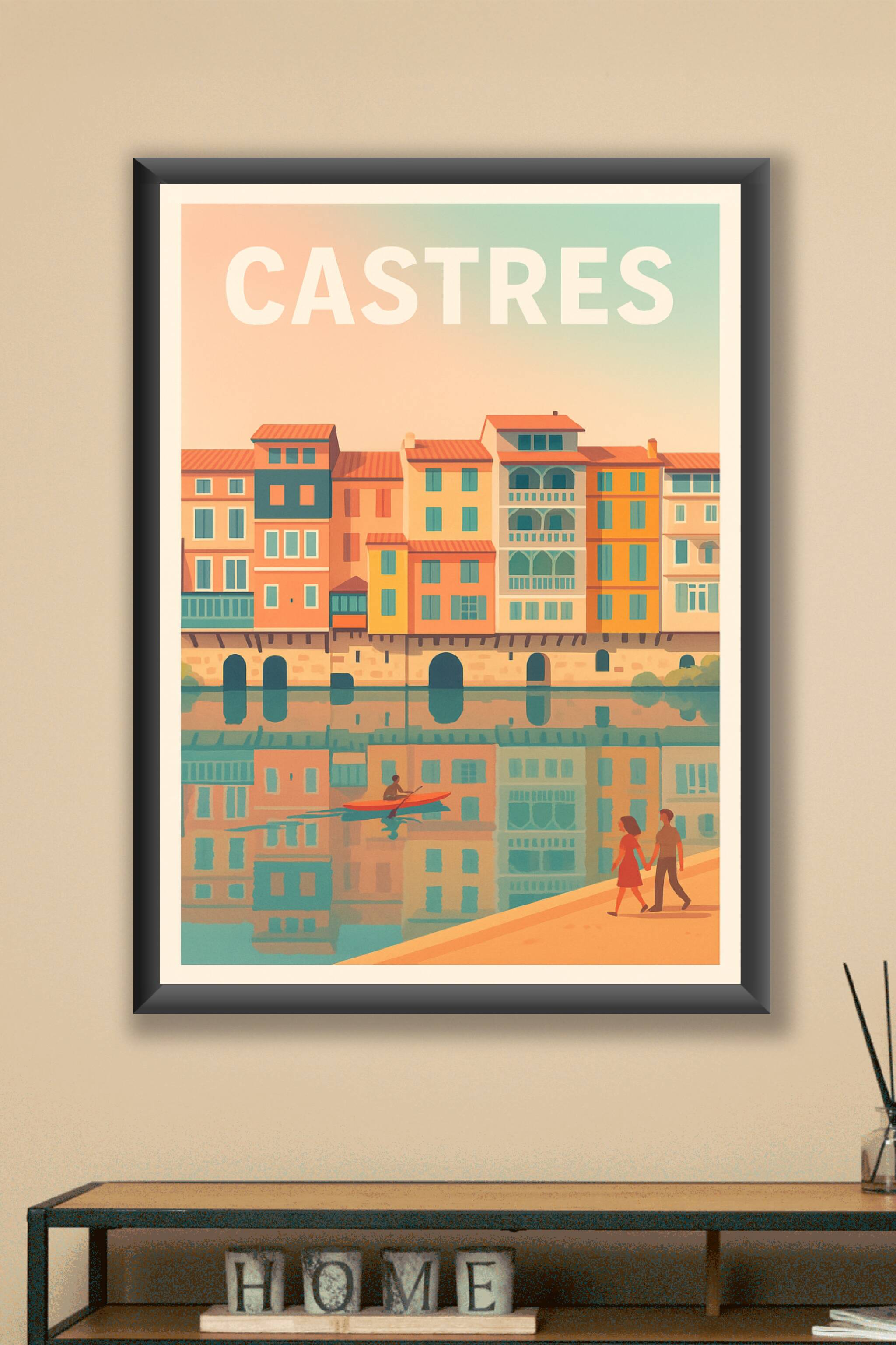 Découvrez cette magnifique affiche illustrant les façades colorées de Castres se reflétant paisiblement sur l'eau. Cette scène chaleureuse, avec un...