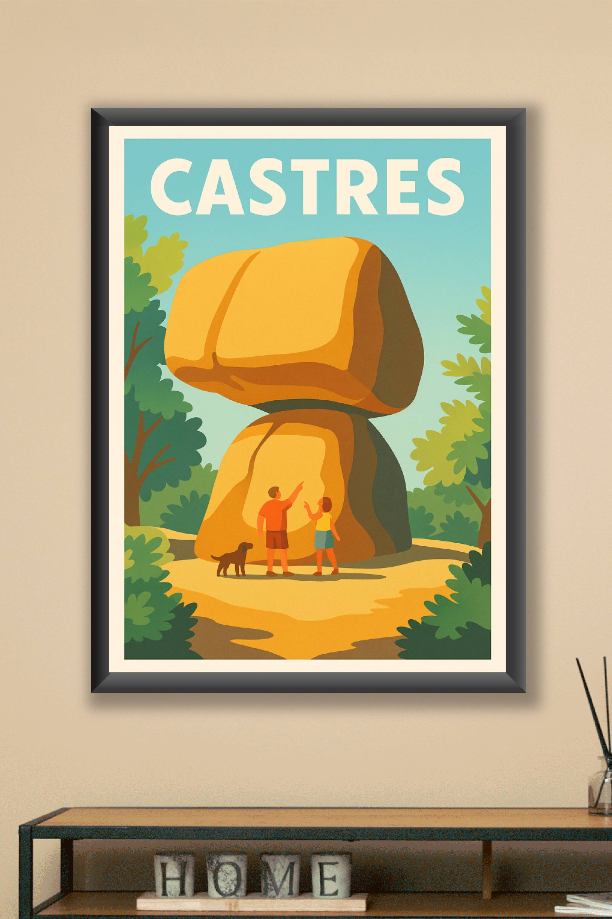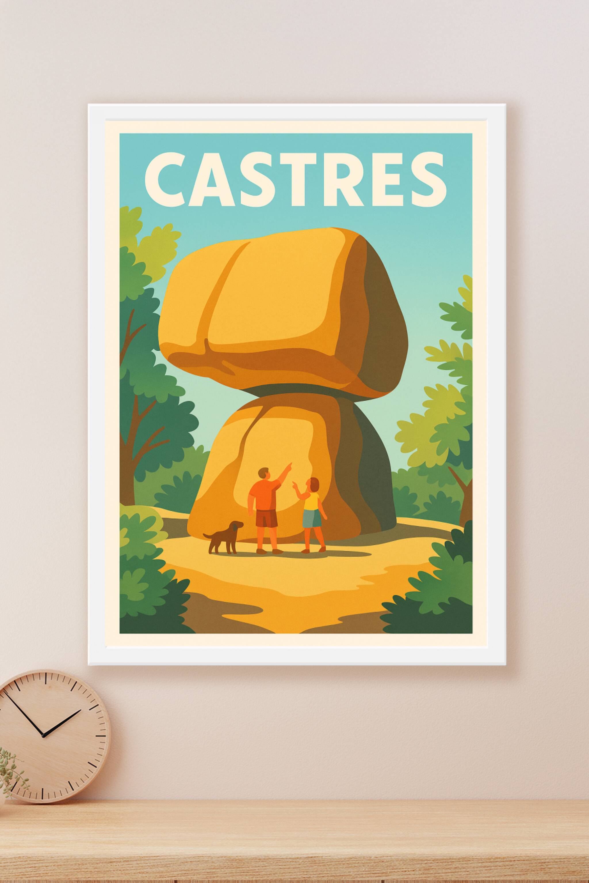 Découvrez la beauté unique de Castres à travers cette affiche illustrée mettant en avant ses célèbres formations rocheuses dans un cadre verdoyant....