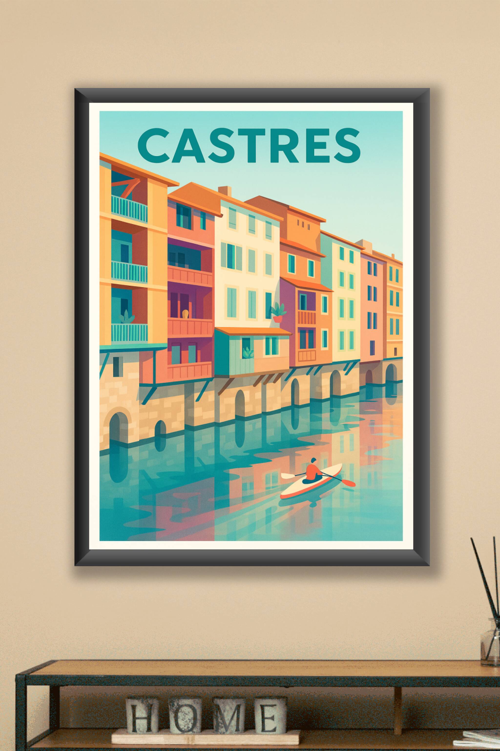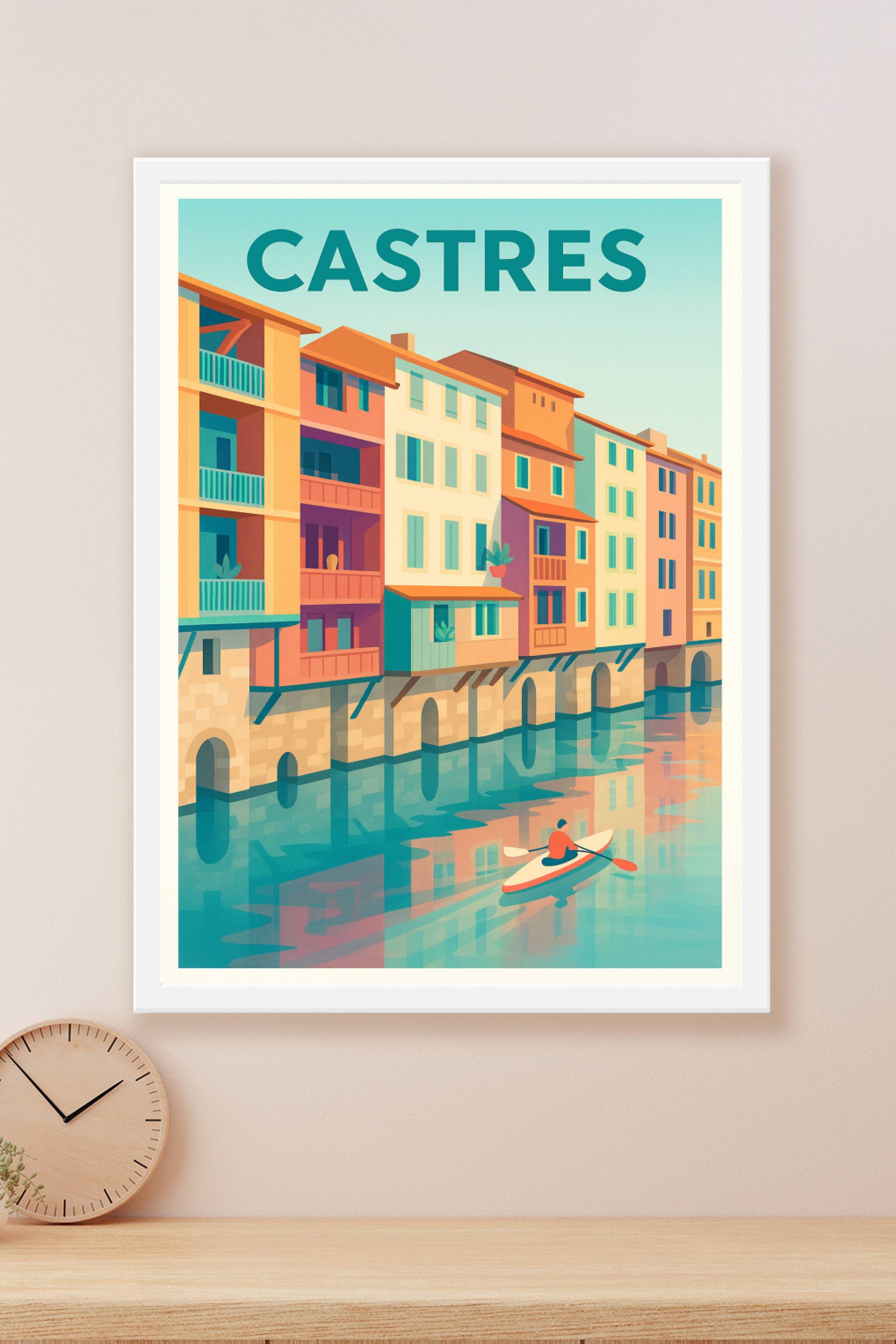 Découvrez l'atmosphère paisible de Castres avec cette affiche illustrée mettant en scène ses façades colorées au bord de l'eau et un kayak glissant...