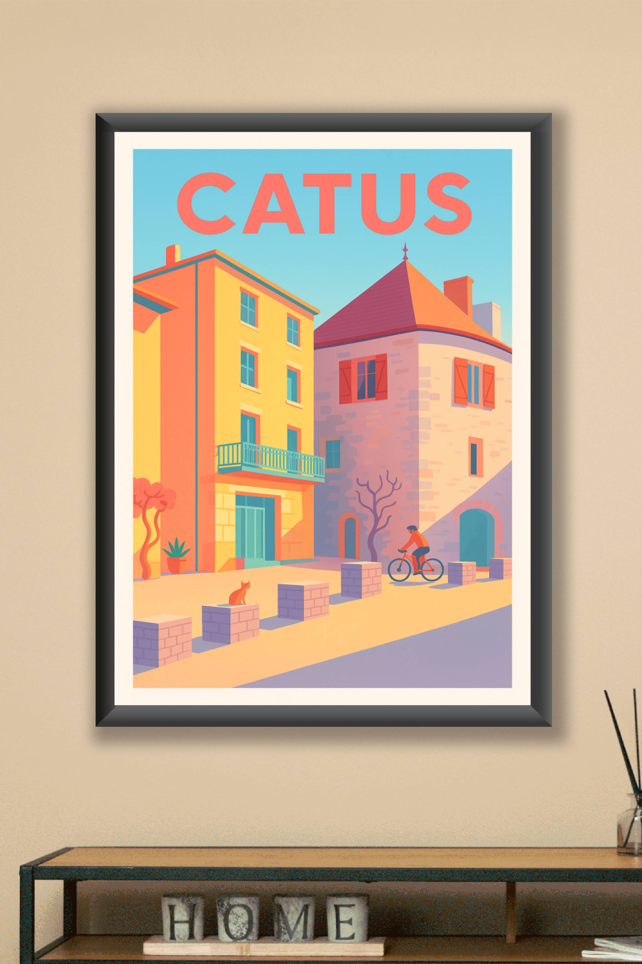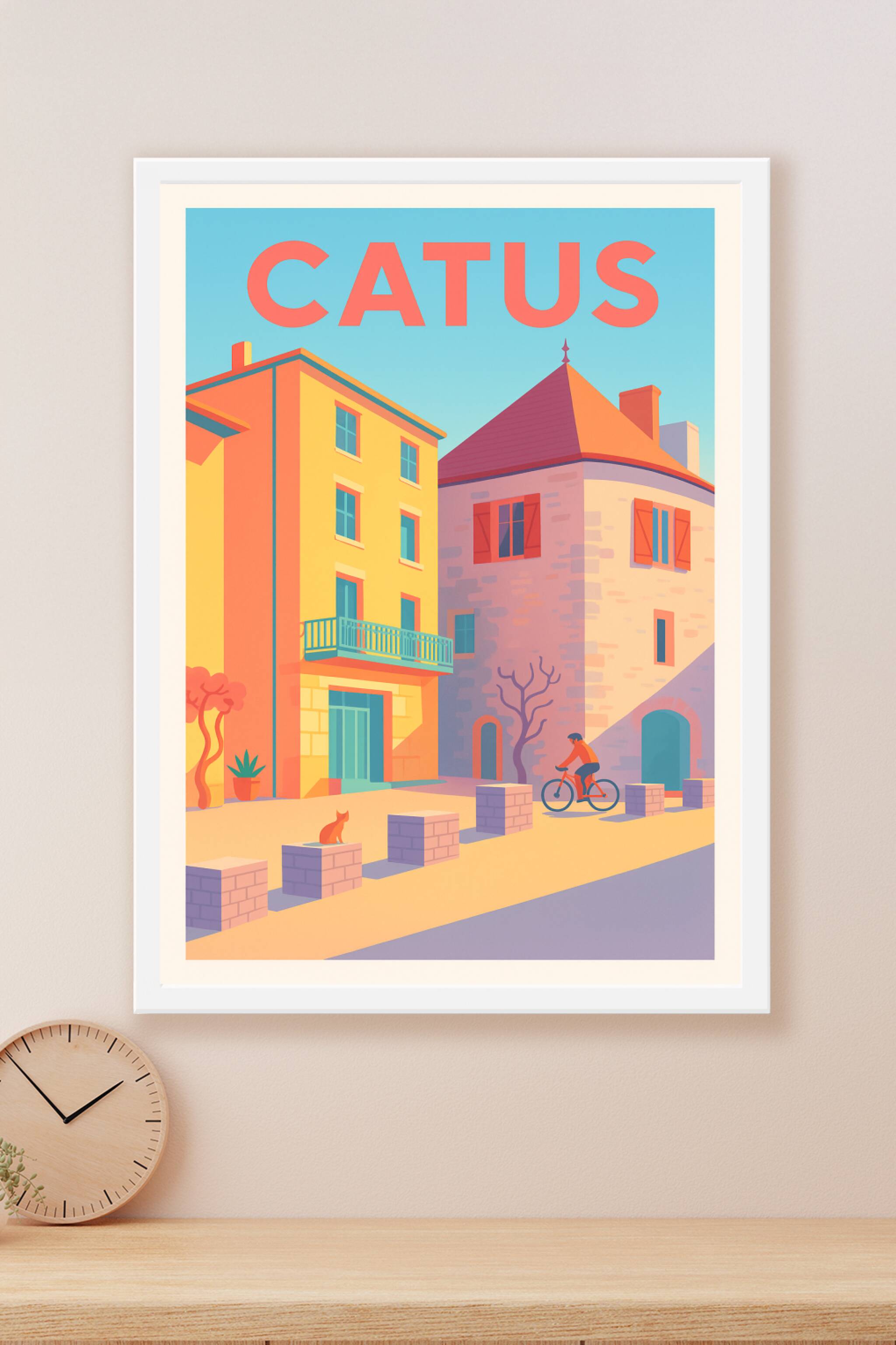 Découvrez le charme unique de Catus avec cette affiche illustrée qui capture l'ambiance lumineuse et chaleureuse du village. La douce palette de co...