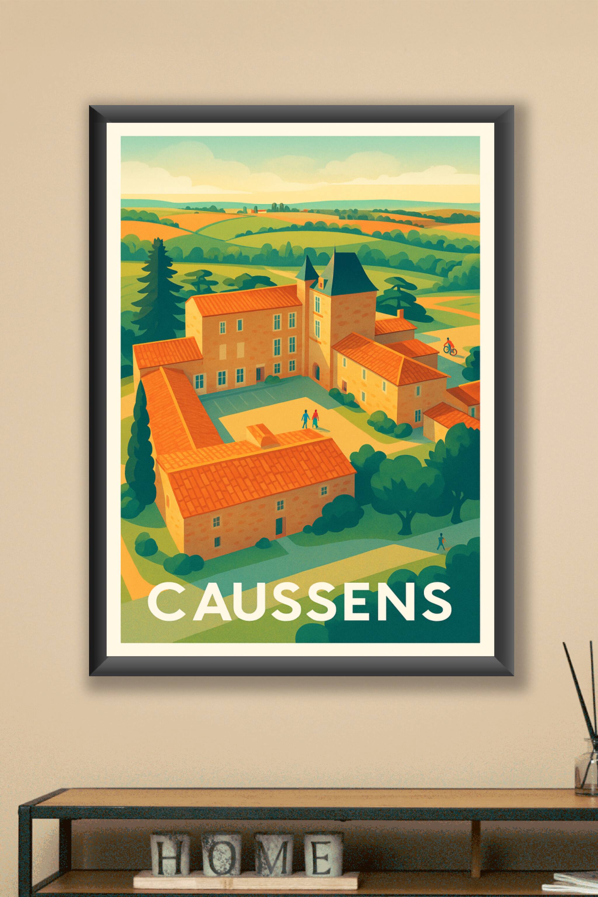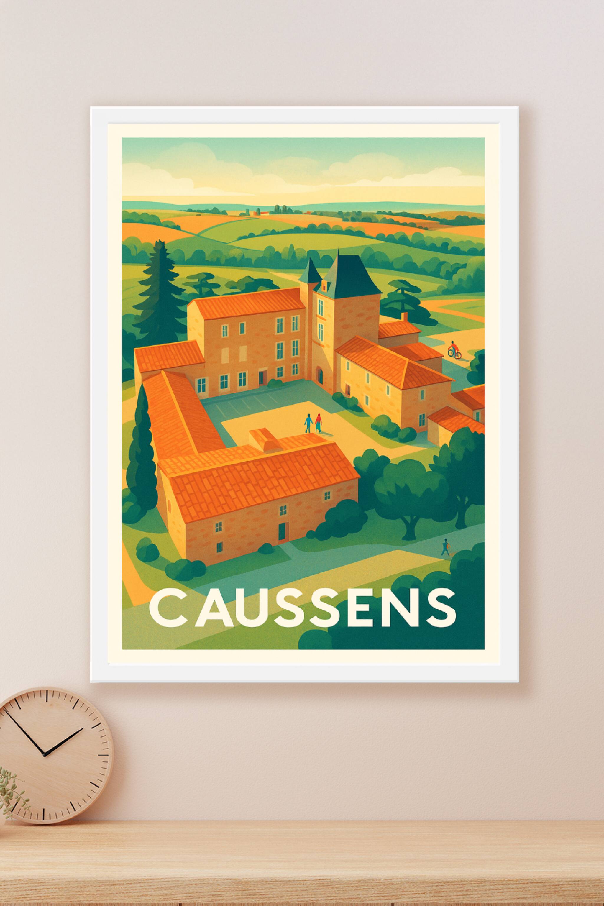 Découvrez la douceur de vivre à Caussens avec cette affiche illustrée qui met en lumière l'architecture traditionnelle et les paysages vallonnés de...