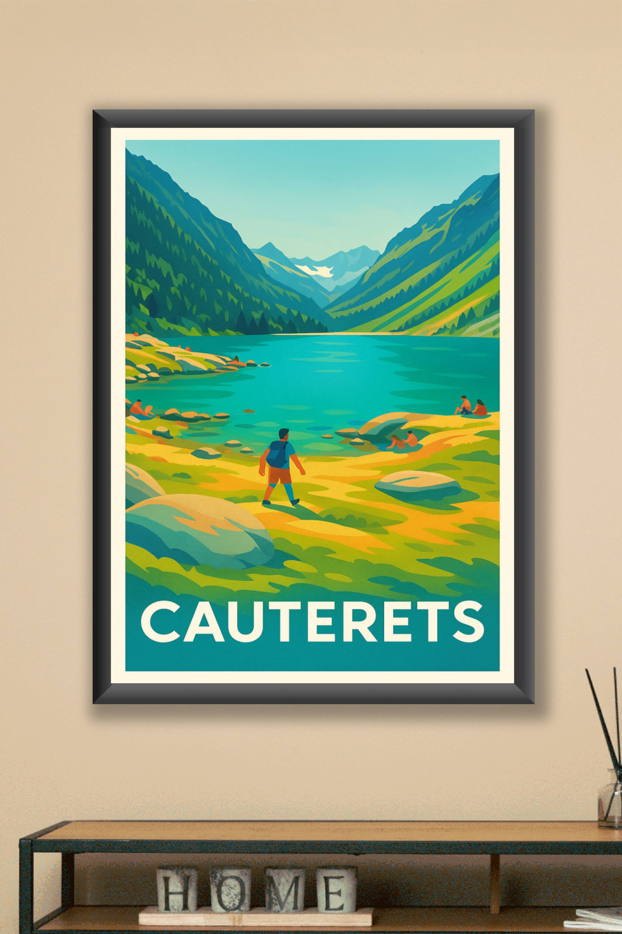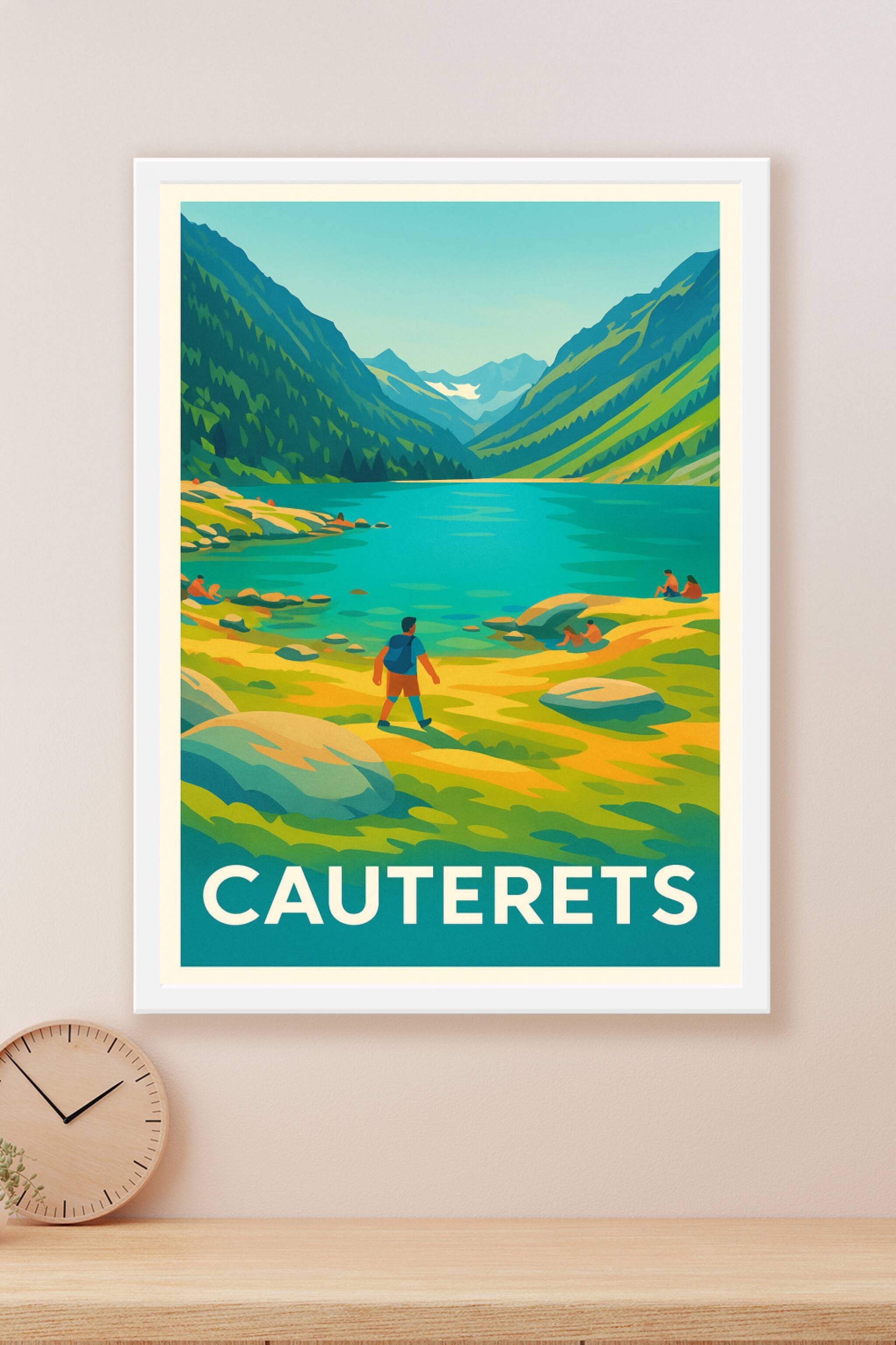 Découvrez la beauté naturelle de Cauterets avec cette affiche au style vintage inspirant l’aventure et la sérénité. Ce poster illustre un paysage d...