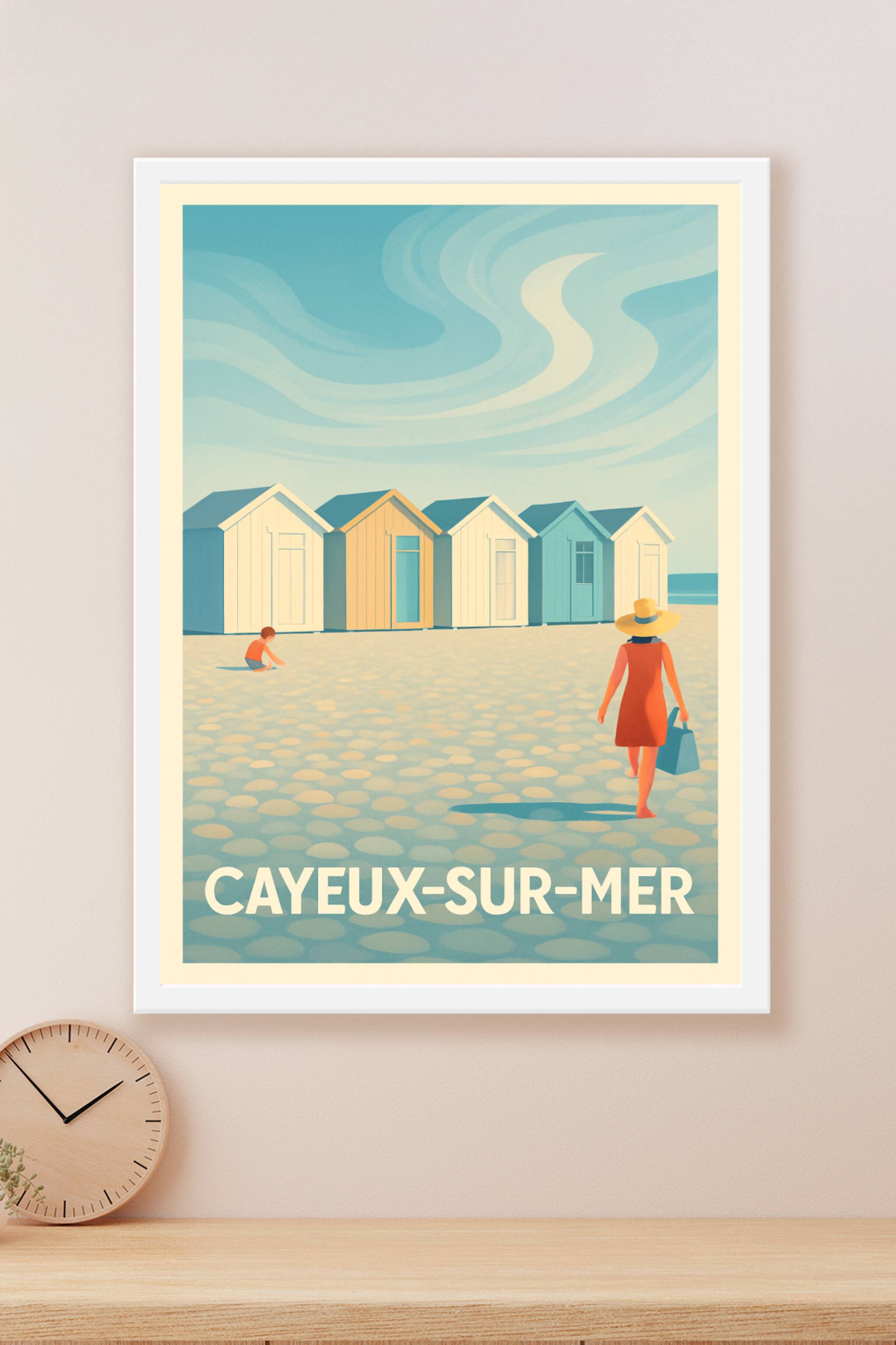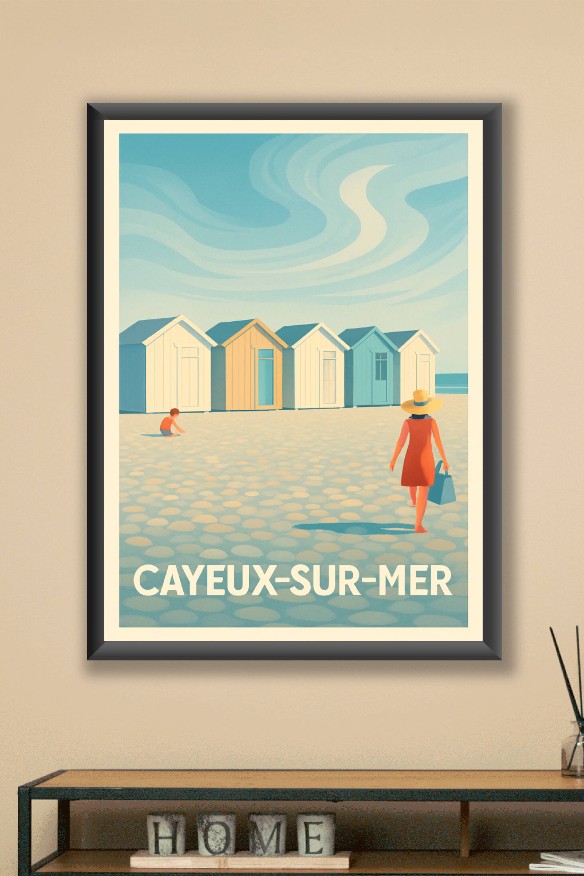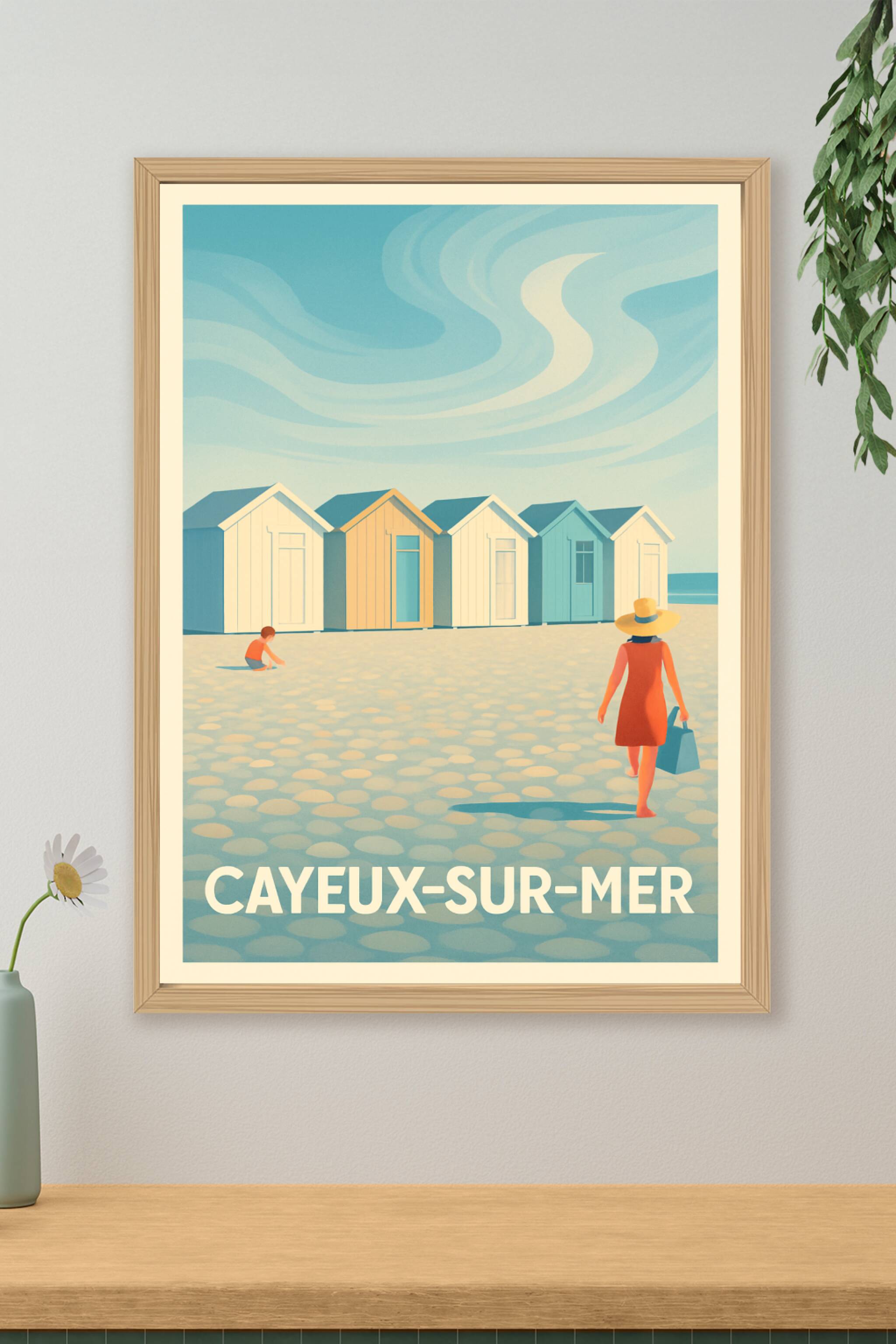 Découvrez le charme intemporel de Cayeux-sur-Mer avec cette affiche au style vintage qui capture la douceur d'une promenade sur la plage aux cabine...