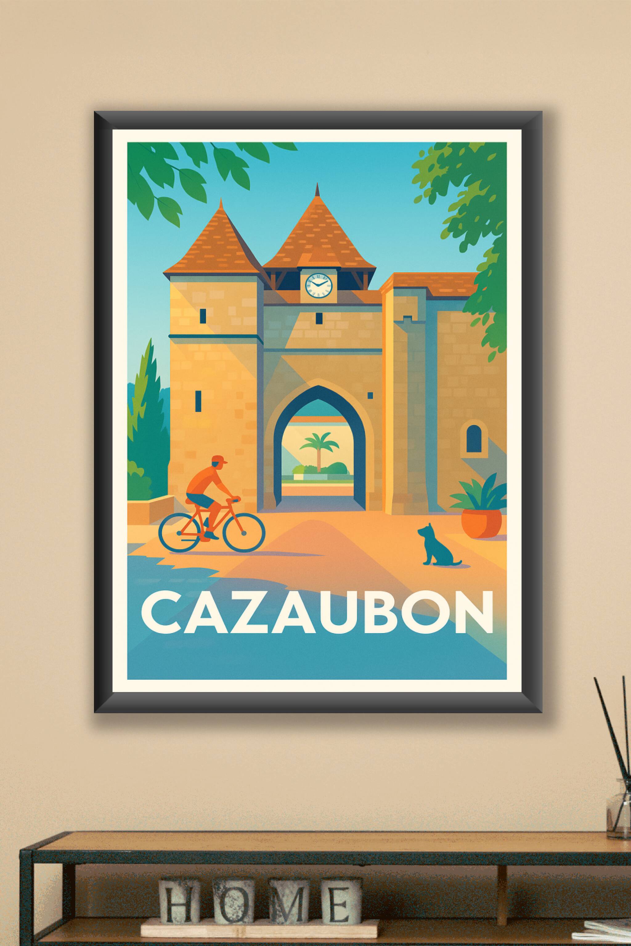 Découvrez la sérénité et le cachet historique de Cazaubon à travers cette affiche illustrée aux couleurs douces et chaleureuses. Le poster met en scène une entrée de ville typique aux deux tours monumentales, sublimée par la présence d'un cycliste et d'un chat, incarnant une atmosphère paisible et conviviale. Disponible en tirage Fine Art sur papier 305g coton pour une qualité d'impression exceptionnelle et des couleurs lumineuses, cette affiche unique est proposée en formats A1 à A4, avec ou sans cadre, pour s'adapter parfaitement à votre intérieur. Apportez une touche d'authenticité et d'élégance à votre décoration ou offrez un souvenir raffiné à tout amateur de patrimoine et de nature.